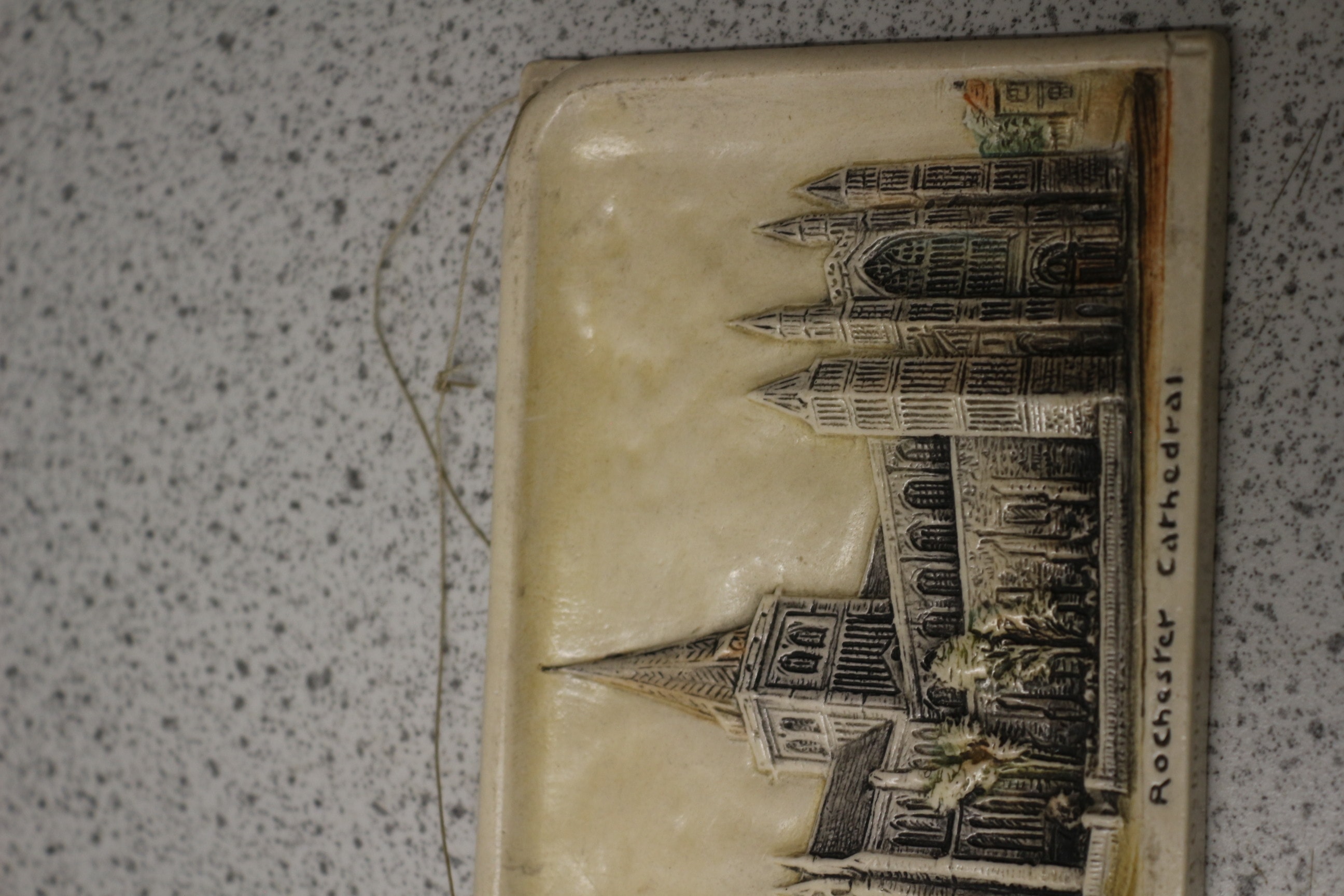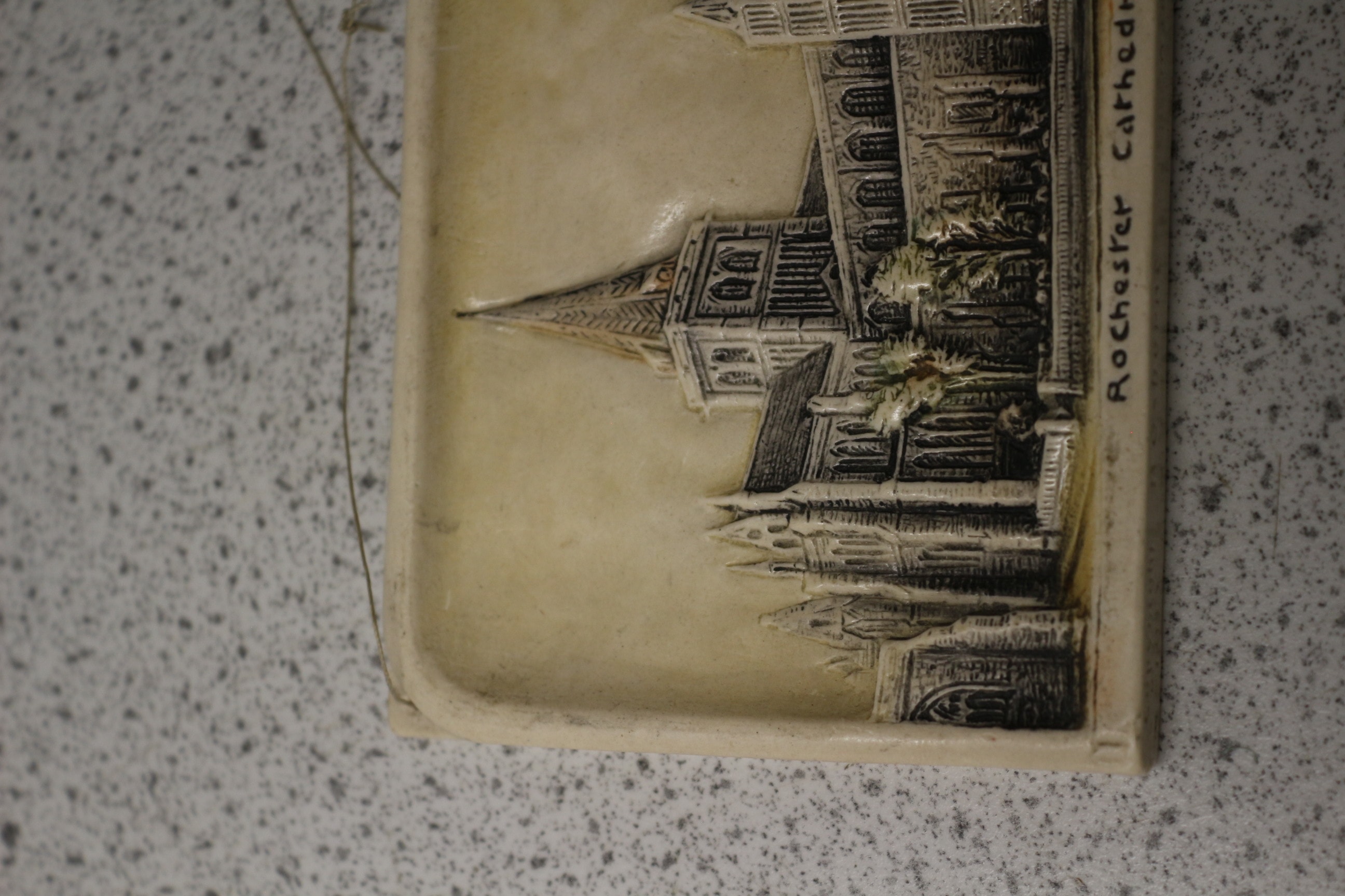 A rectangular decorative wall plaque, attributed to Bossons Ivorex, featuring a raised relief depiction of Rochester Cathedral. The plaque is crafted from a light beige, cast material, likely plaster or resin, with architectural details accentuated by darker painted lines and subtle colour washes. The text “Rochester Cathedral” is inscribed in a cursive style along the bottom edge of the relief. A thin, aged wire is affixed to the top for hanging. 9cm