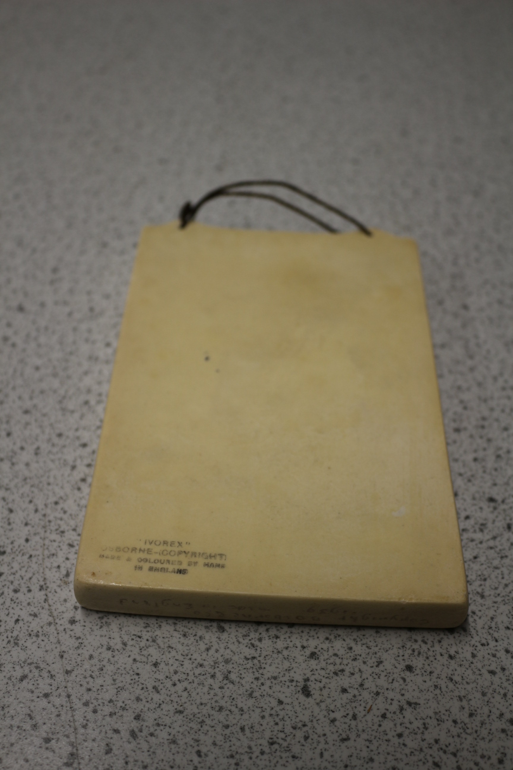 A Bossons Ivorex hand-painted relief wall plaque, dated 1959. Cast from a composition material, often referred to as chalkware, the rectangular plaque depicts a detailed and picturesque street scene identified as “Clovelly – High Street, ” leading down to a body of water with boats. The scene features multiple buildings, figures, and animals (donkeys or horses) rendered in a traditional, somewhat stylized manner. Visible markings on the front include “Copyright W.O.B. & Co. 1959 made in England.” On the reverse, the plaque is marked “IVOREX, ” “BOSSONS – (COPYRIGHT), ” and “MADE IN ENGLAND.” A braided cord is present for hanging. 16.5x11cm