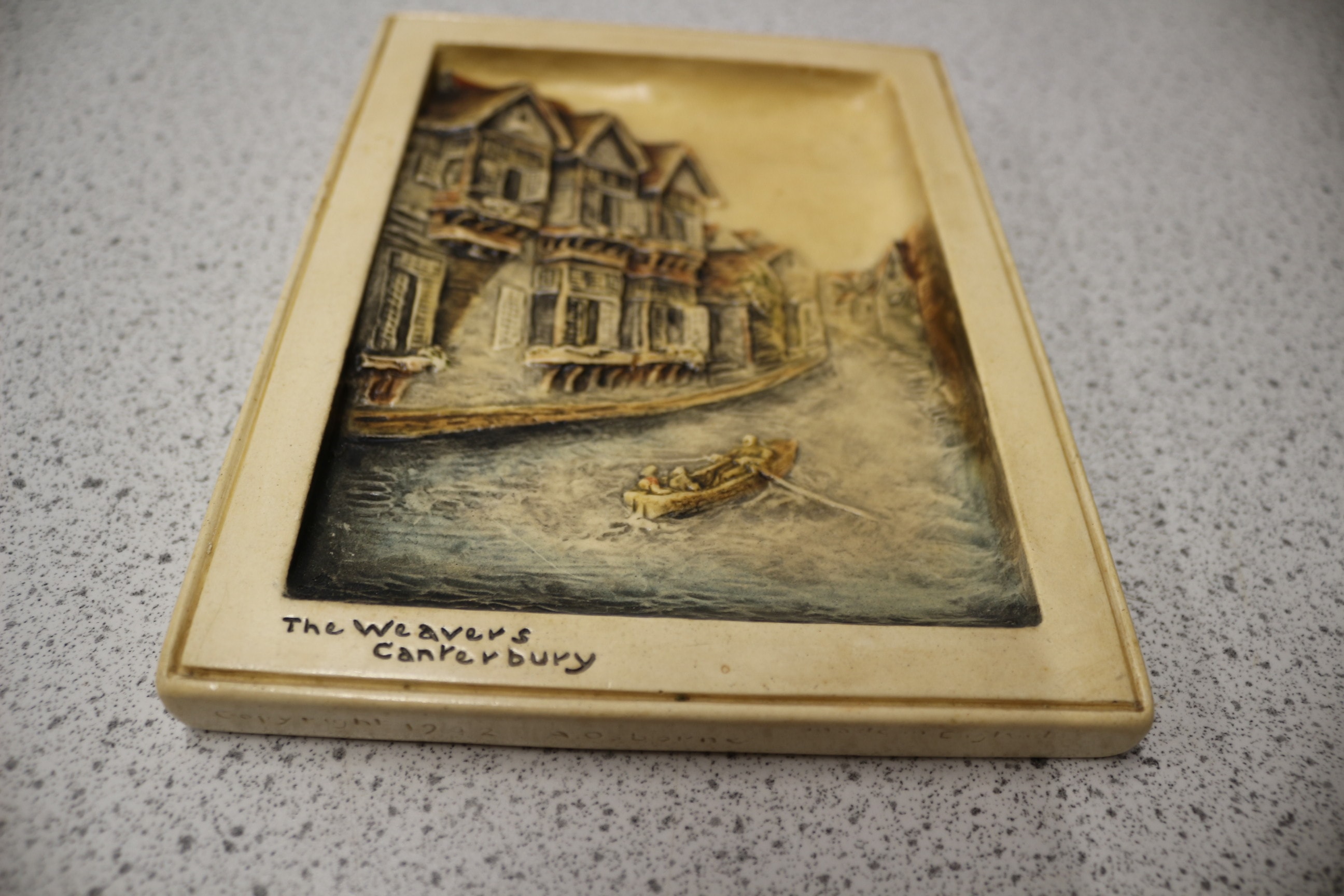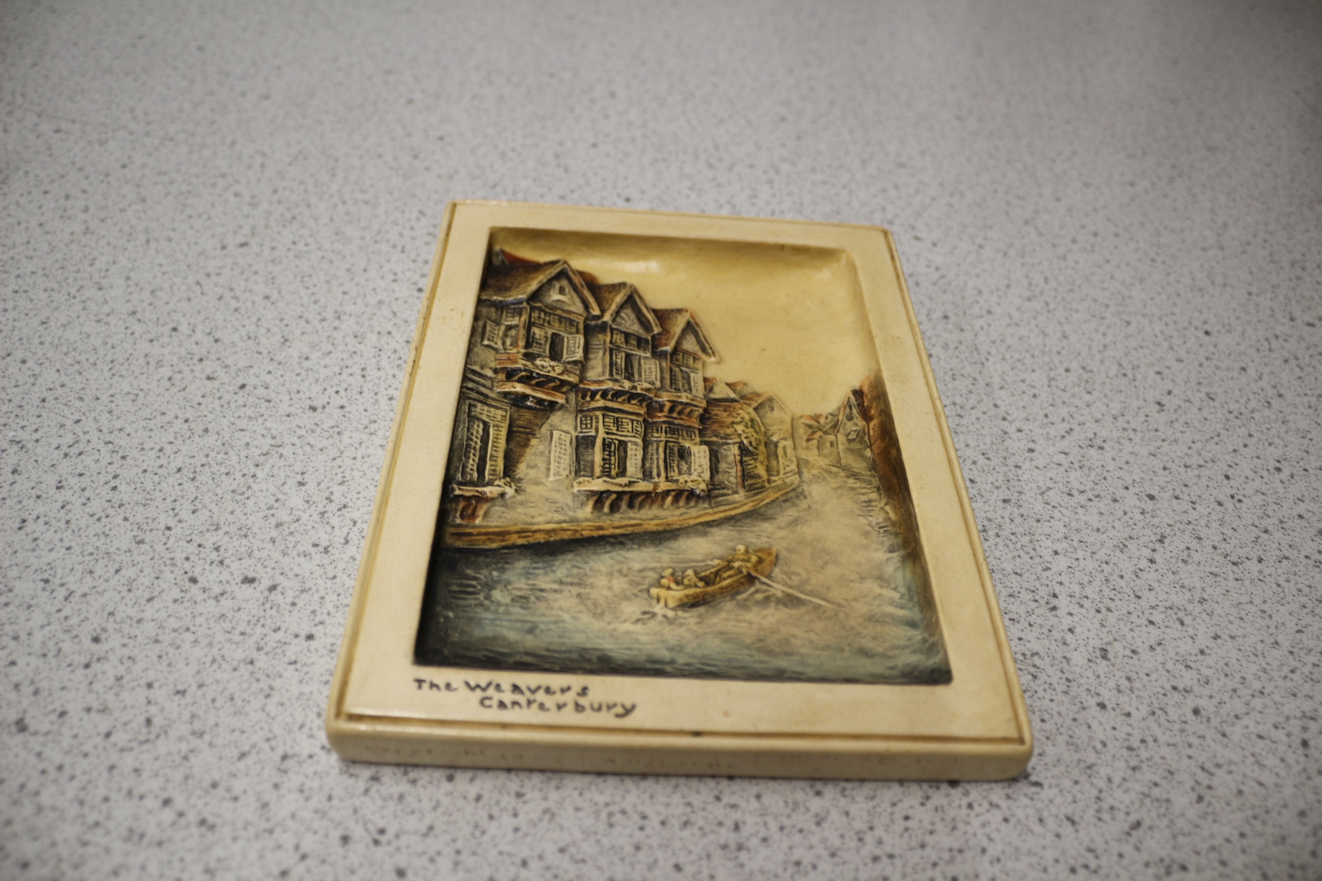 An Ivorex Osborne bas-relief wall plaque, depicting ‘The Weavers Canterbury’ as inscribed on the front. The rectangular plaque is crafted from an off-white molded composition material, identified as ‘Ivorex’ on the reverse. It features a three-dimensional scene of a picturesque European canal or river lined with half-timbered buildings, with a small boat containing a single figure in the foreground. Hand-painted details enhance the relief. The reverse is marked “OSBORNE-COPYRIGHT” and “MADE IN ENGLAND”, and includes a simple string for hanging. 20x15cm