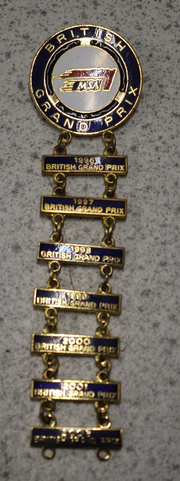 A commemorative British Grand Prix year bar badge, comprising a central circular medallion with a series of seven rectangular year bars attached below. The badge is constructed from gold-tone metal with dark blue and white enamel inlay. The main circular badge is inscribed “BRITISH GRAND PRIX” around its perimeter and features a central logo depicting a stylized racing element identifying “MSA” and a numeral. Each subsequent rectangular bar, linked by small rings, is inscribed with a specific year followed by “BRITISH GRAND PRIX, ” with visible dates ranging from 1996 to 2001, and a partially visible 2003. The reverse of the top medallion is marked “MADE IN ENGLAND” and “MOTOR SPORTS ASSN. LTD., ” and features a standard safety pin clasp.