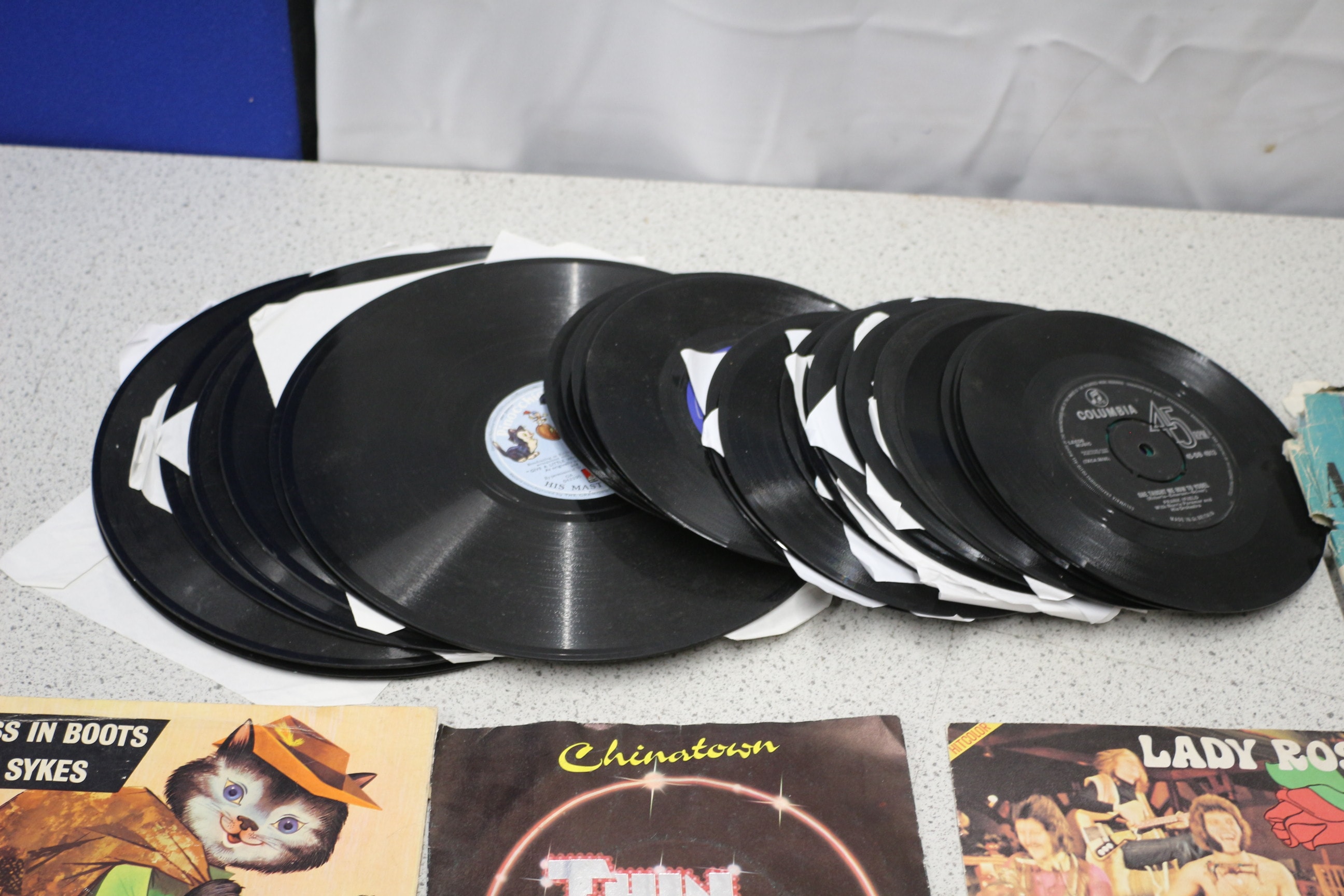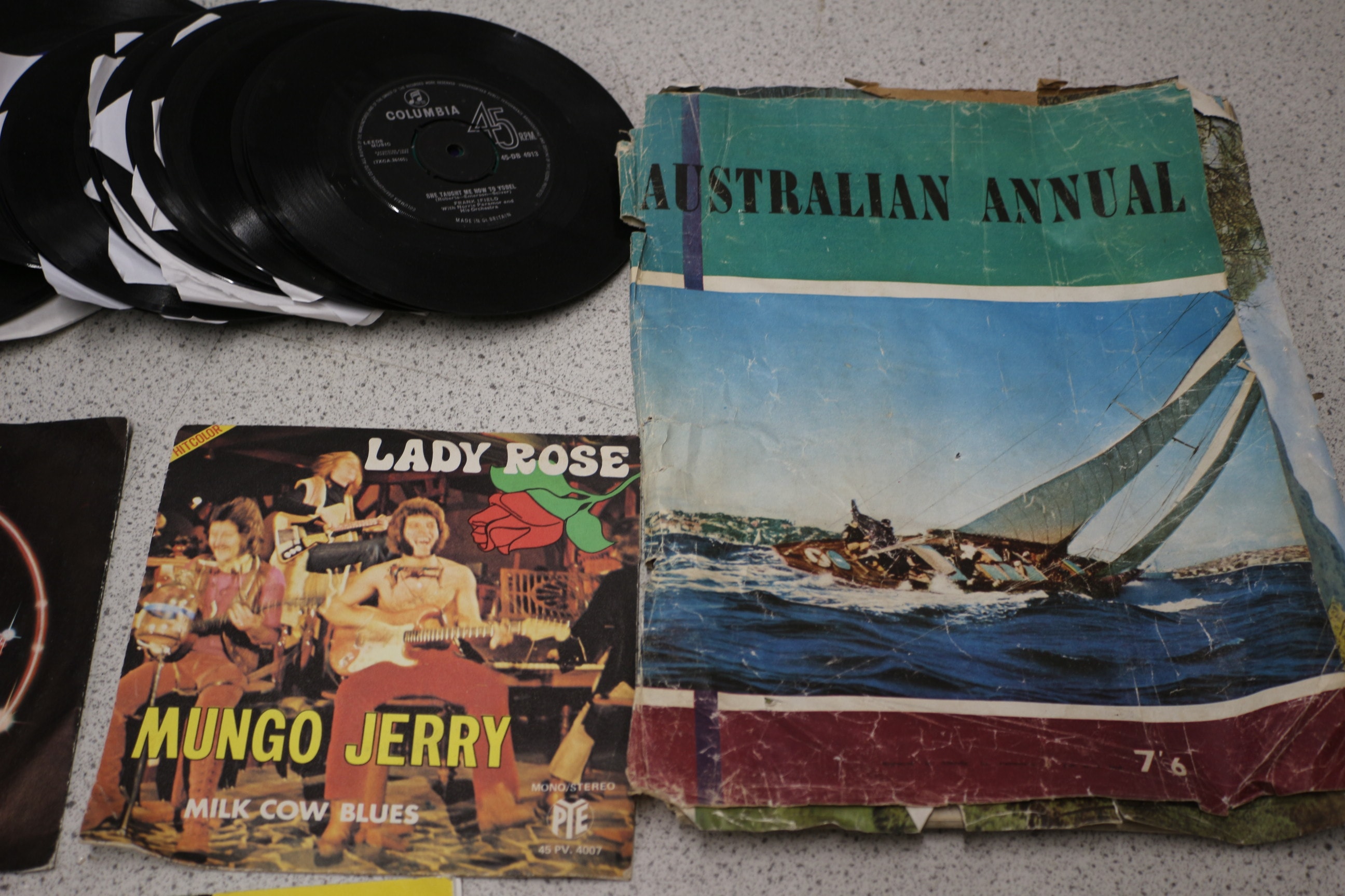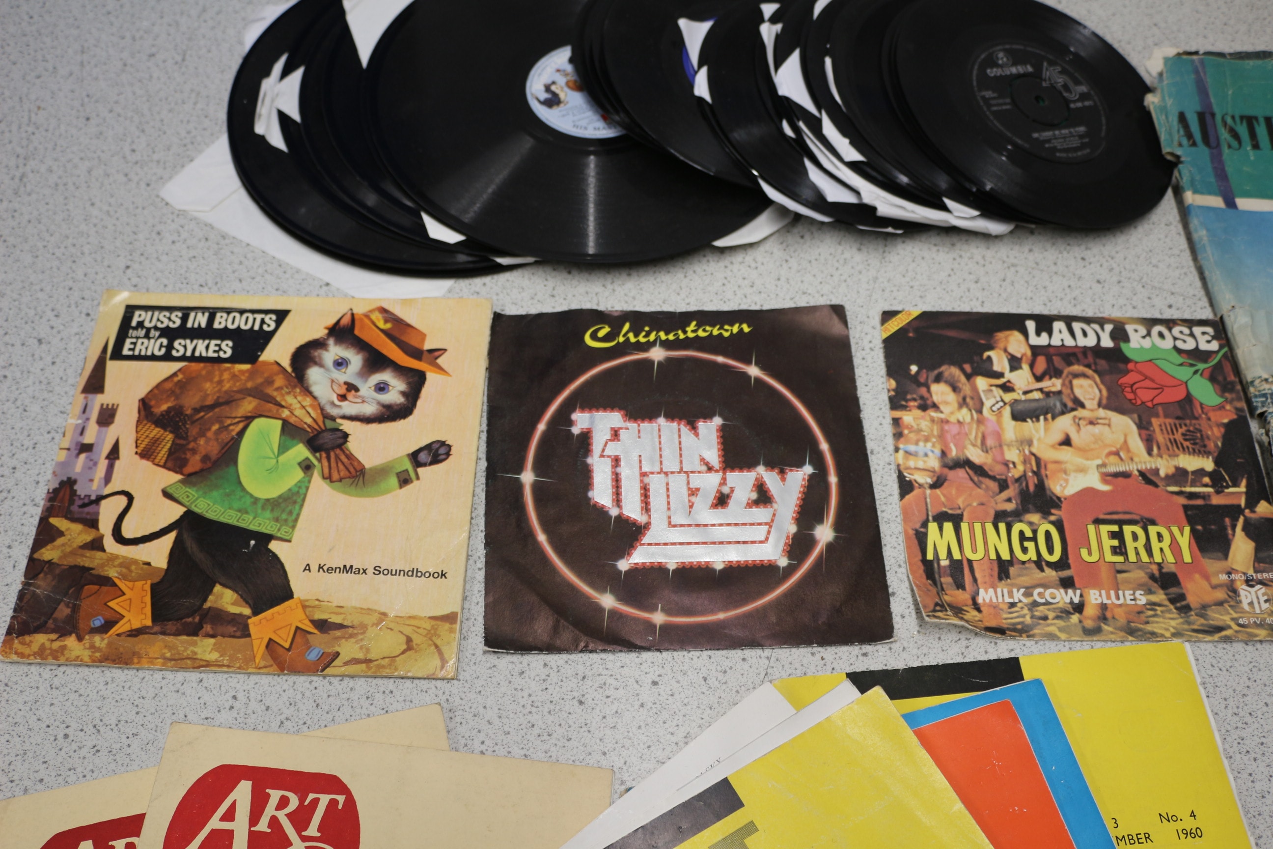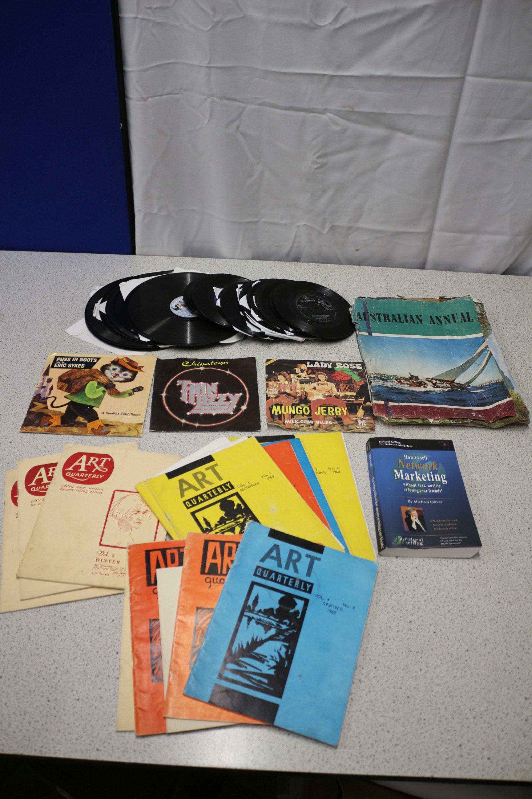 A diverse collection comprising a substantial stack of black vinyl phonograph records, including both LPs and 45s. Many records are housed in plain white paper sleeves, while others feature pictorial sleeves for releases such as “PUSS IN BOOTS” by Eric Sykes, “Thin Lizzy” for “Chinatown, ” and “MUNGO JERRY” for “LADY ROSE” and “MILK COW BLUES.” One visible record label for “Columbia 45” indicates “MADE IN AUST.” The lot also includes several issues of “ART QUARTERLY” magazines, distinguished by different colored covers (yellow, orange, blue, cream) and spanning dates from at least “1960” to “SPRING 1965.” Additionally, a significantly aged “AUSTRALIAN ANNUAL” featuring a sailboat on its cover is present, alongside a more contemporary hardcover book titled “How to sell and do ‘Marketing’ without actually selling your friends!” by Michael Oliver, associated with “Enagic Kangen Water.”