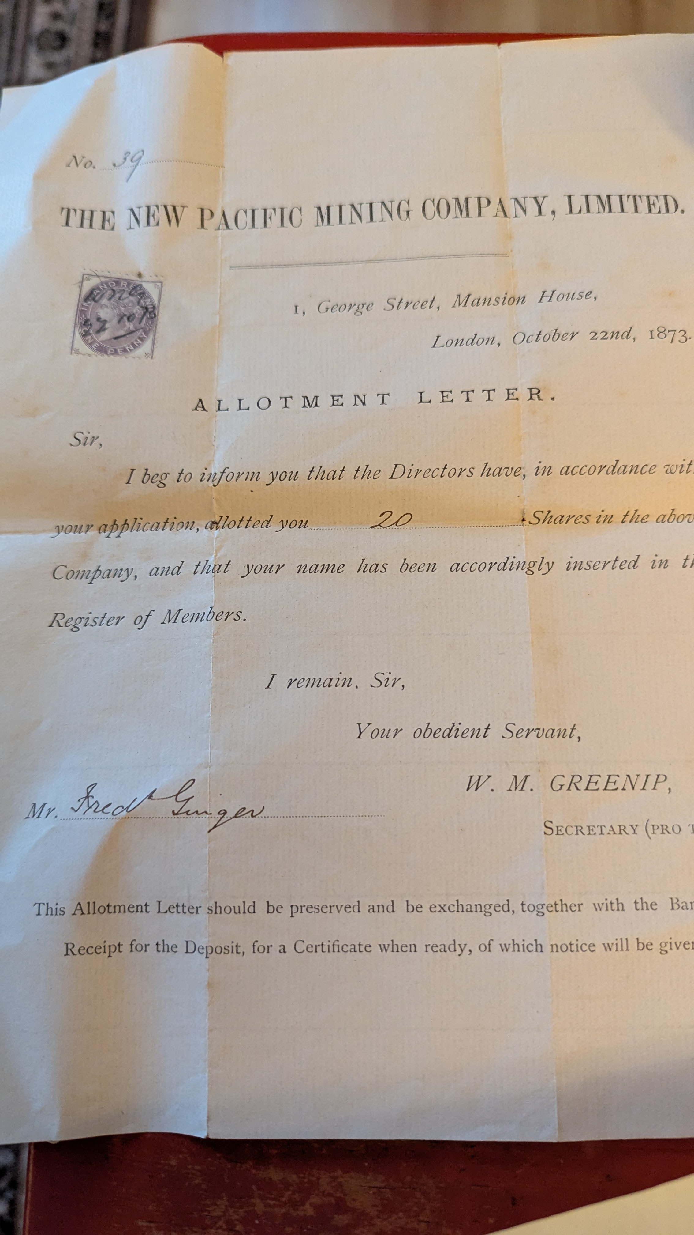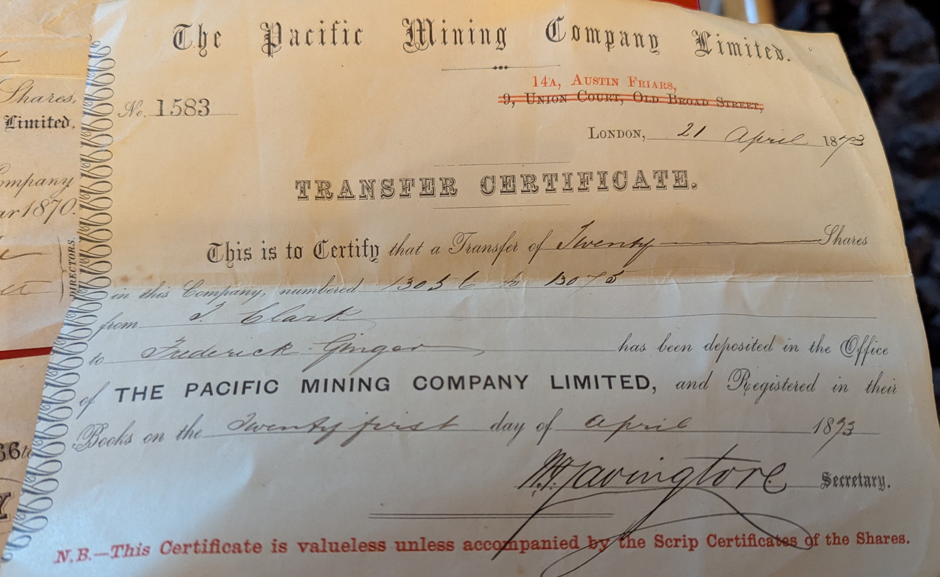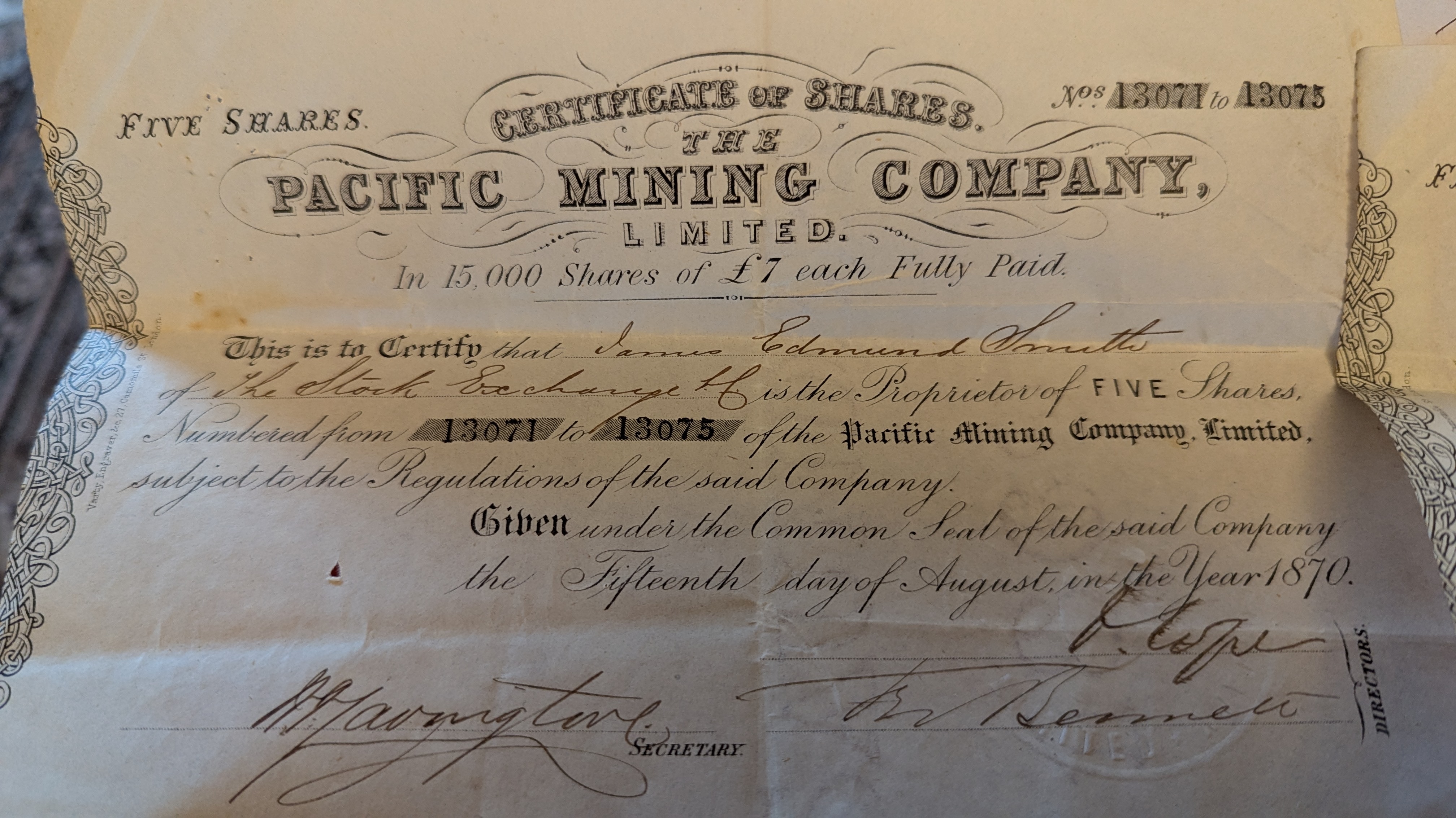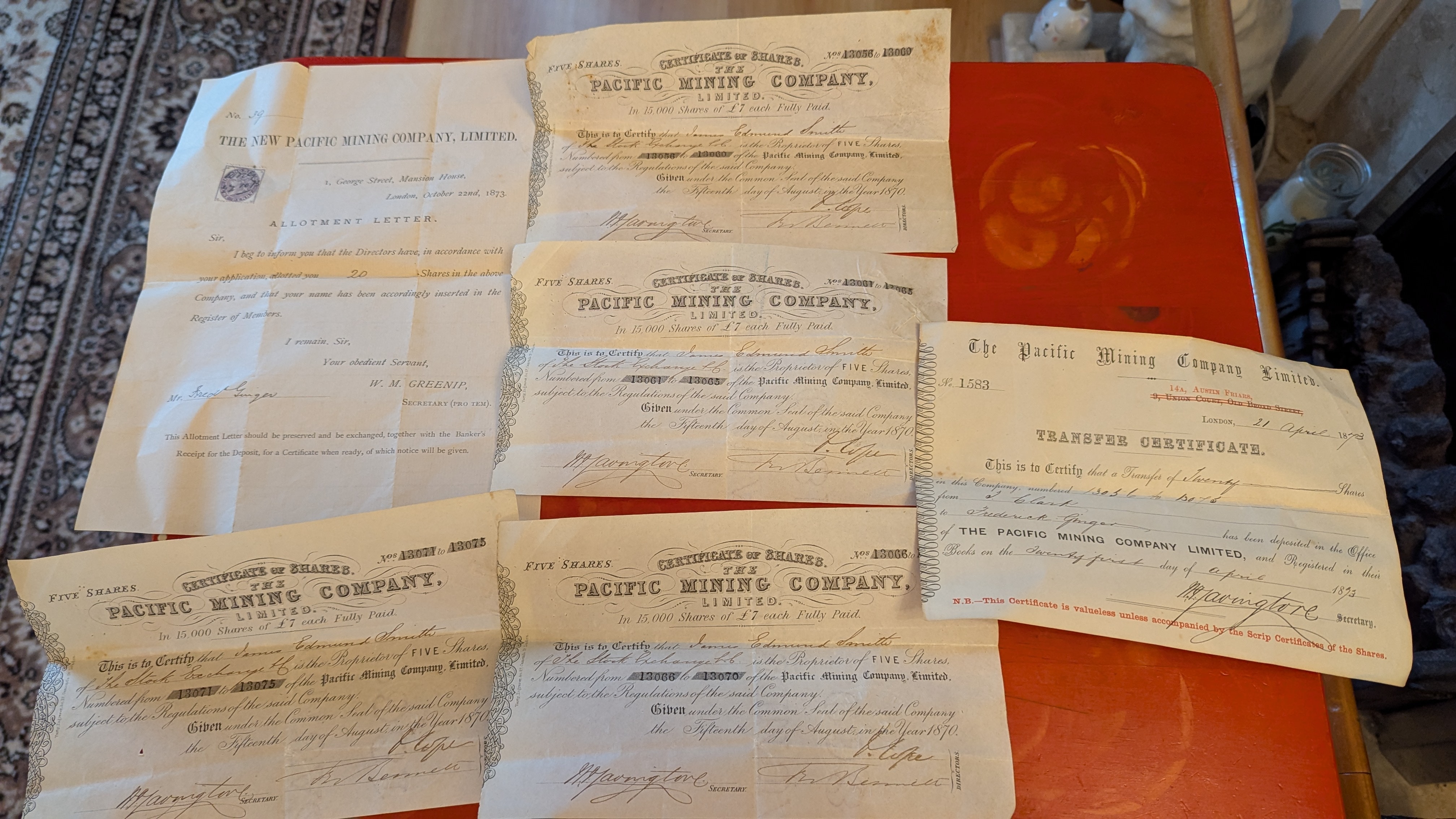 A collection of seven Victorian-era paper financial documents primarily from “The Pacific Mining Company, Limited” (also seen as “The New Pacific Mining Company, Limited”), dating from 1870 to 1873. The lot includes an “ALLOTMENT LETTER” dated October 22nd, 1873, allocating 20 shares to “Mr. Fred Ginger” and featuring a purple embossed stamp. Also present is a group of five “CERTIFICATE OF SHARES, ” each for “FIVE SHARES, ” dated August 15th, 1870, issued to “James Edmund Saville, ” and signed by “M. Javingtore” (Secretary) and two Directors. Completing the set is a “TRANSFER CERTIFICATE” dated April 21st, 1873, documenting a transfer of shares to “Frederick Ginger, ” which prominently features a red cautionary note indicating its valuelessness without accompanying scrip.