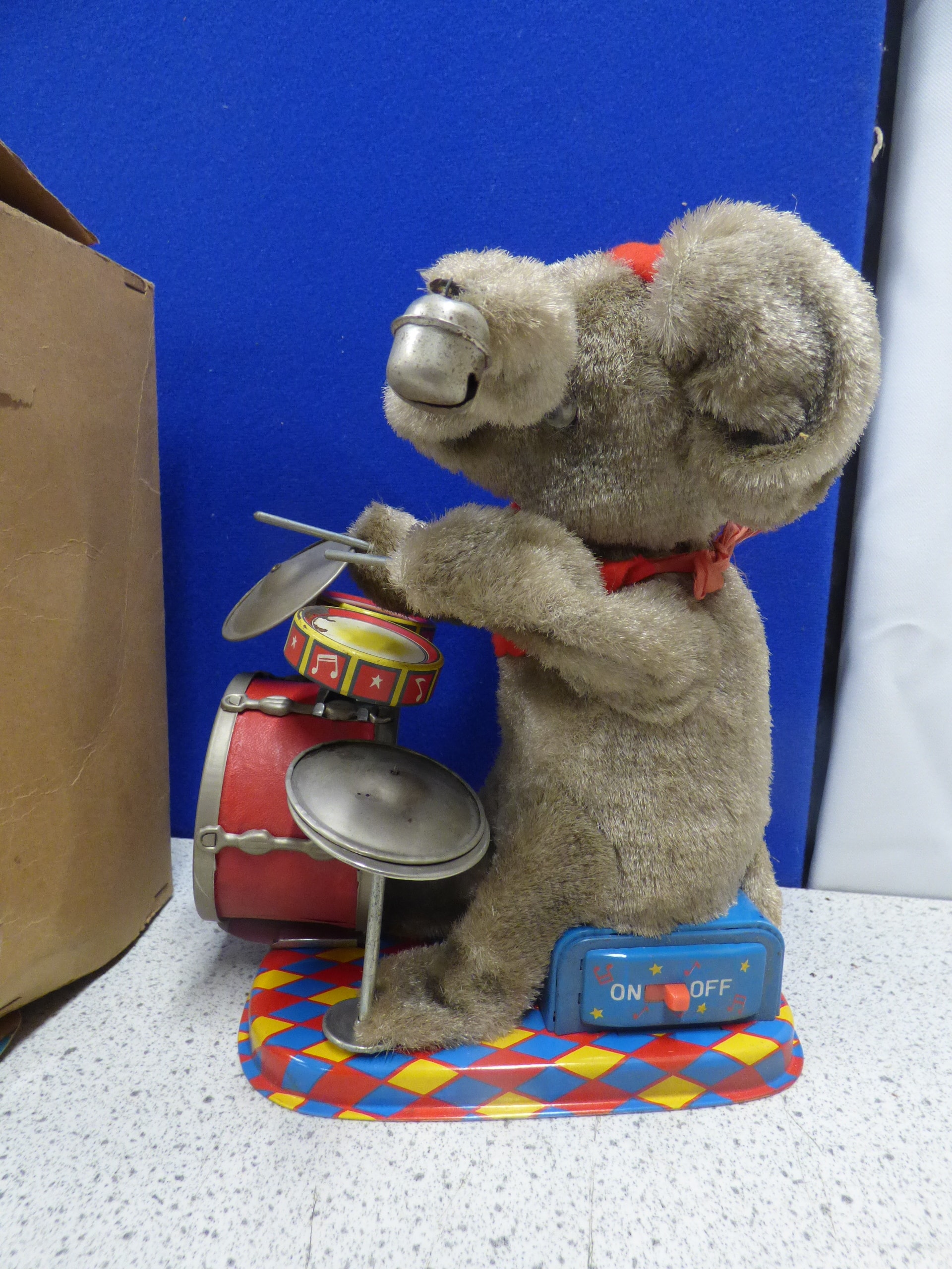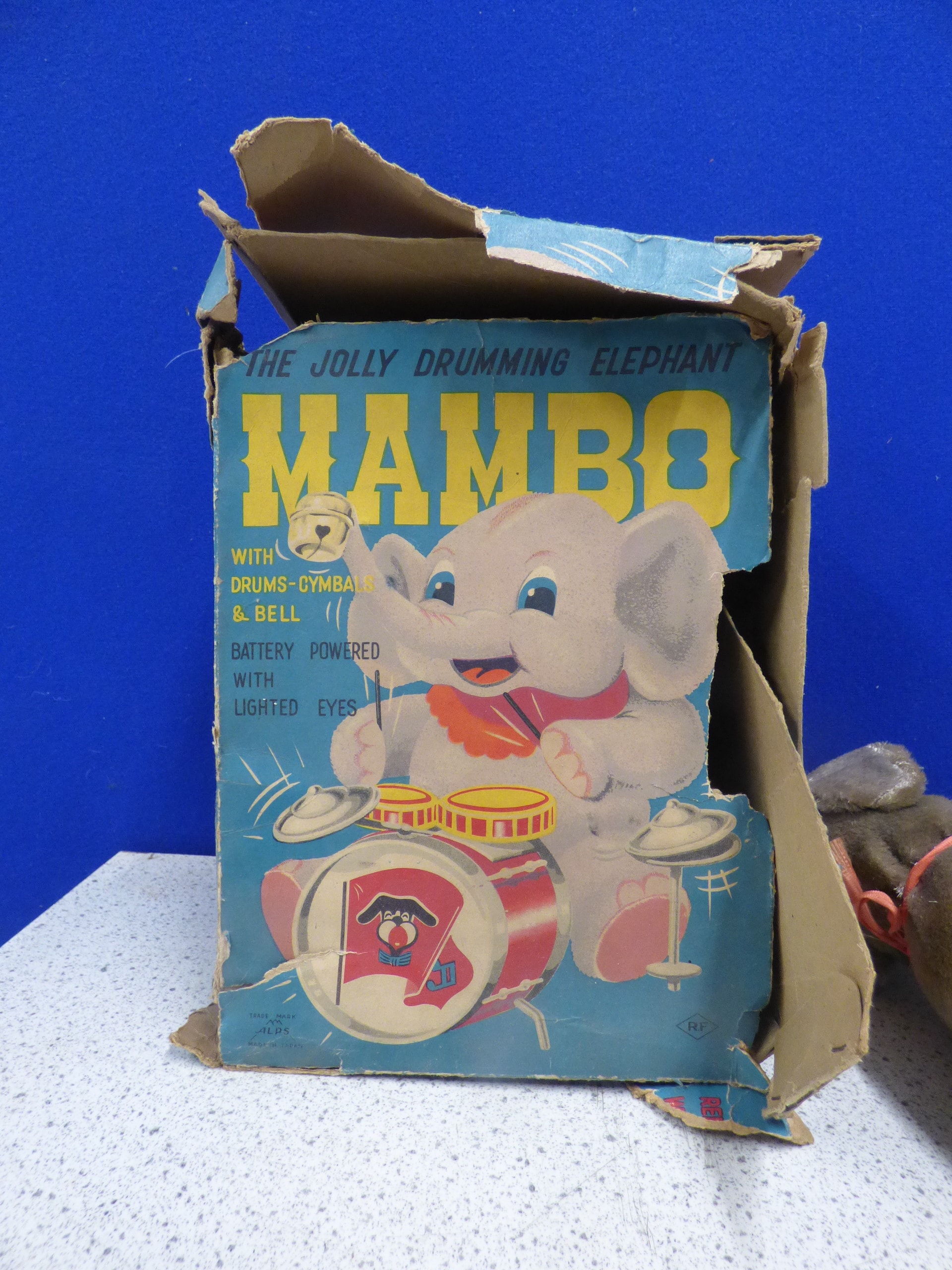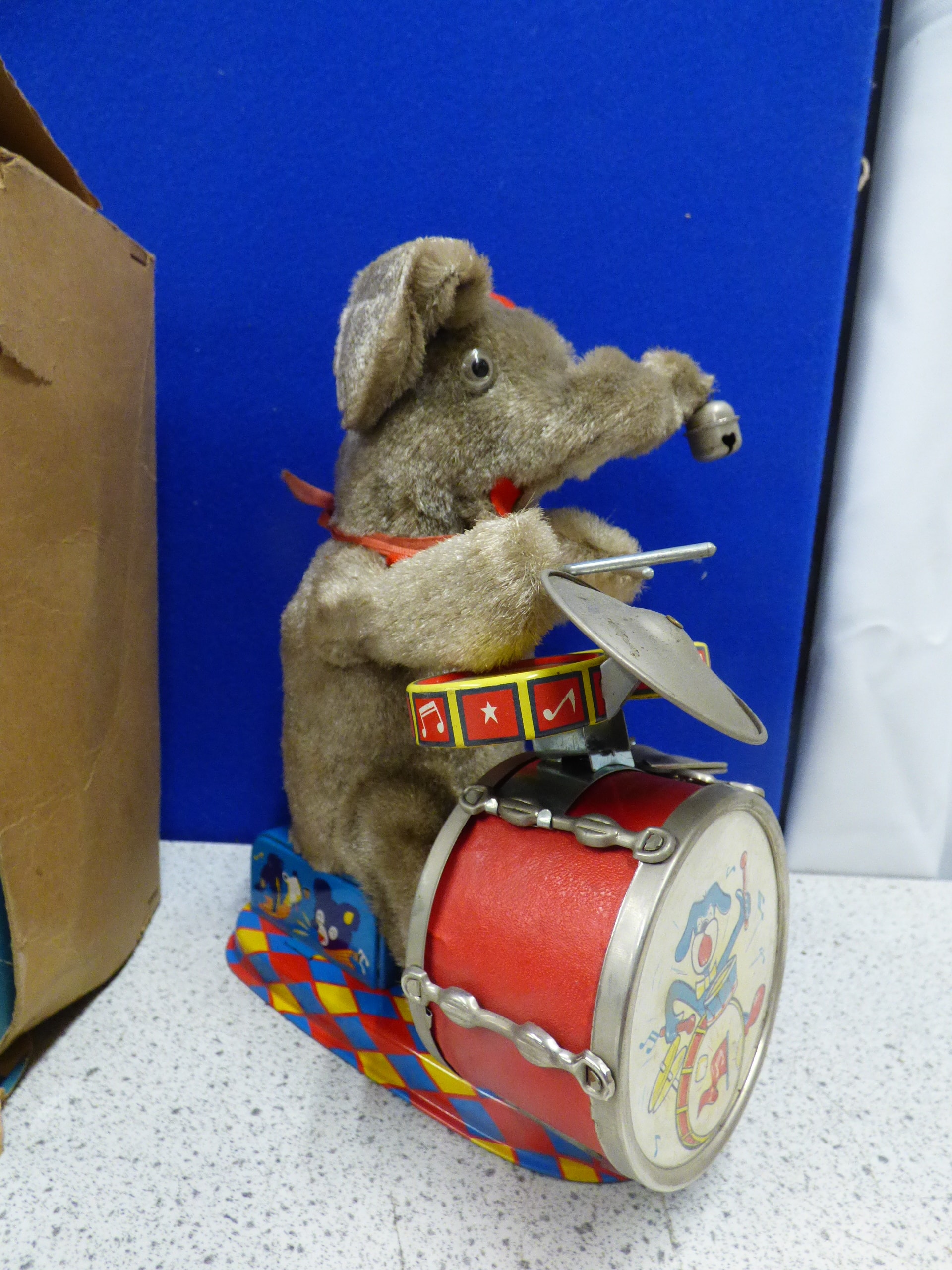 A grey plush elephant toy wearing a red hat and scarf, playing drums and cymbals on a multi-coloured base with an ‘ON OFF’ switch, accompanied by its original box labelled “THE JOLLY DRUMMING ELEPHANT MAMBO” and noted as “BATTERY POWERED WITH LIGHTED EYES”. Untested. Box AF