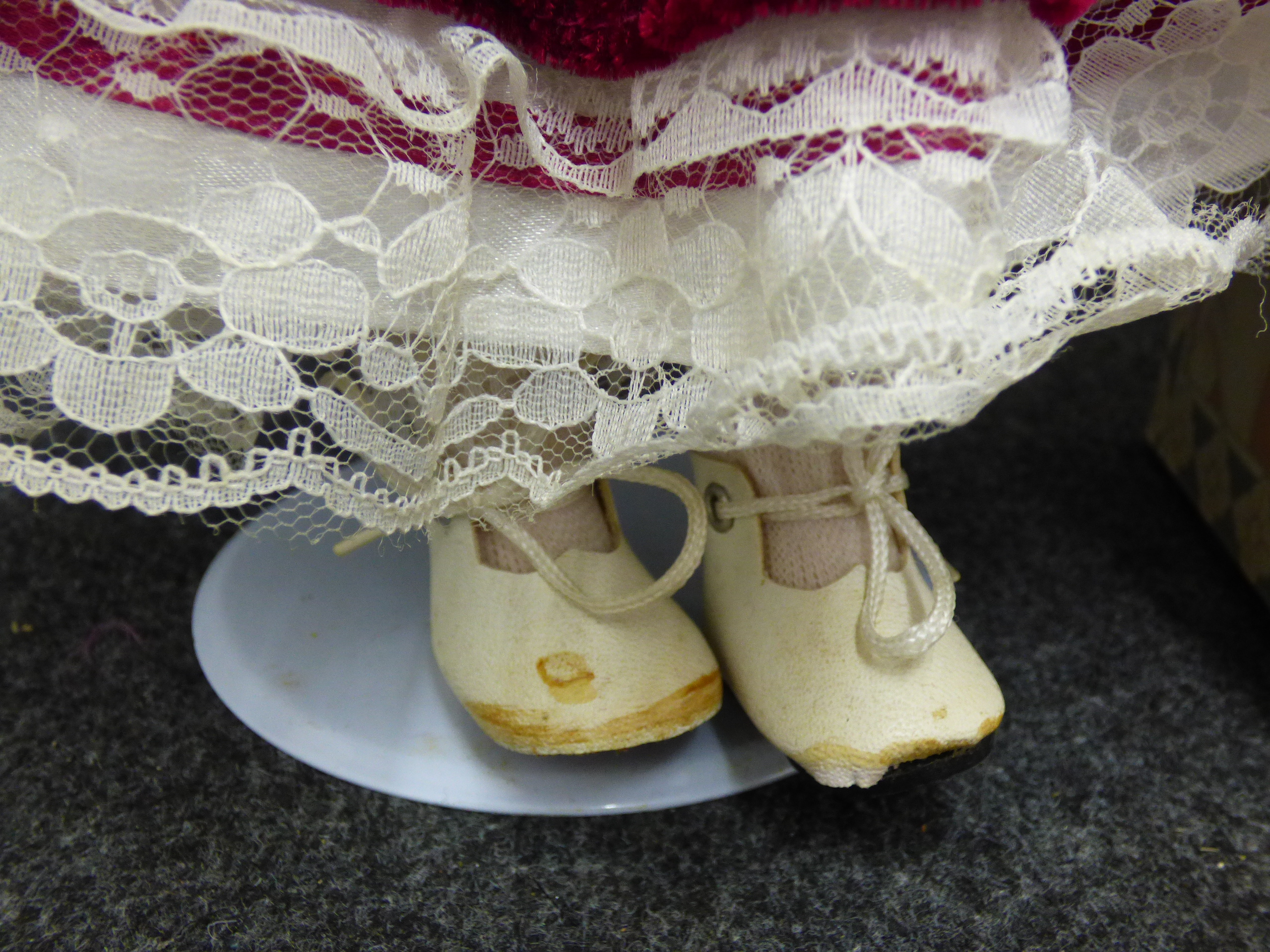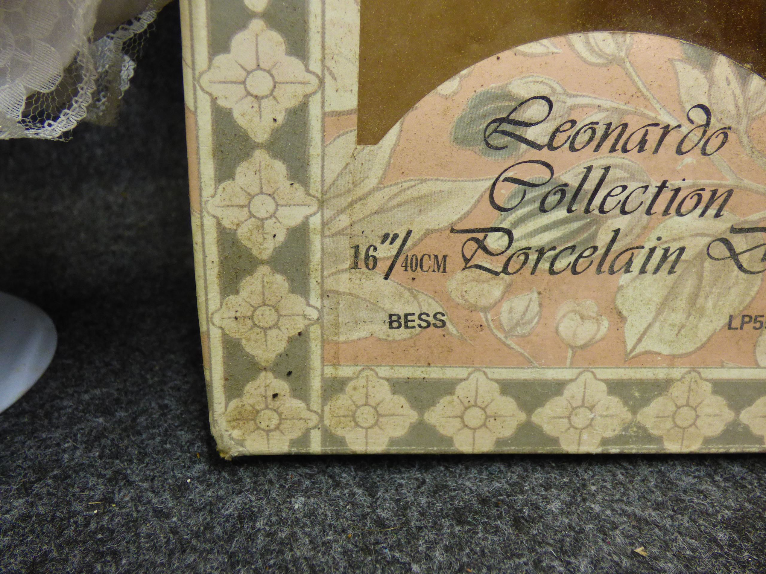 A porcelain doll named Bess wearing a maroon velvet and white lace outfit with spectacles and a hat, accompanied by its original decorative box. 40cm tall