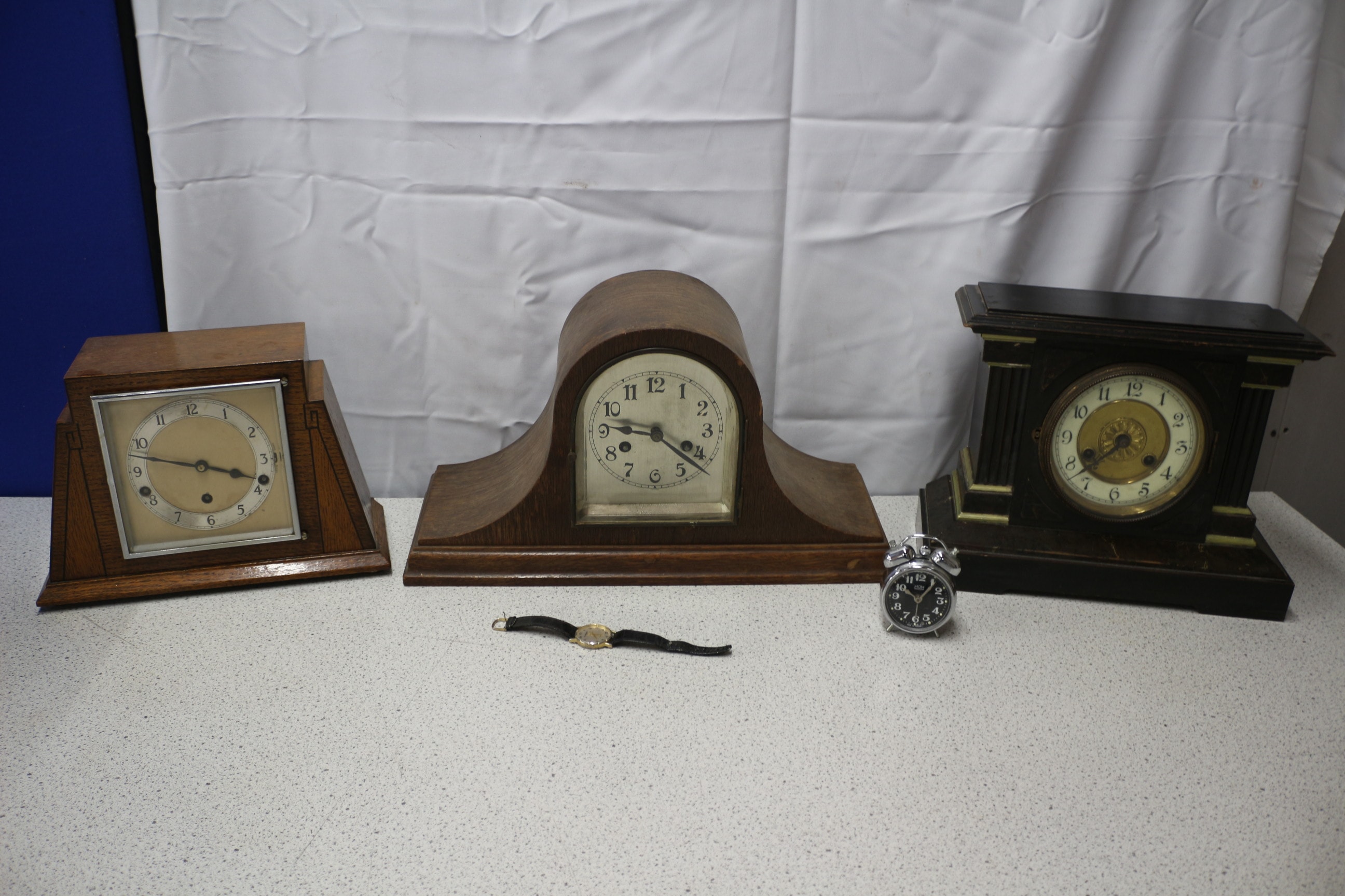 This lot contains five timepieces: three wooden mantel clocks (one light brown, one medium brown with “MANTEL CLOCK Made in USA” text, one dark wood/black), one silver alarm clock marked “MOM” and “Made in Hungary”, and one wristwatch with a black strap and gold-colored case marked “Penatech QUARTZ”.