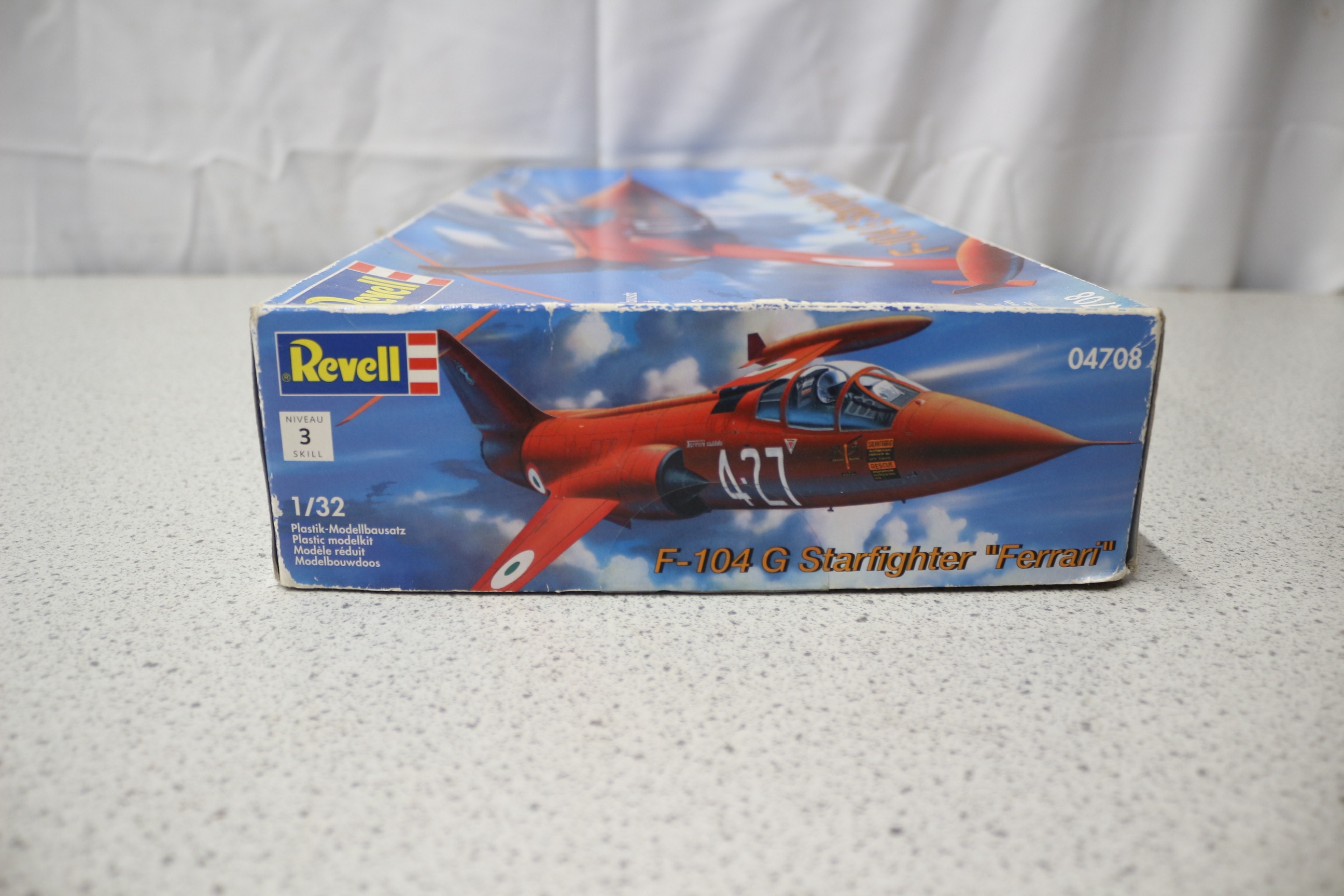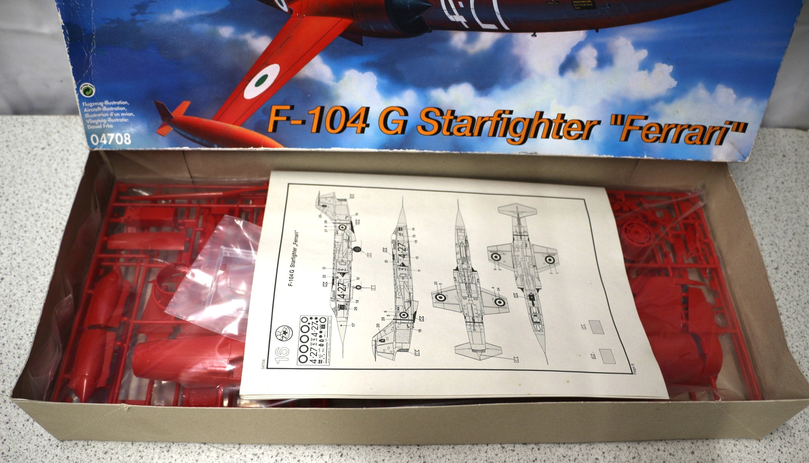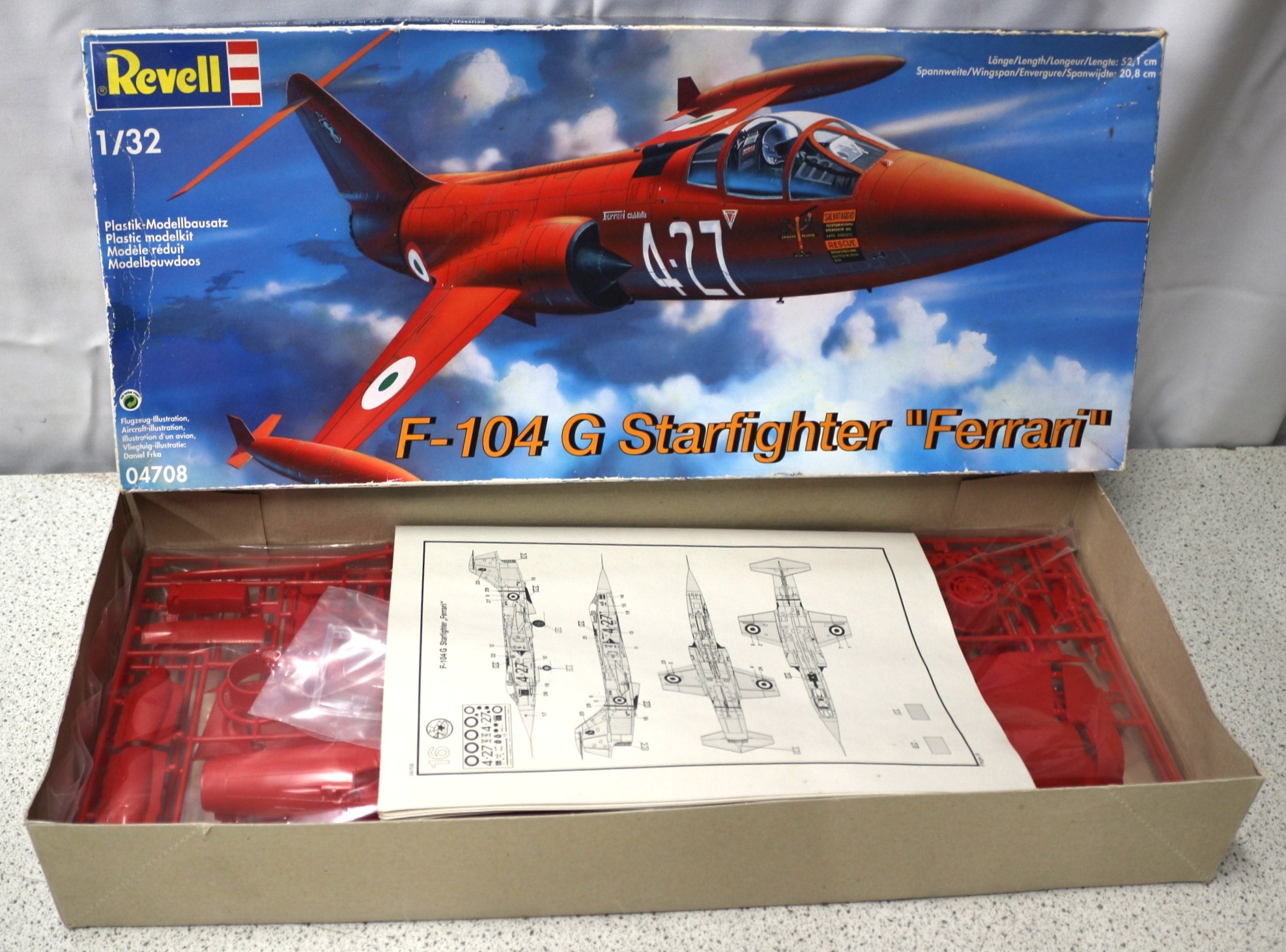 A Revell F-104 G Starfighter ‘Ferrari’ plastic model kit, model number 04708, 1/32 scale. The kit is presented in its original cardboard box, featuring an illustration of the red jet fighter by Daniel Zaka on the lid. It is identified as a "Plastik-Modellbausatz" (plastic model kit) and rated at skill level 3. Inside, the box contains unbuilt model components on sprues, molded in red plastic, along with a printed instruction manual featuring detailed diagrams.