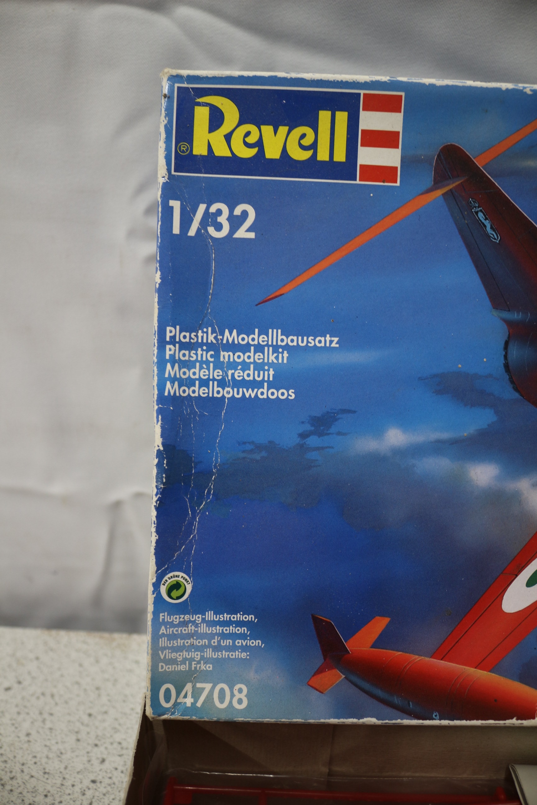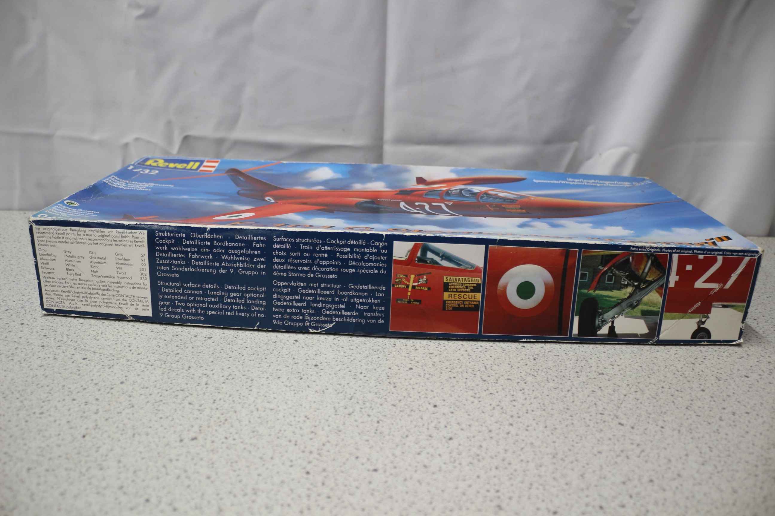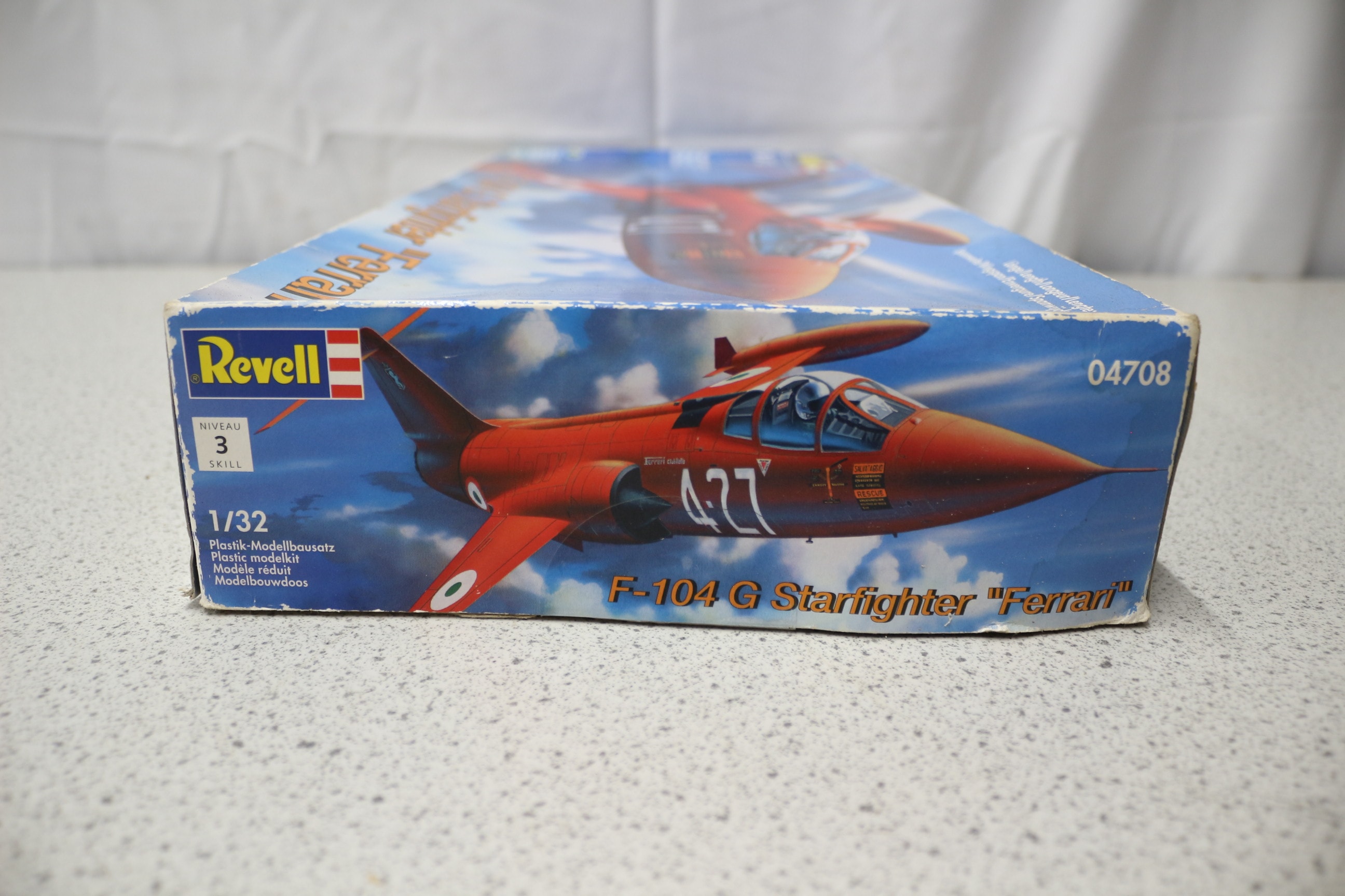 A Revell F-104 G Starfighter ‘Ferrari’ plastic model kit, model number 04708, 1/32 scale. The kit is presented in its original cardboard box, featuring an illustration of the red jet fighter by Daniel Zaka on the lid. It is identified as a "Plastik-Modellbausatz" (plastic model kit) and rated at skill level 3. Inside, the box contains unbuilt model components on sprues, molded in red plastic, along with a printed instruction manual featuring detailed diagrams.