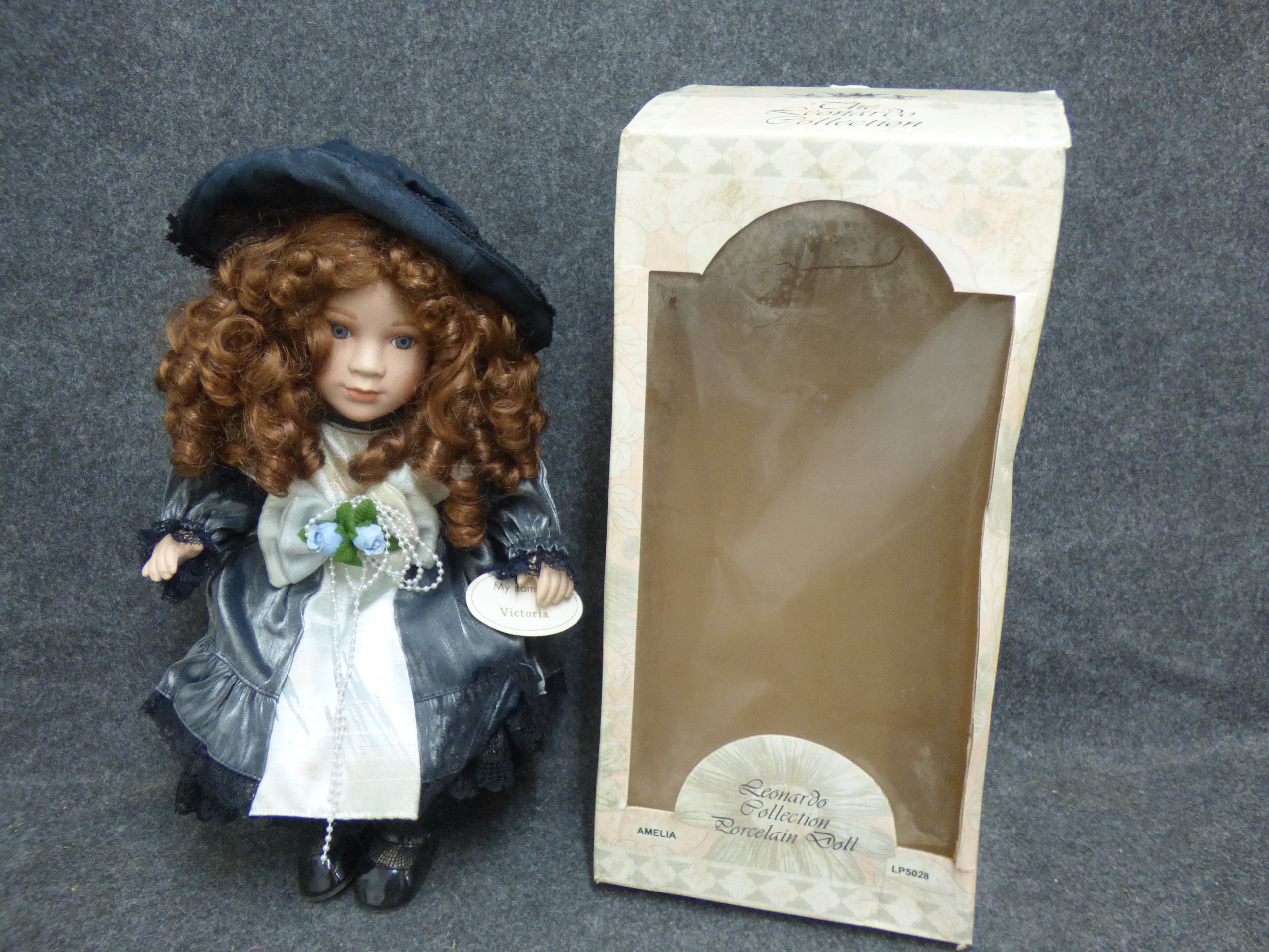 A porcelain doll named Amelia from The Leonardo Collection featuring auburn curls and blue eyes, dressed in a grey and white Victorian-style outfit with a matching hat. Not in original box, no stand