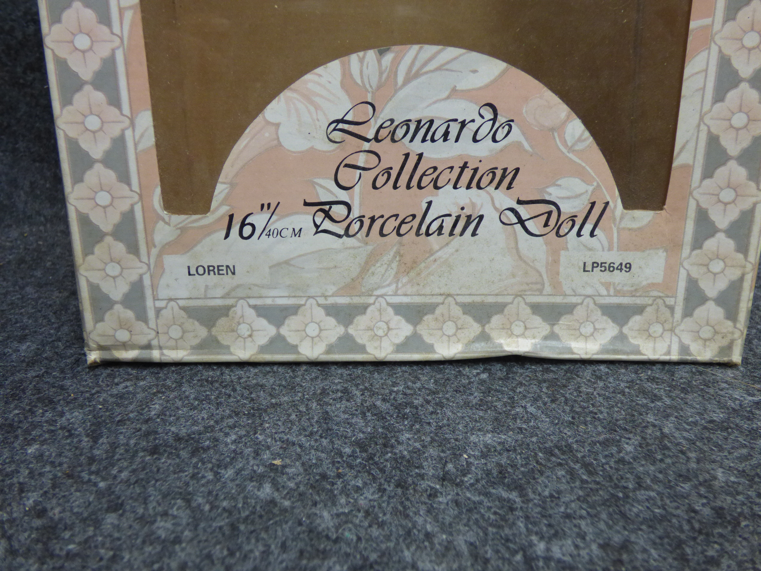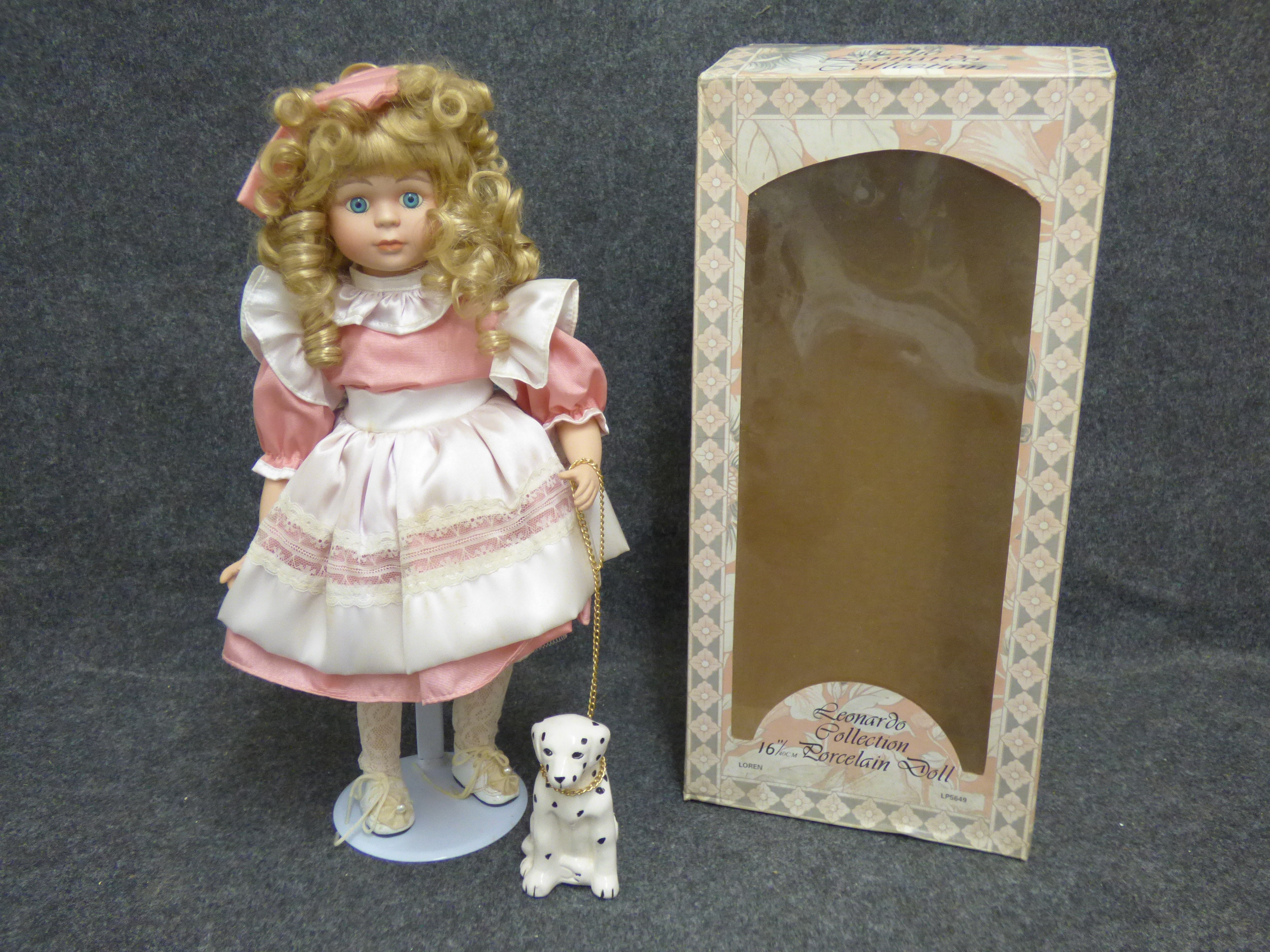 A 16-inch porcelain doll named Loren wearing a pink and white dress accompanied by a porcelain dalmatian dog on a gold-tone chain and original box. 40cm tall
