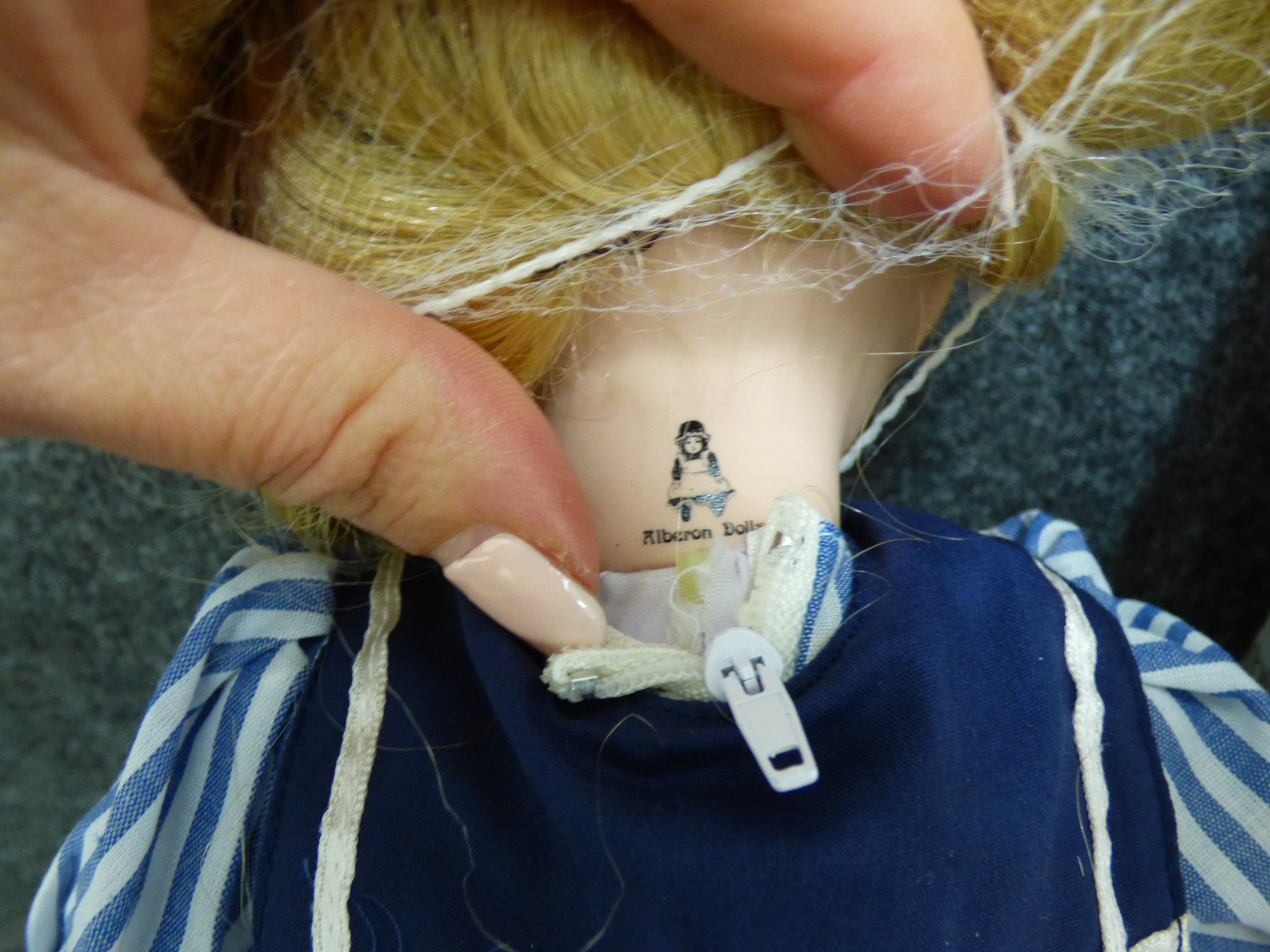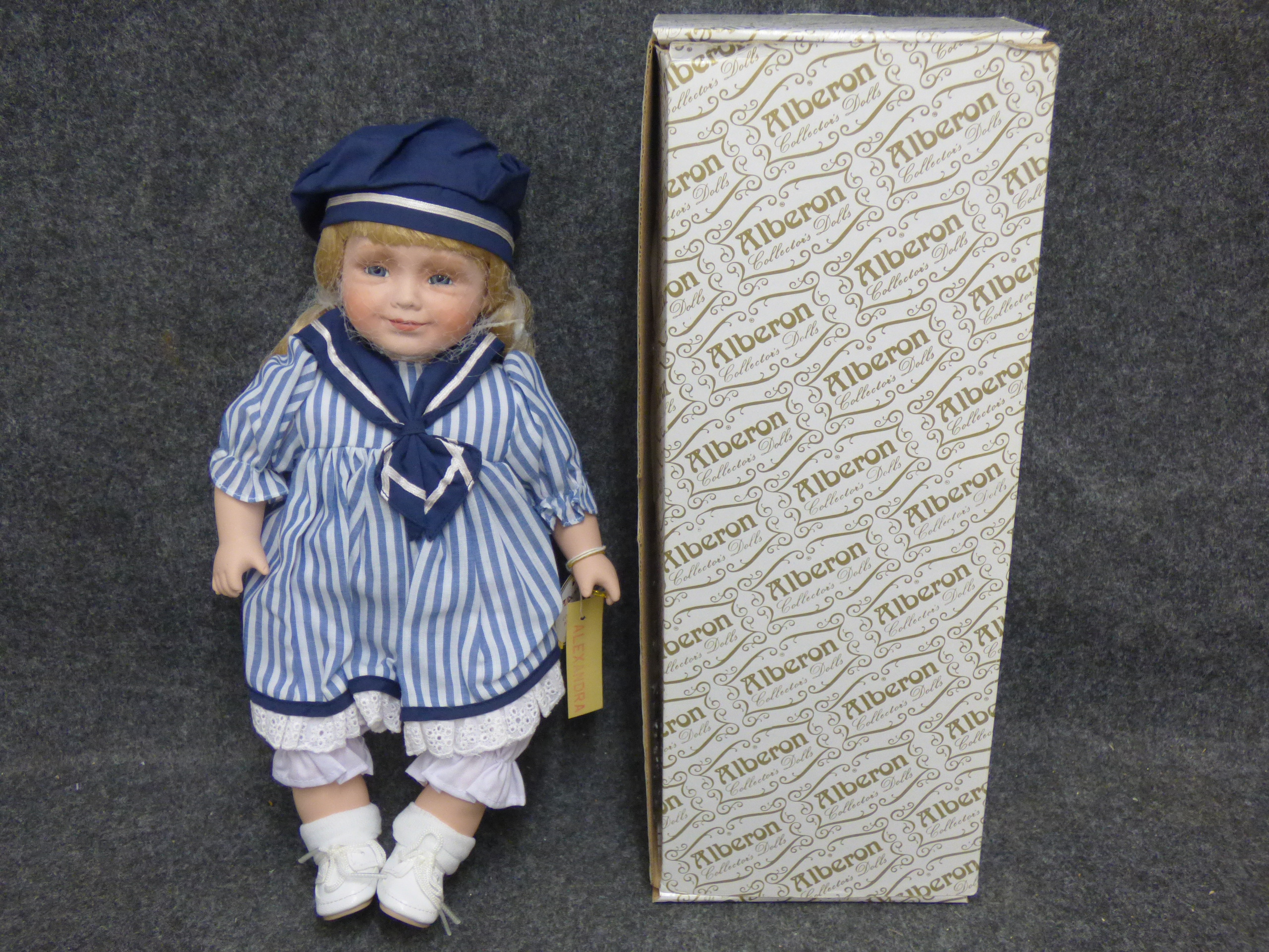 An Alberon porcelain collector doll named Alexandra wearing a blue and white striped sailor outfit with a matching hat, accompanied by its original patterned box. 34cm tall