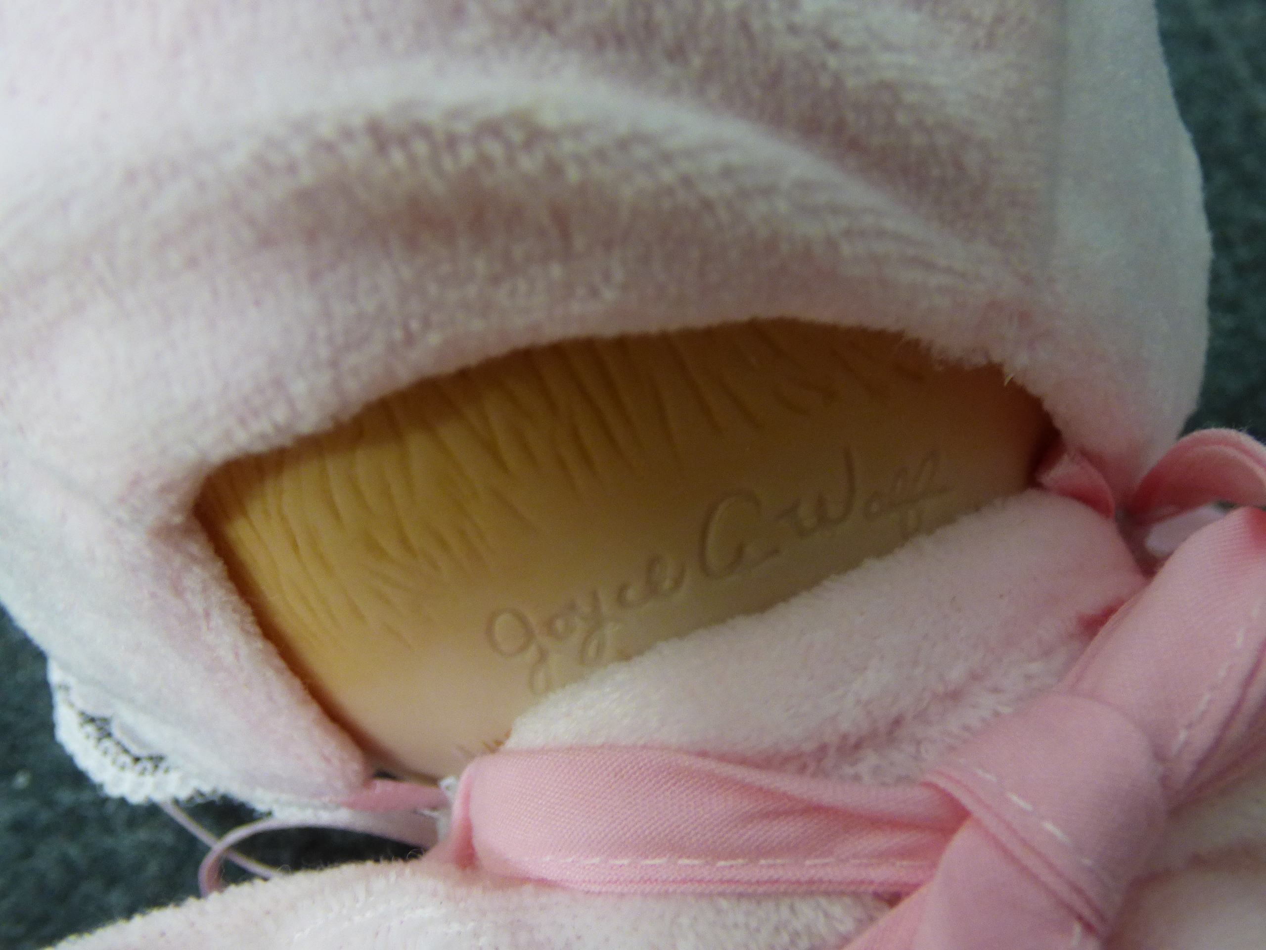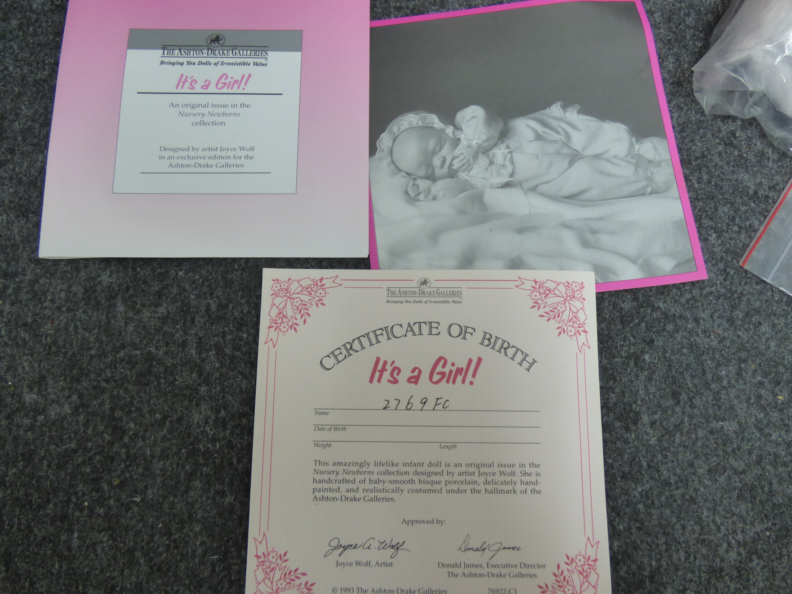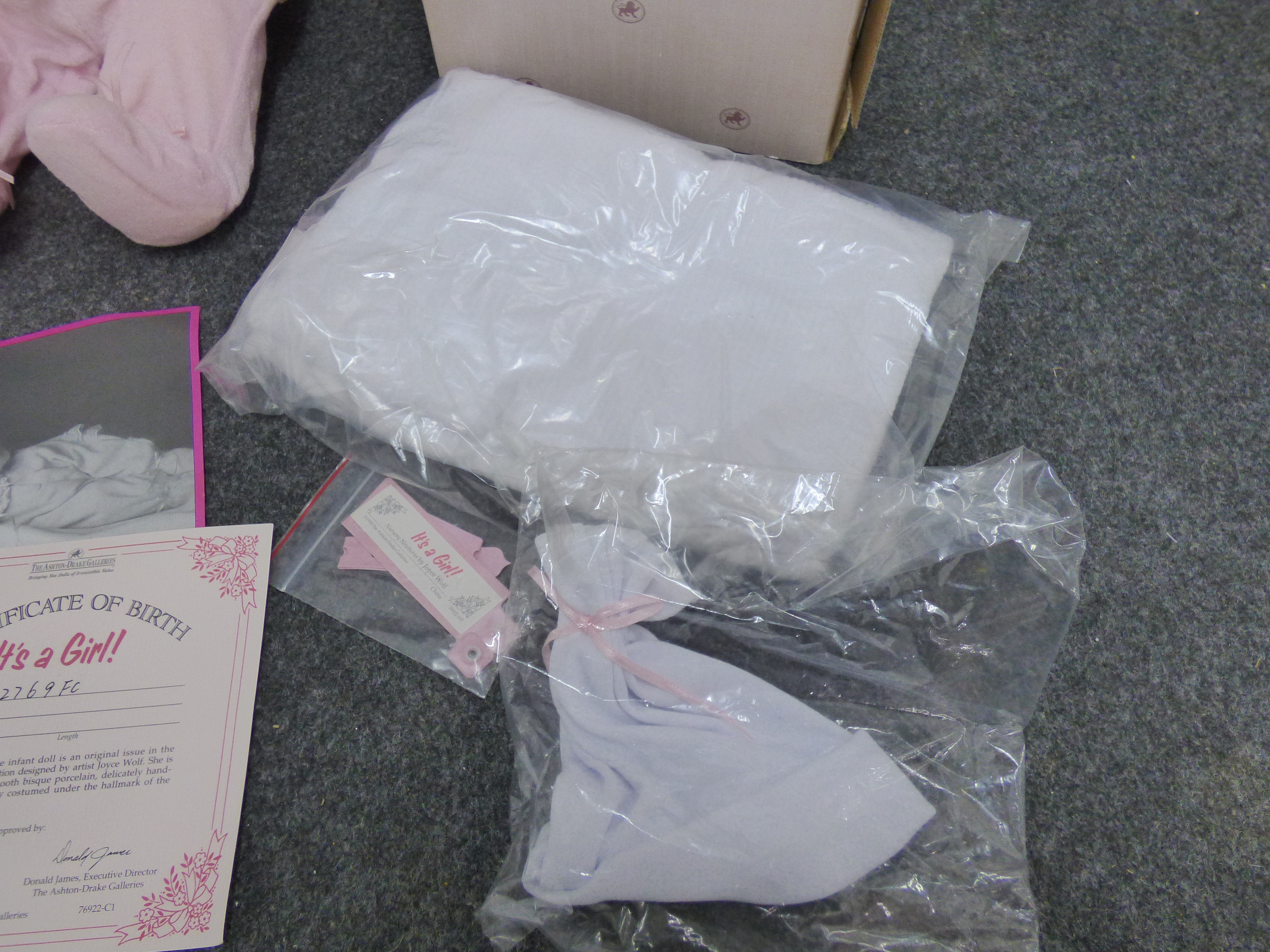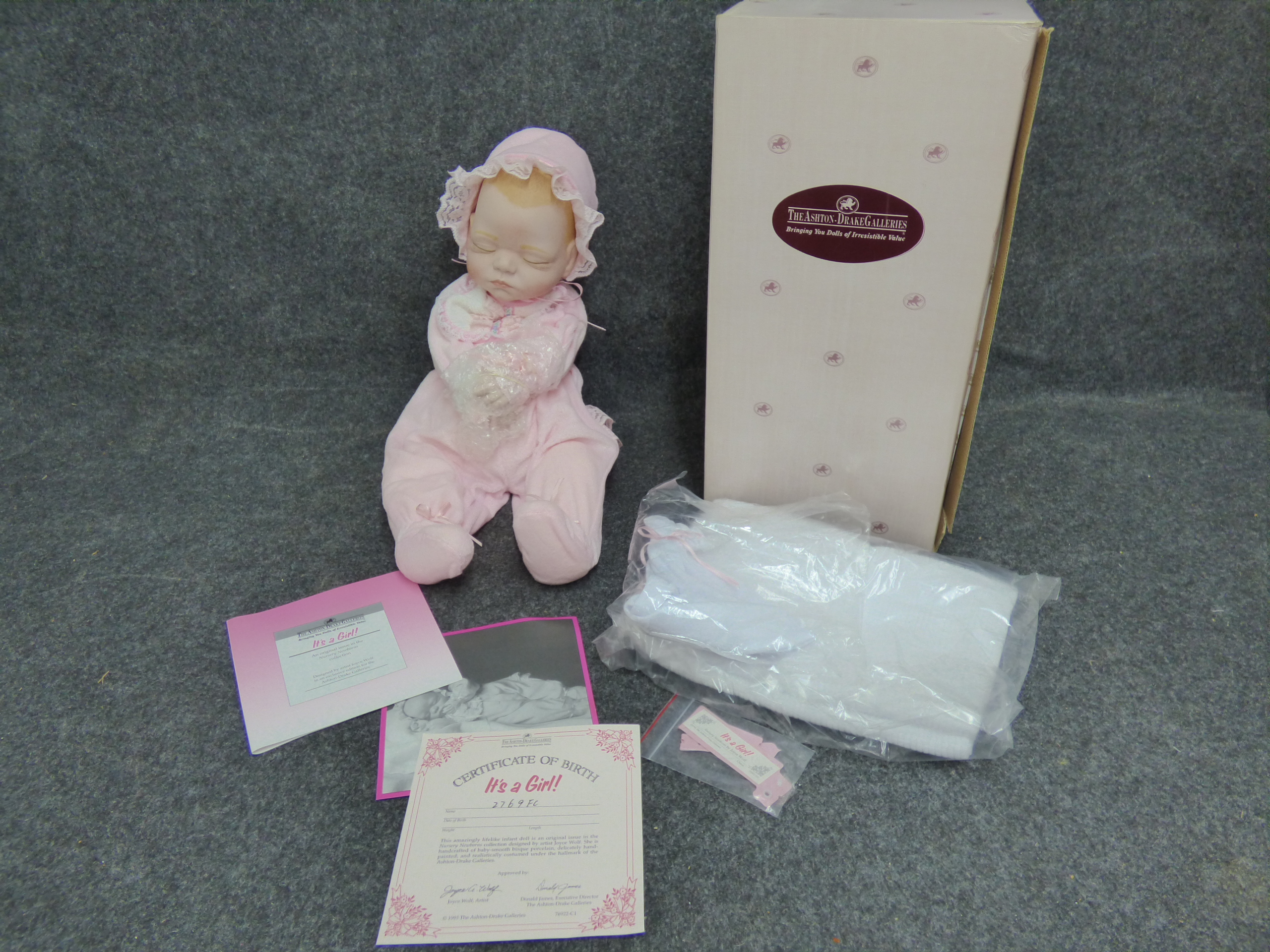 A lifelike porcelain and bean sleeping baby doll in a pink outfit from the Nursery Newborns collection, including its original box, accessories, and certificate of birth numbered 2769 FC.