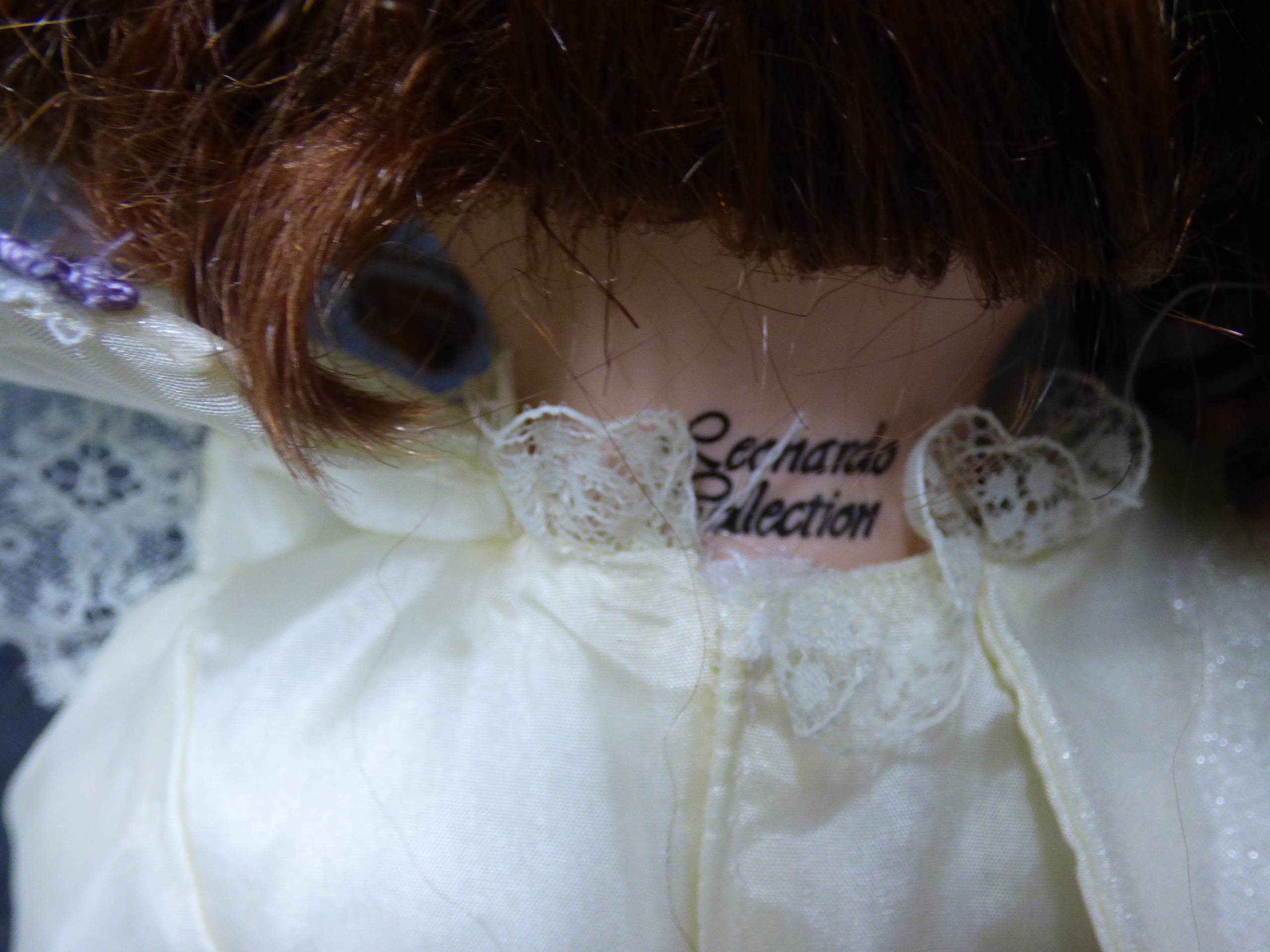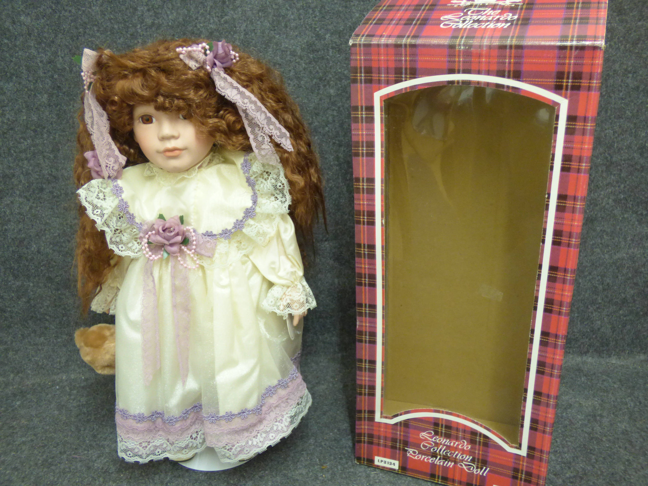 A Jessica porcelain doll from The Leonardo Collection wearing a cream lace gown with lavender accents, accompanied by a small brown teddy bear and original red plaid box. (Not original box) 40cm tall