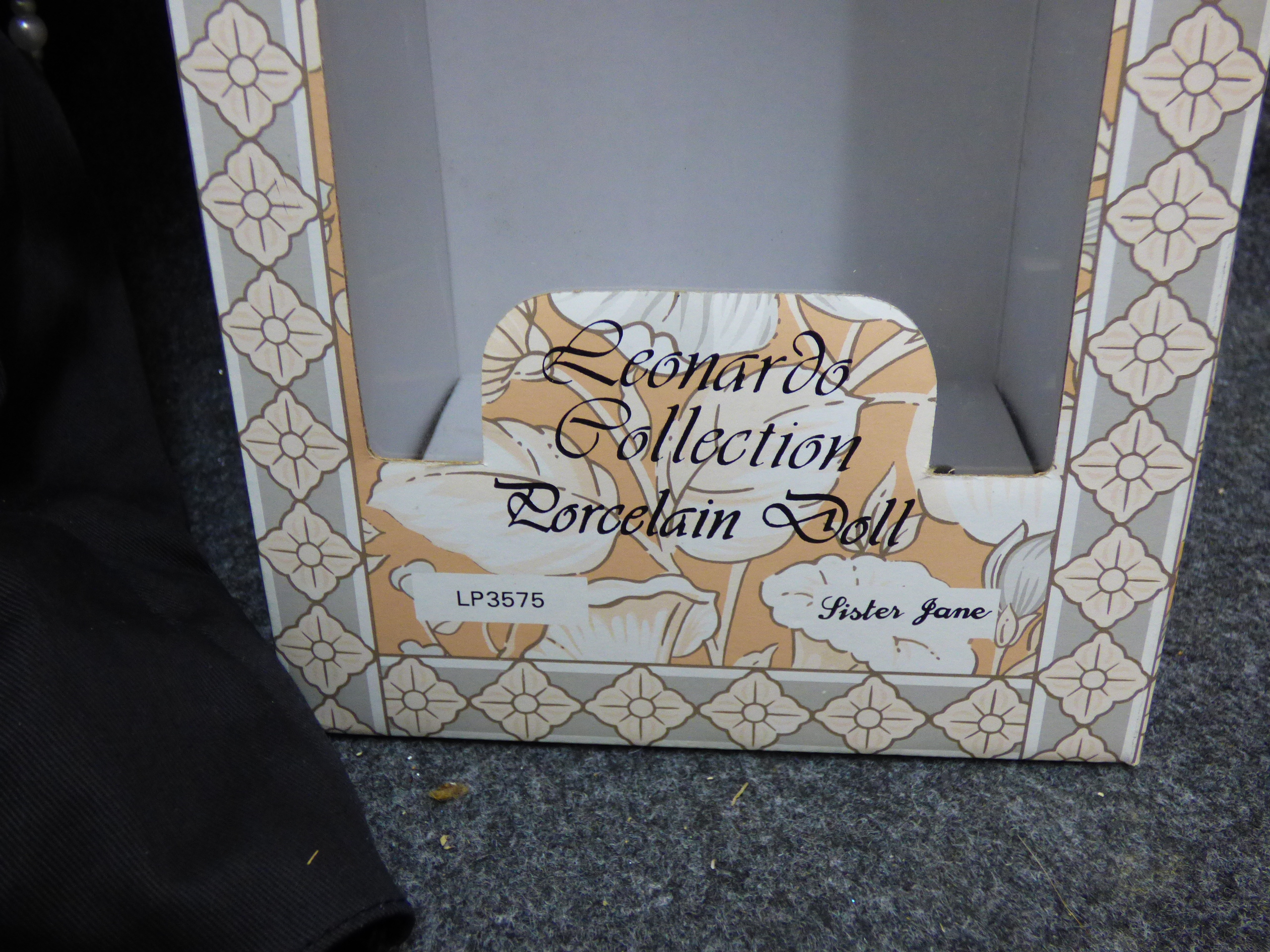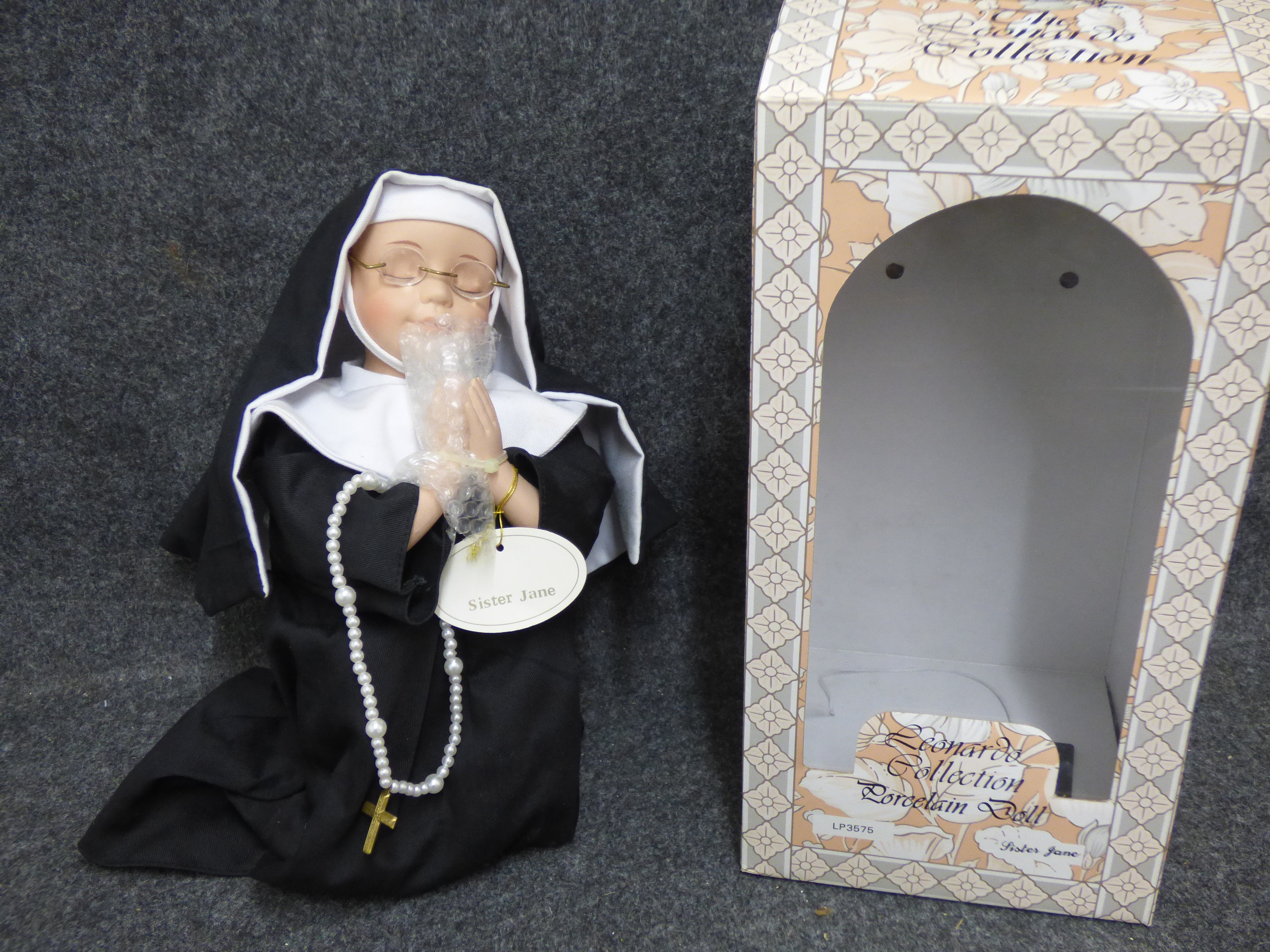 A porcelain nun doll named Sister Jane from The Leonardo Collection, featuring a black and white habit, wire-rimmed glasses, and faux pearl rosary beads, accompanied by its original decorative box marked LP3575. 28cm tall