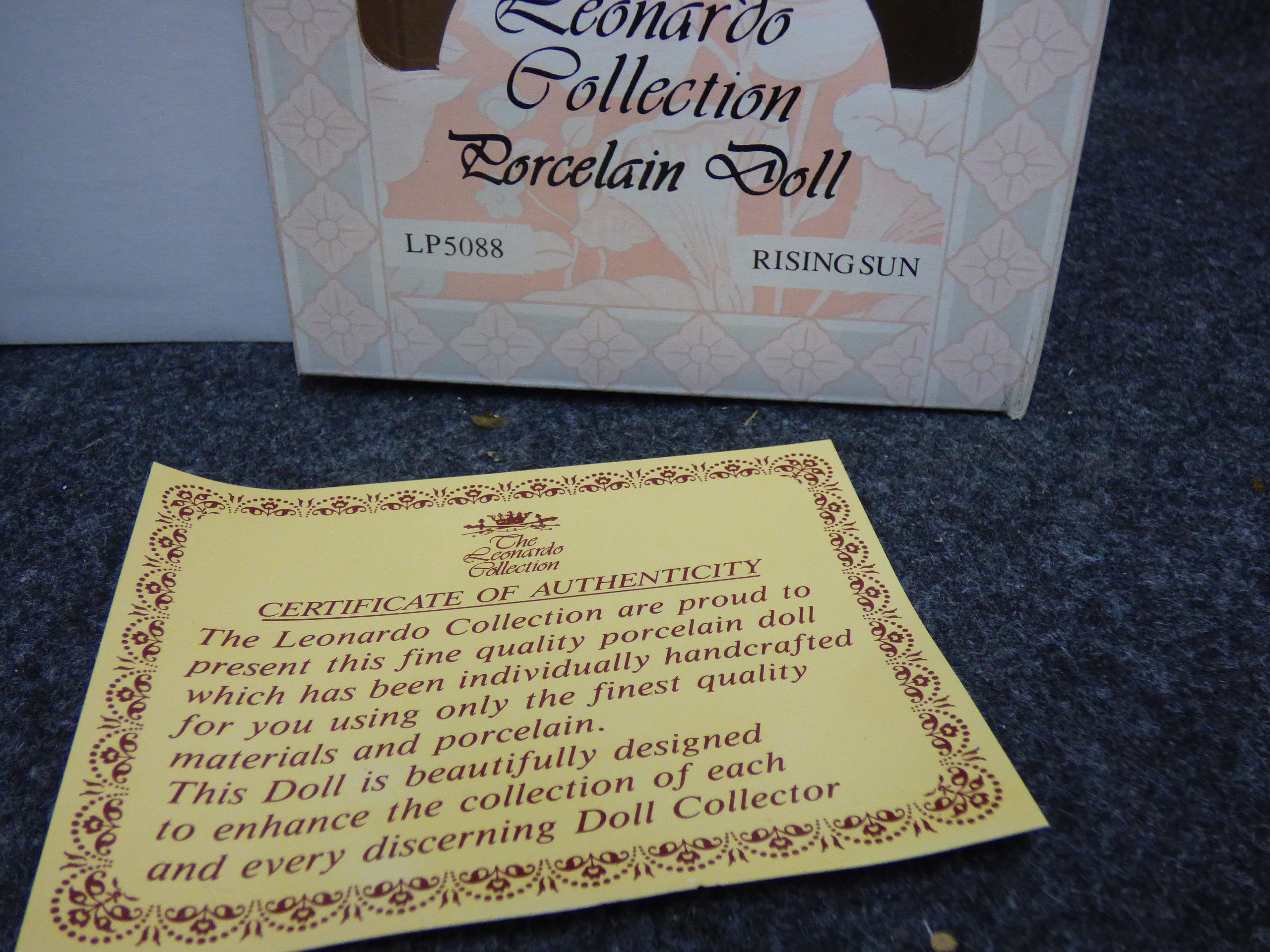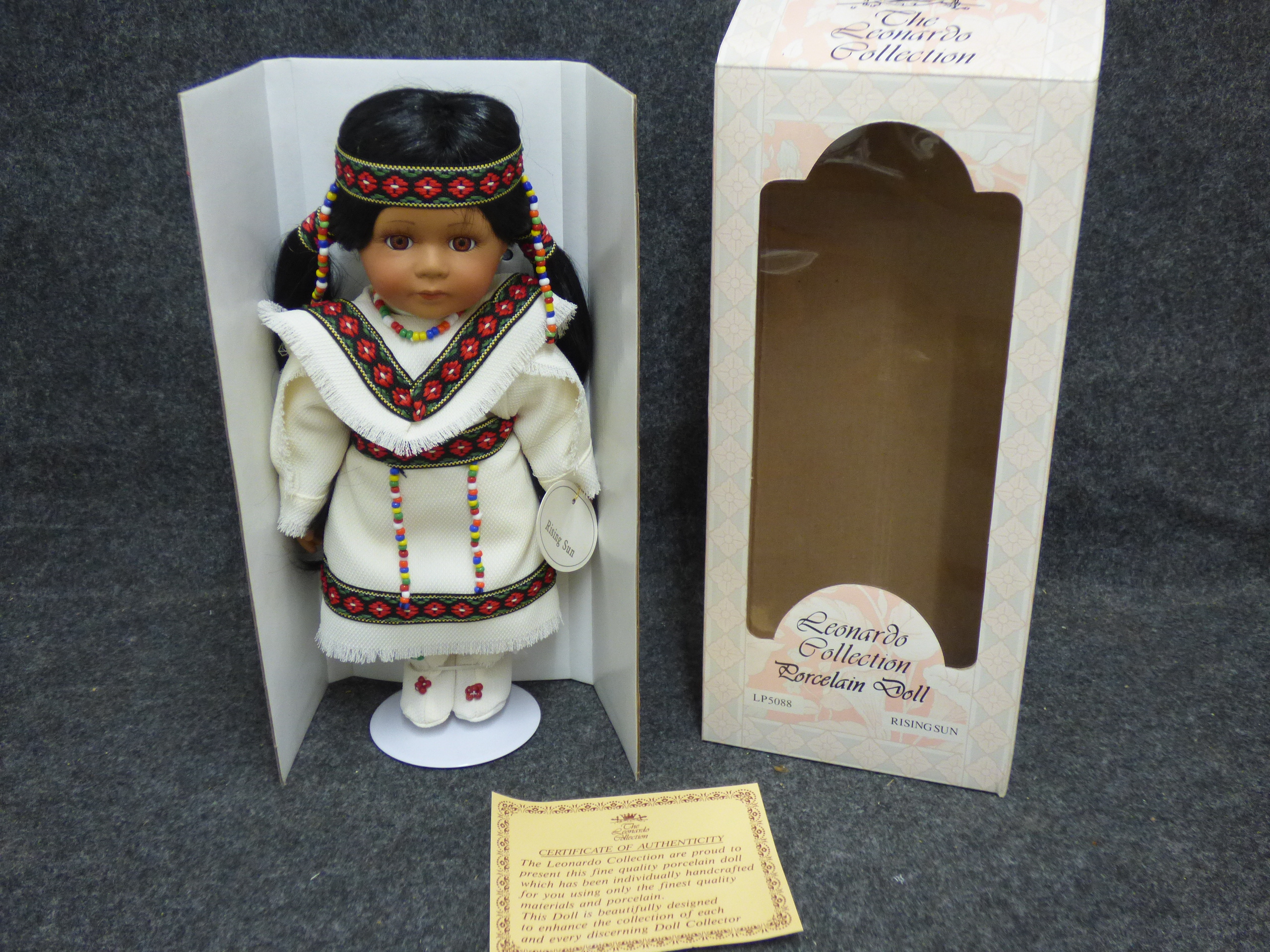 A porcelain doll named Rising Sun wearing a white fringed outfit with floral embroidery and bead accents, complete with its original box and certificate. 32cm tall
