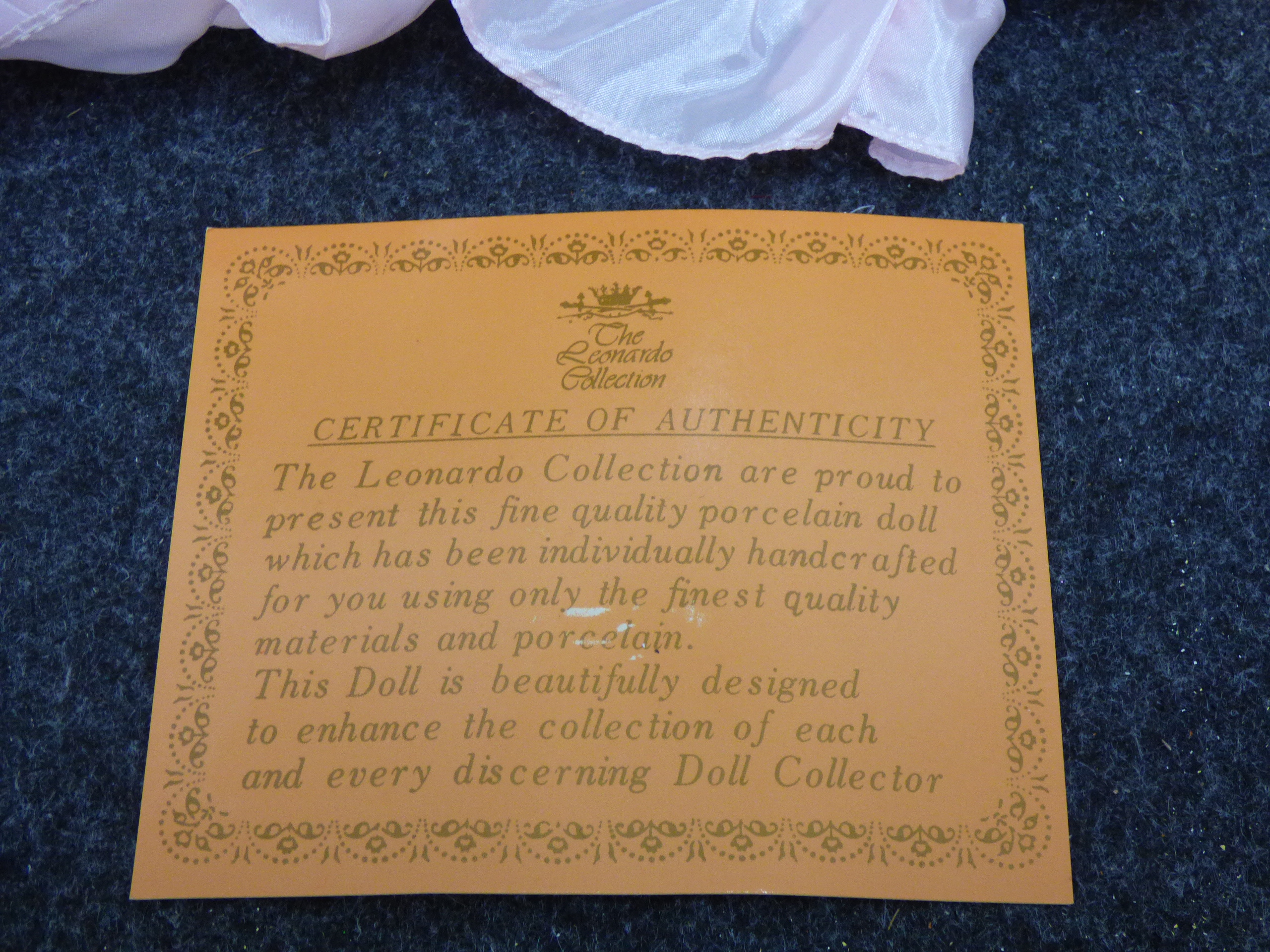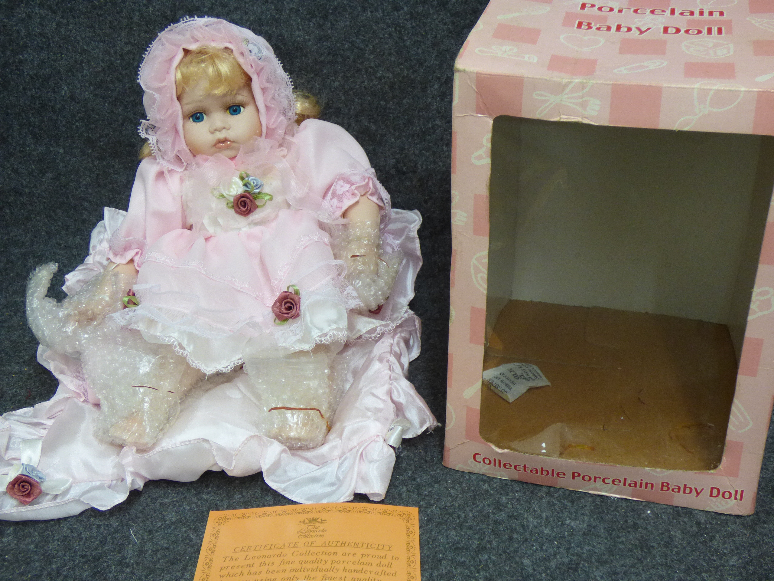 A porcelain baby doll wearing a pink lace dress and bonnet, accompanied by its original box and certificate of authenticity. 27cm tall