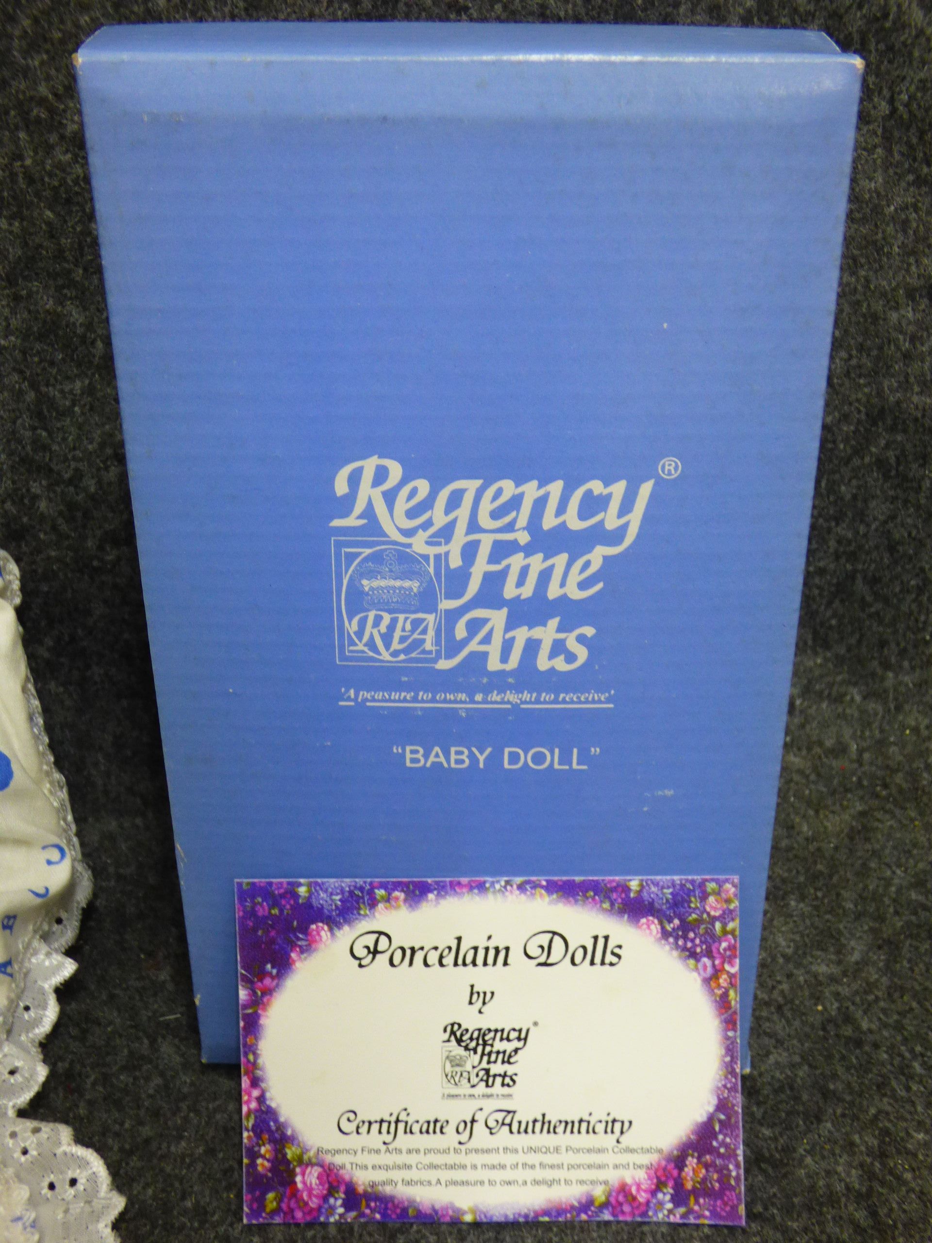 A Regency Fine Arts porcelain baby doll named Dennis wearing a blue outfit, accompanied by a patterned pillow, original box, and Certificate of Authenticity. 19cm tall