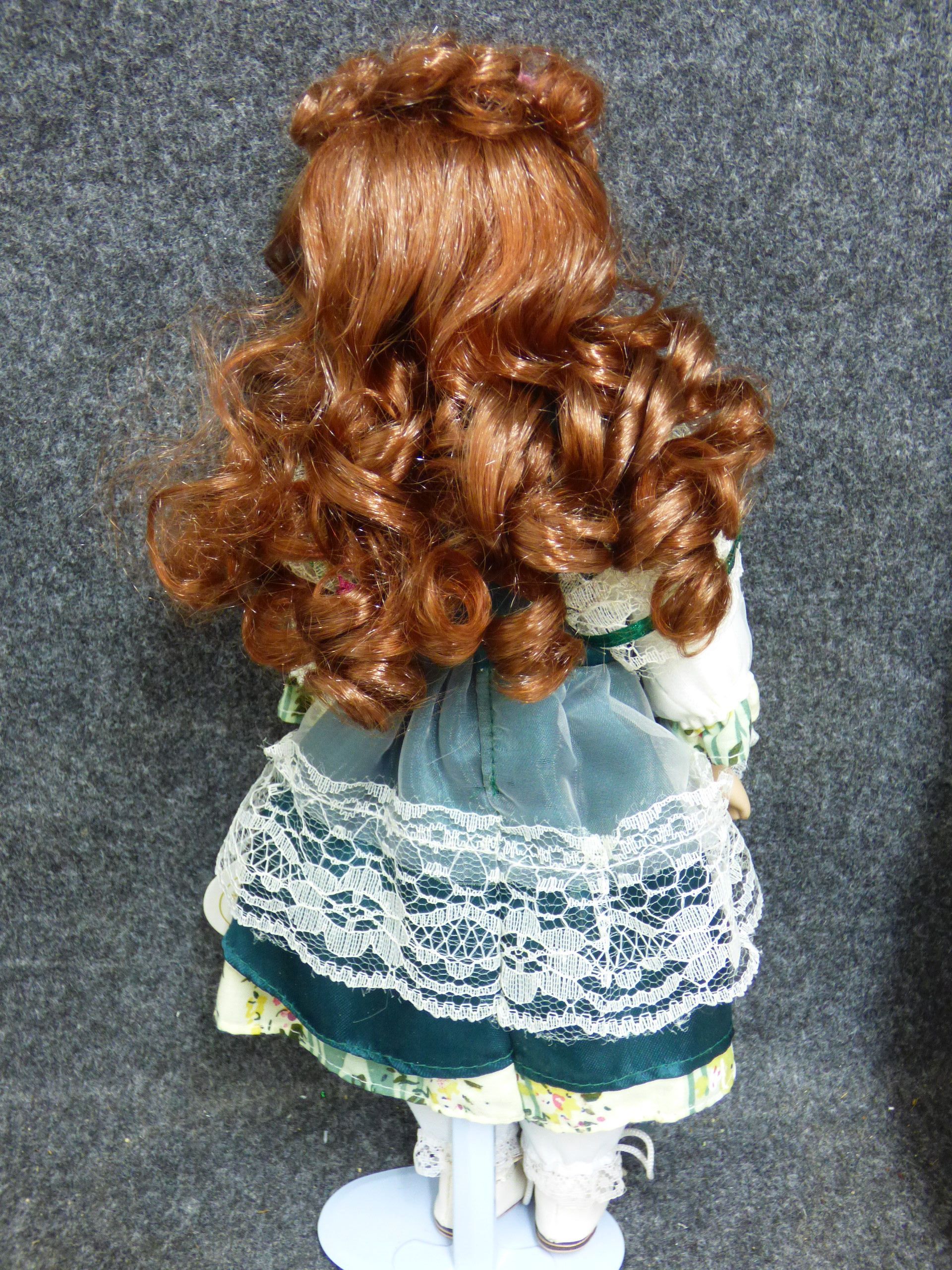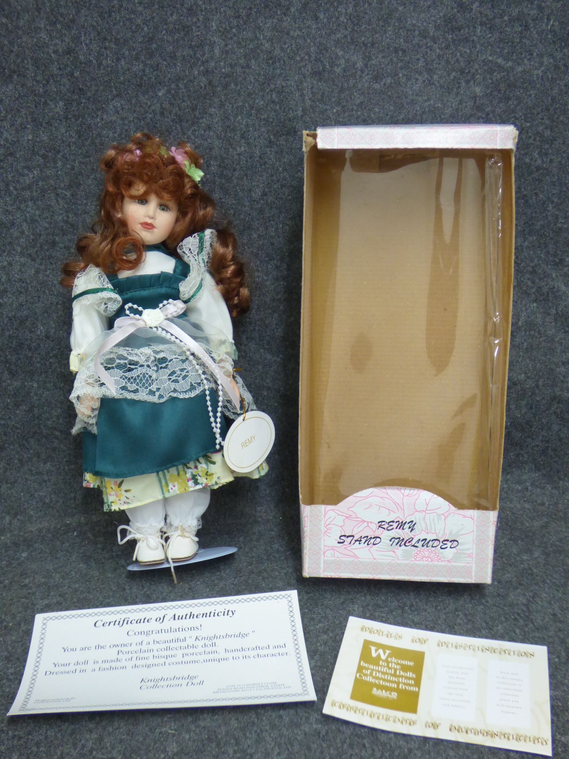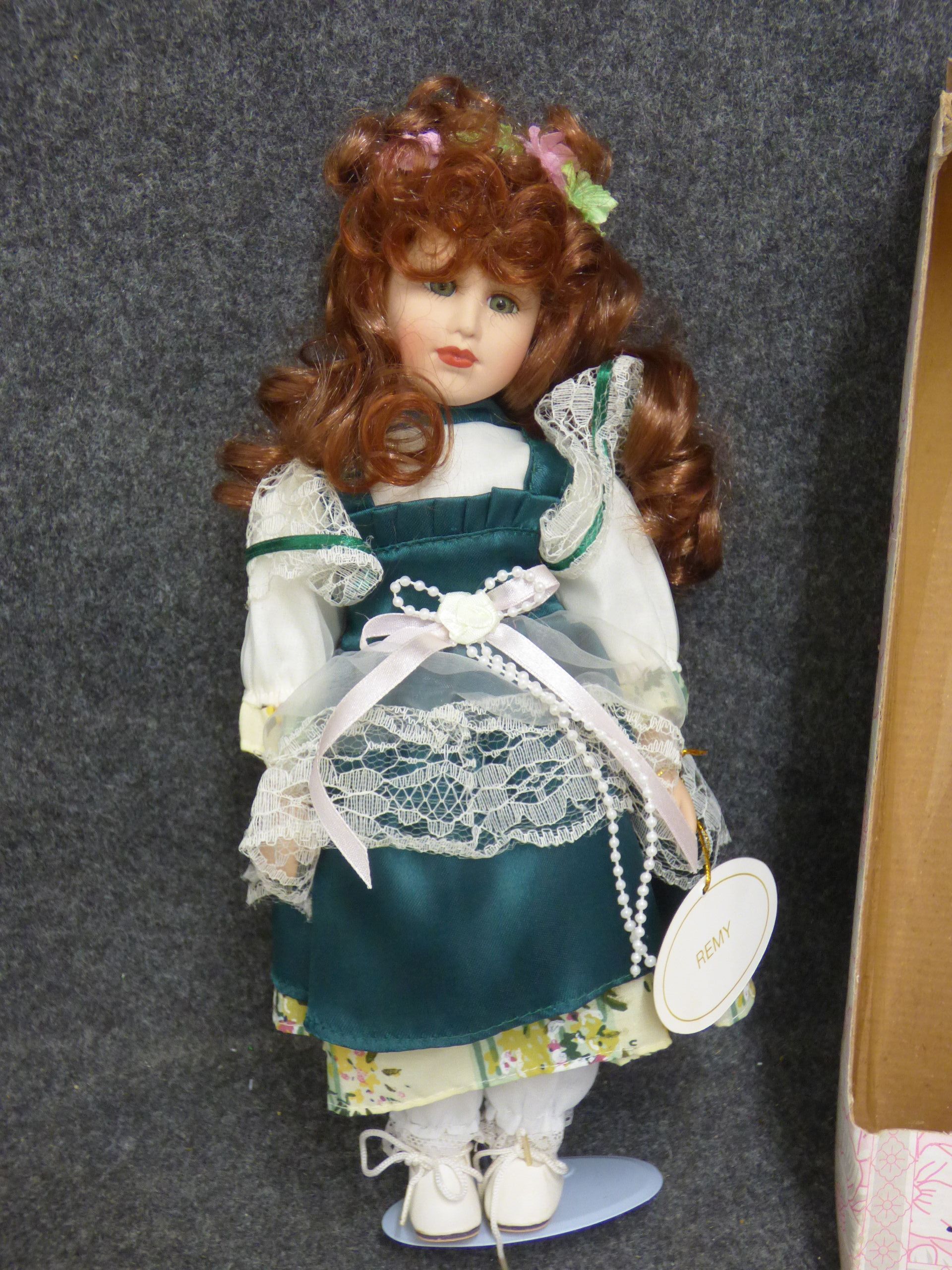 A handcrafted fine bisque porcelain doll named Remy featuring reddish-brown hair and a teal green lace-trimmed outfit, accompanied by its original box, stand, and certificate of authenticity. 32cm tall