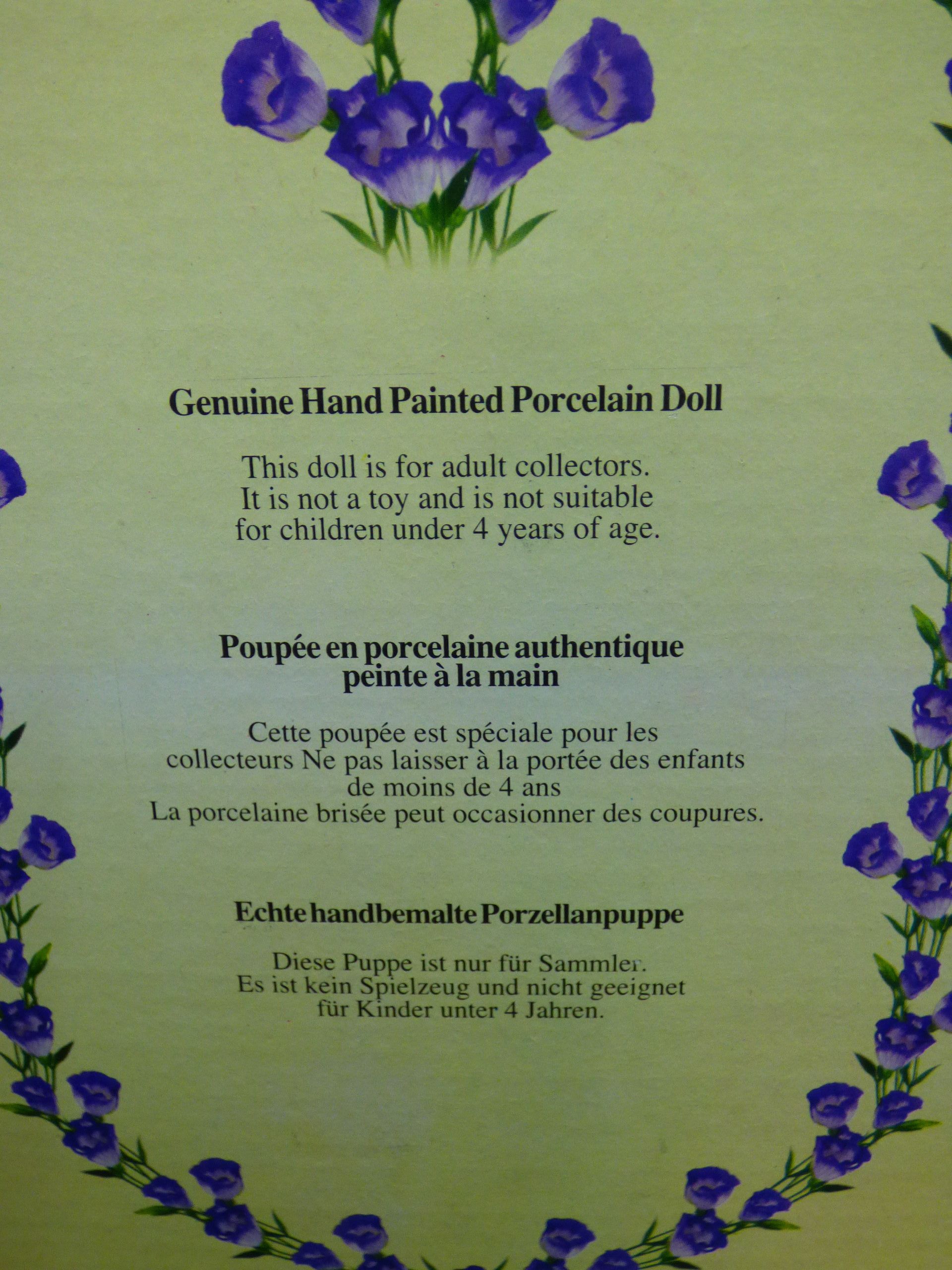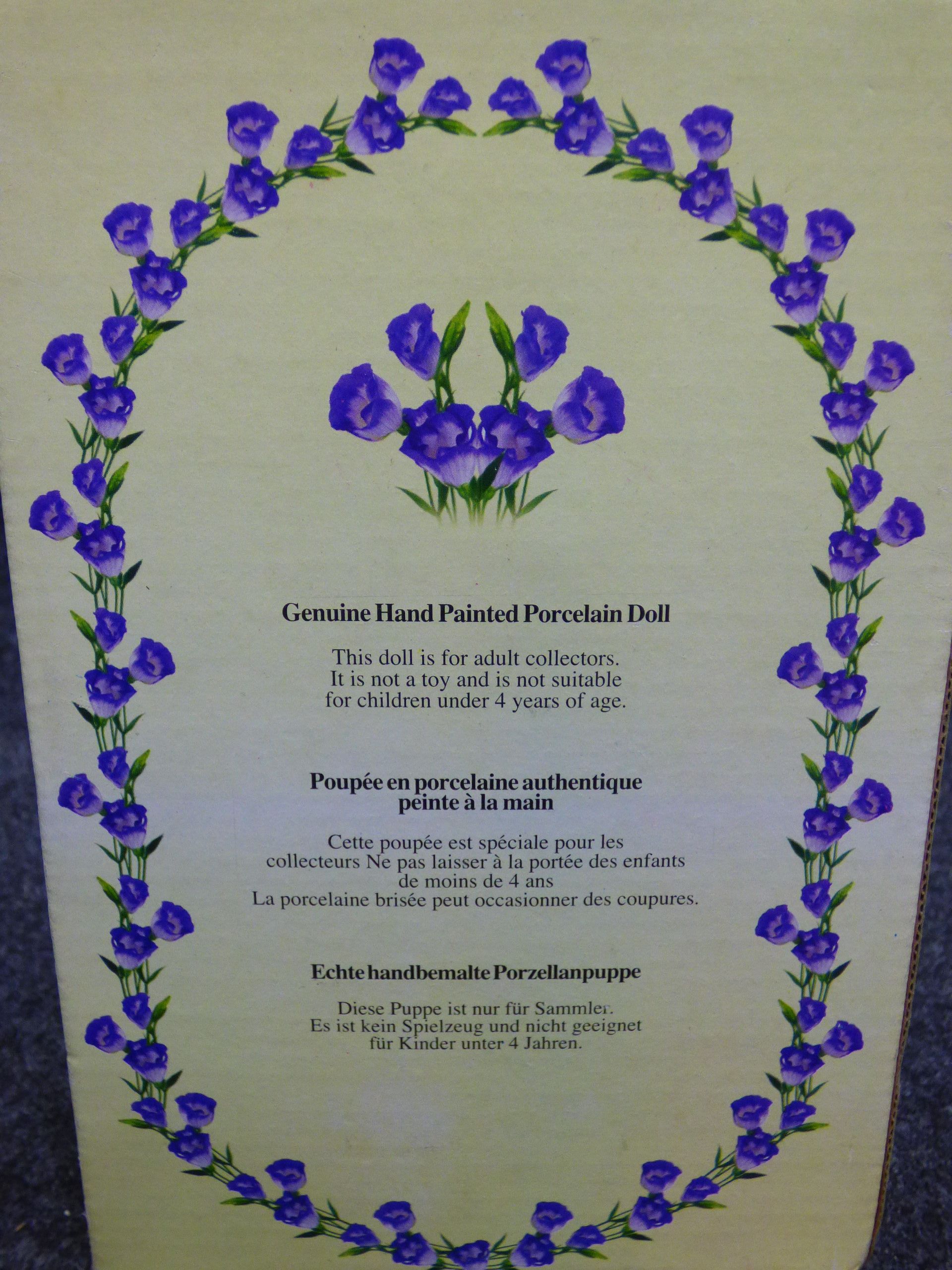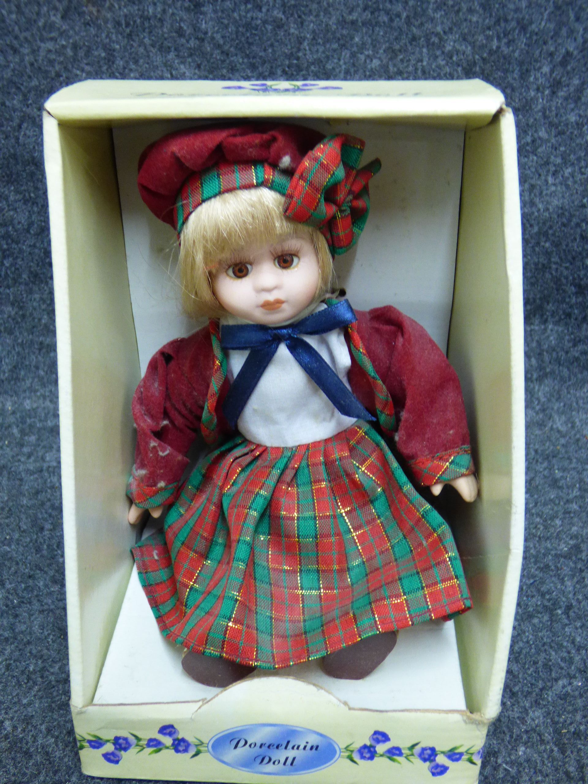 A genuine hand-painted porcelain collector’s doll dressed in a red jacket and a red and green plaid skirt and hat, presented in its original box. 20cm tall