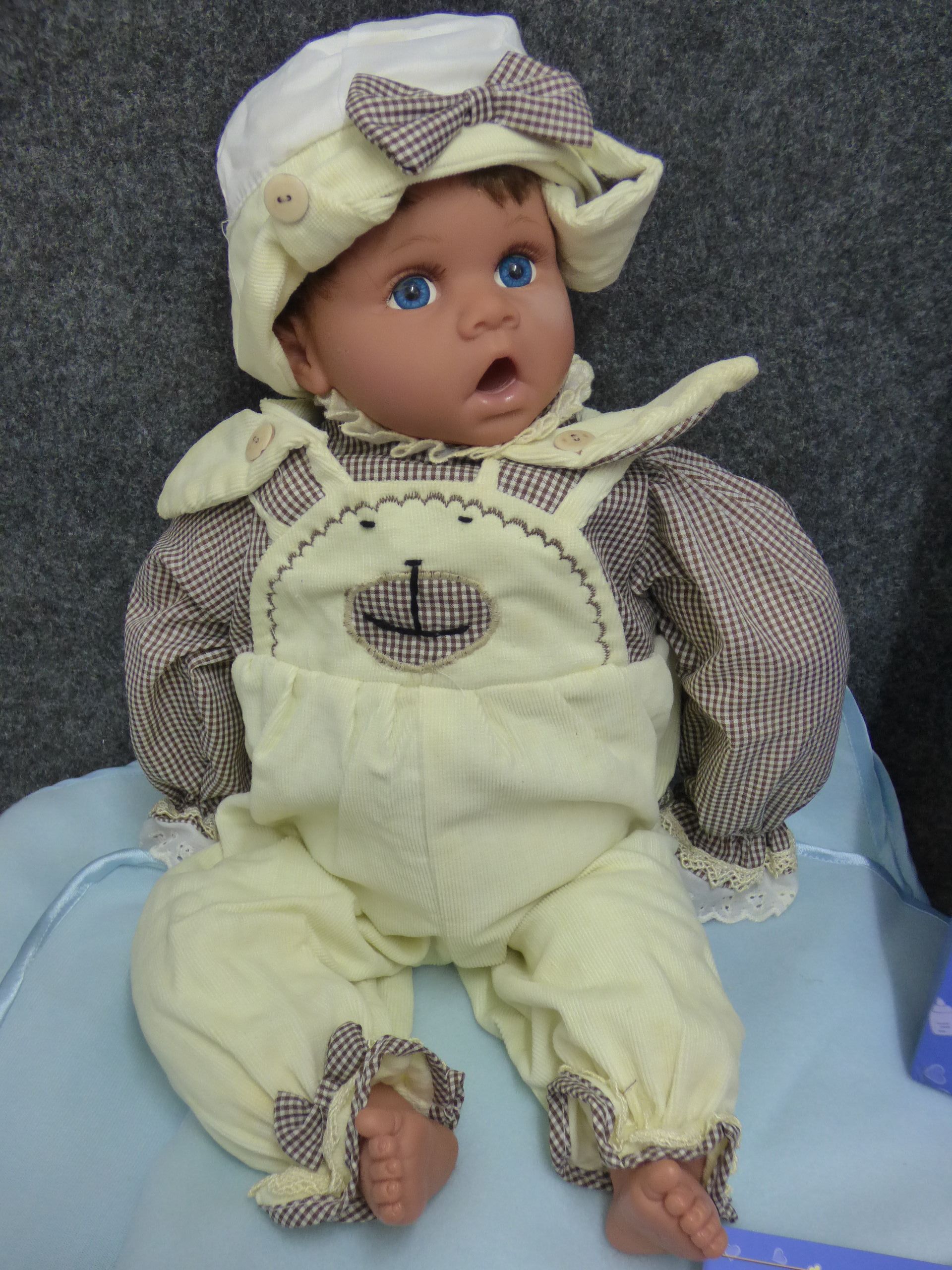 A vinyl baby doll wearing cream and brown checkered attire with a matching hat, accompanied by its original box and certificate of authenticity. 50cm tall