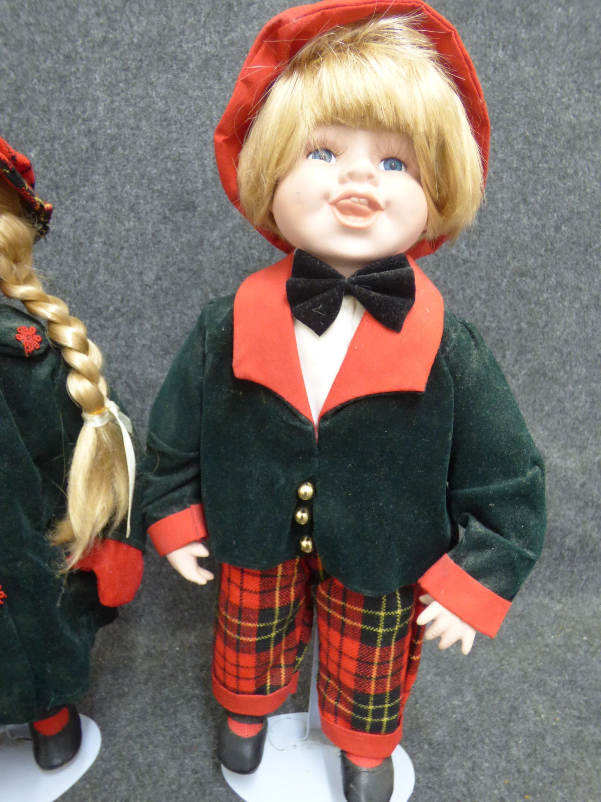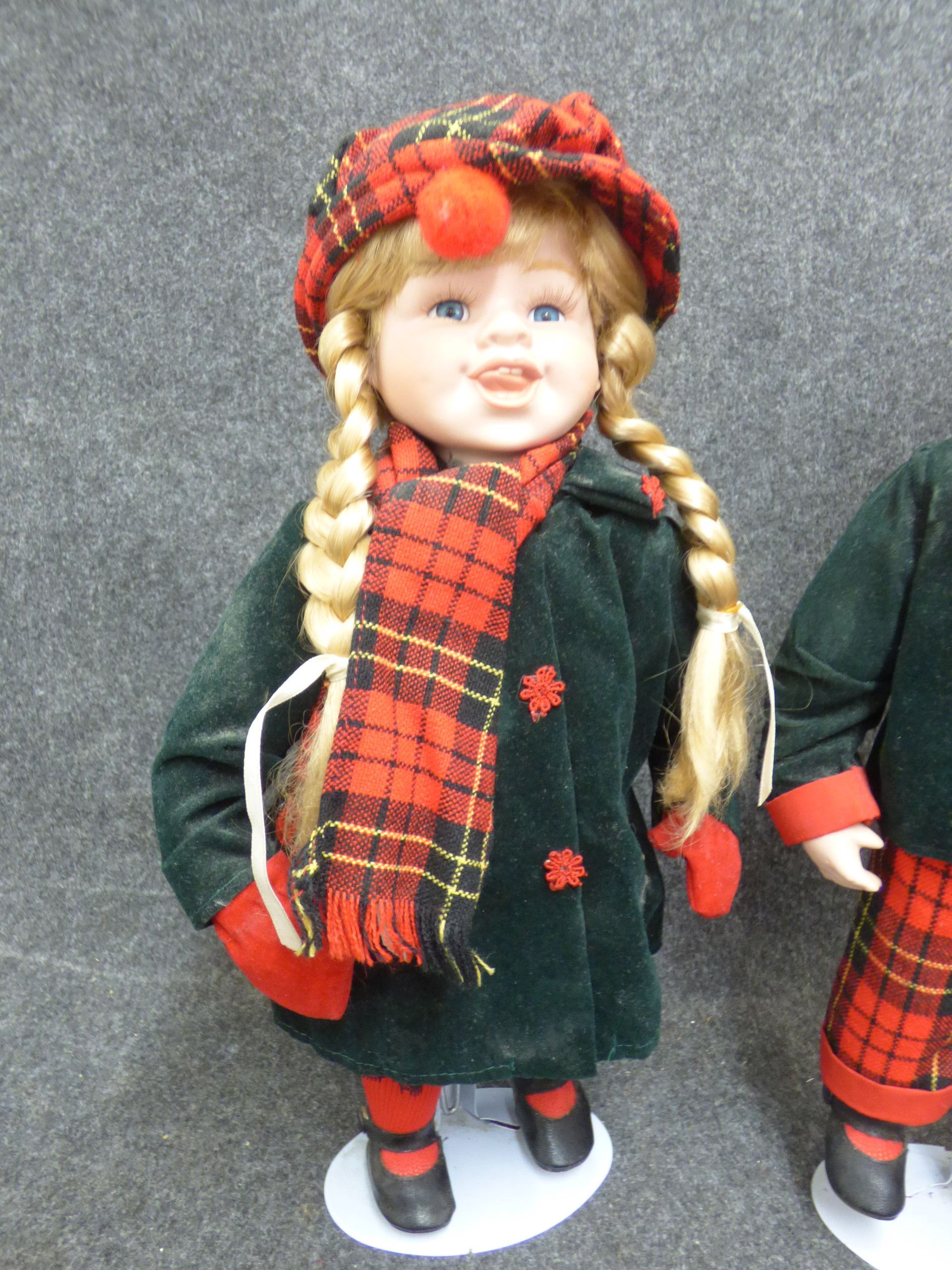 A pair of porcelain dolls featuring a boy and girl dressed in dark green velvet jackets with red and yellow plaid accents, mounted on white circular display stands. 42cm tall