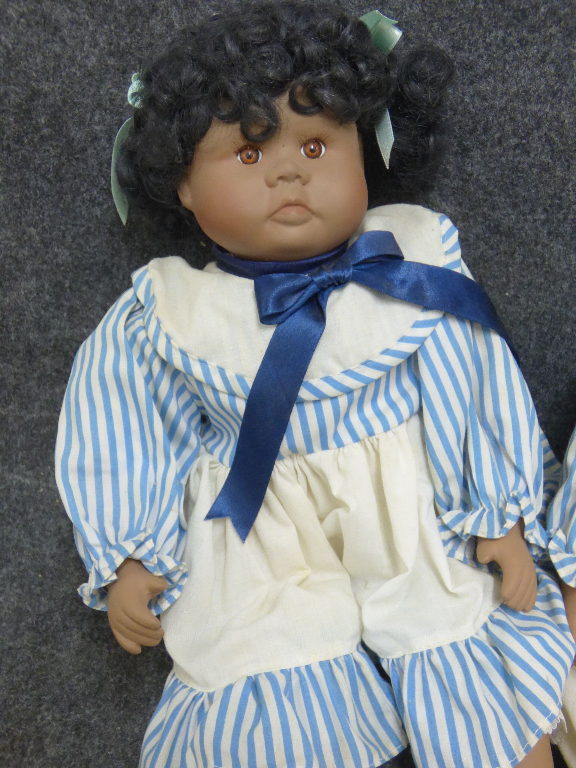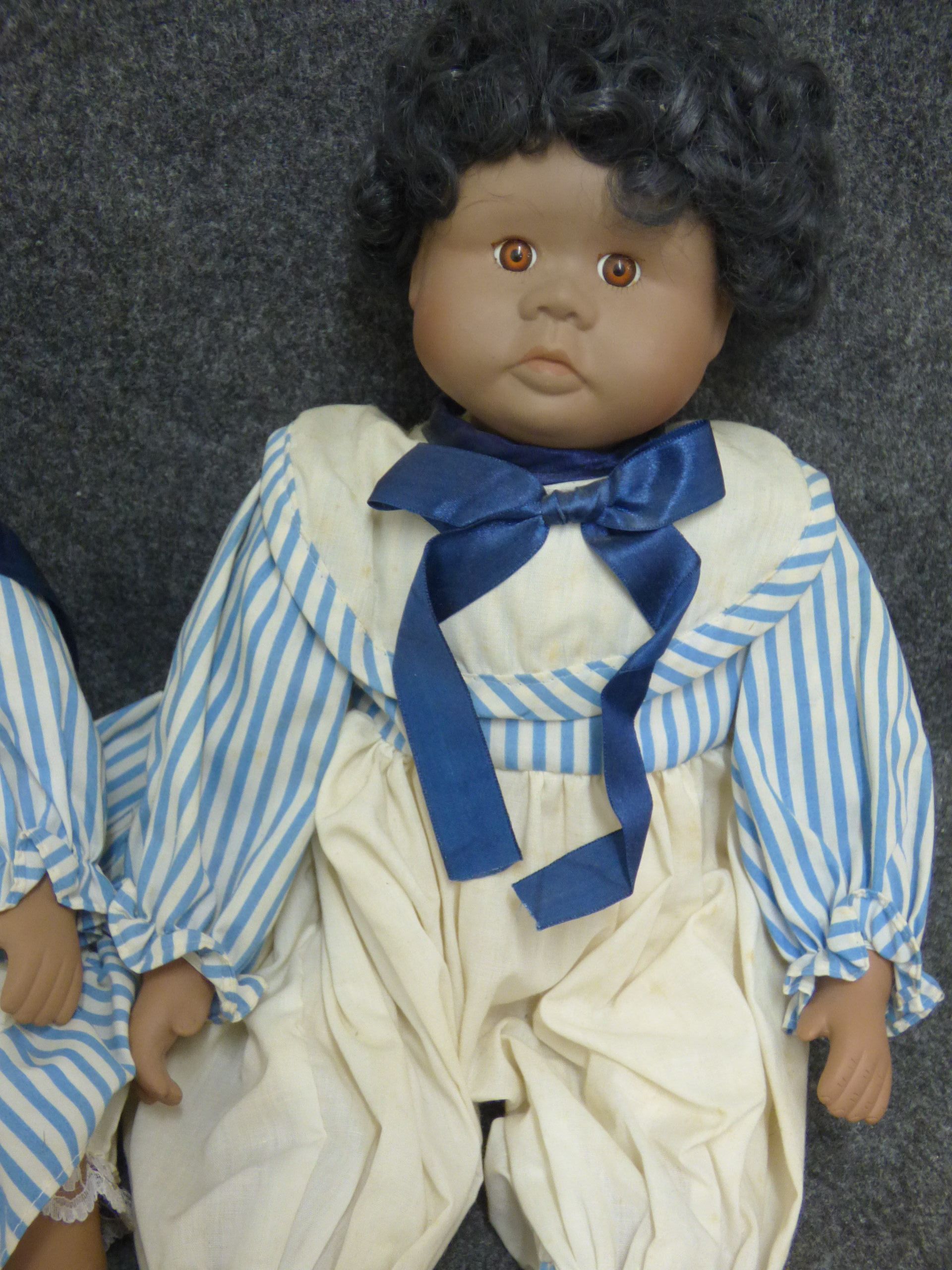 A pair of dolls with brown skin and dark curly hair dressed in coordinating blue and white striped outfits with navy blue ribbon accents. 40cm tall