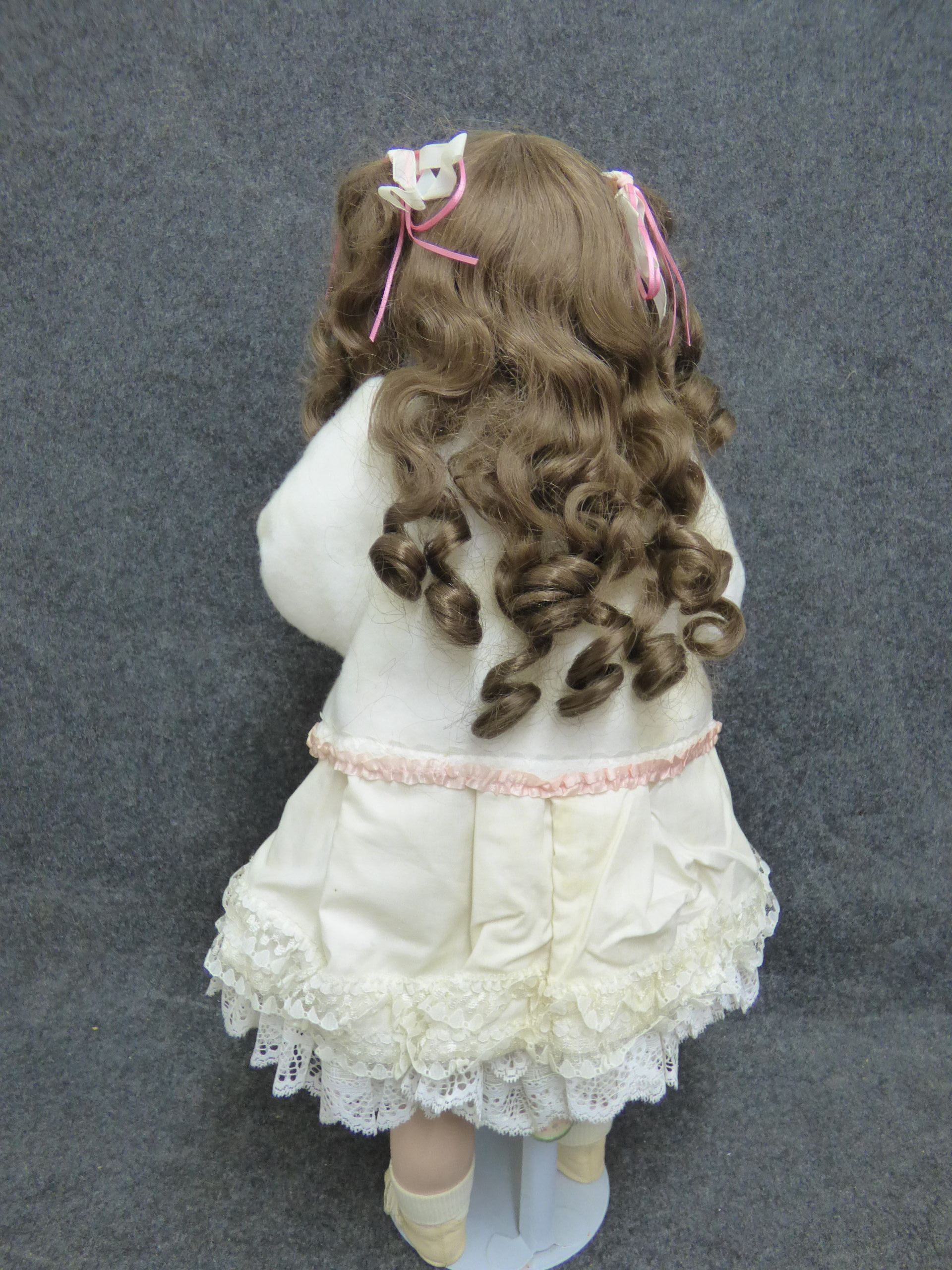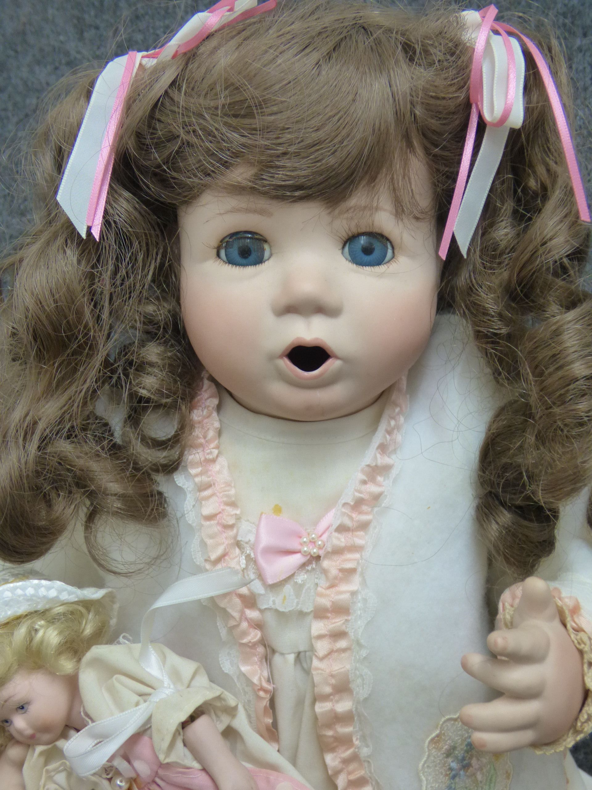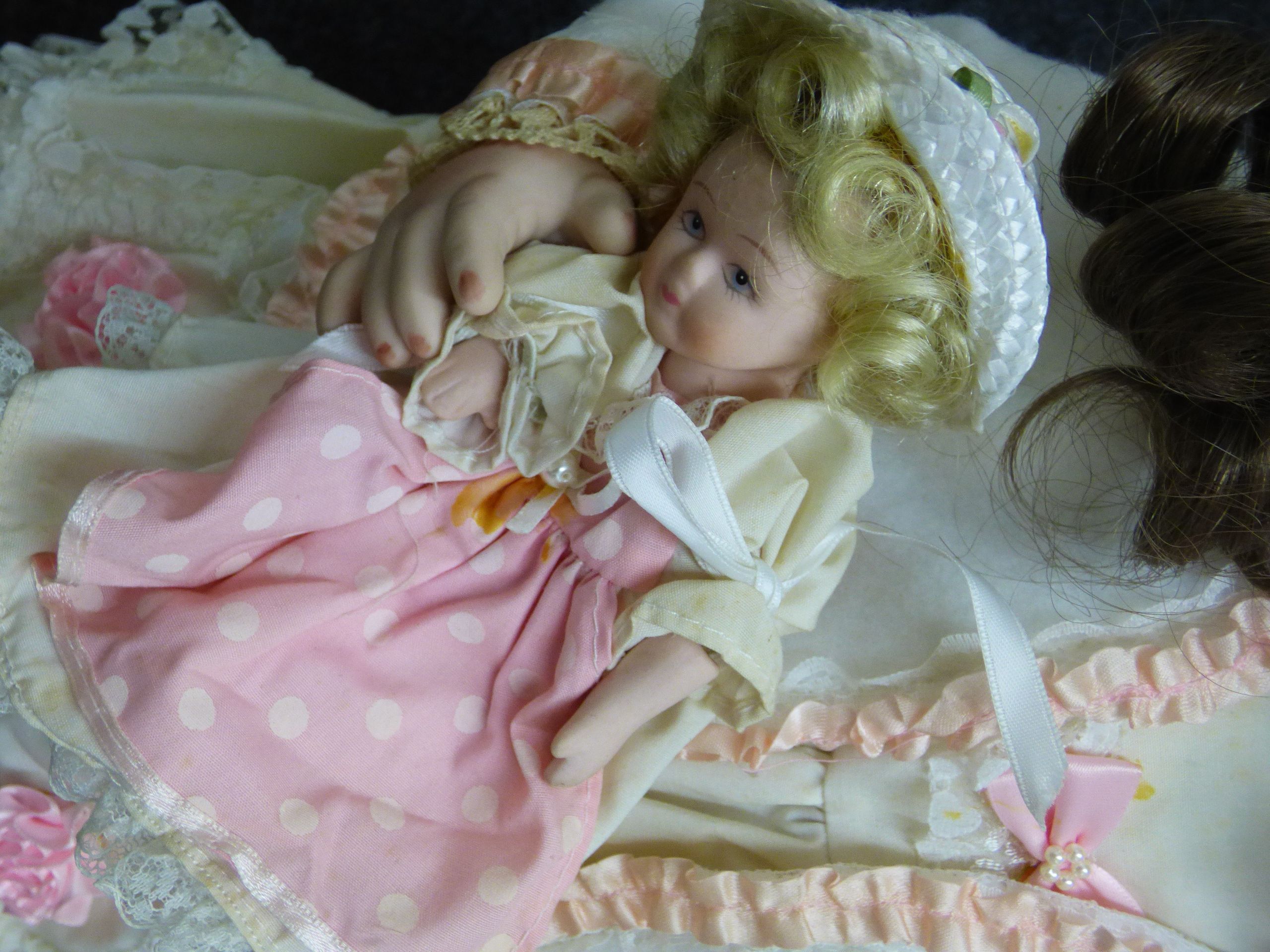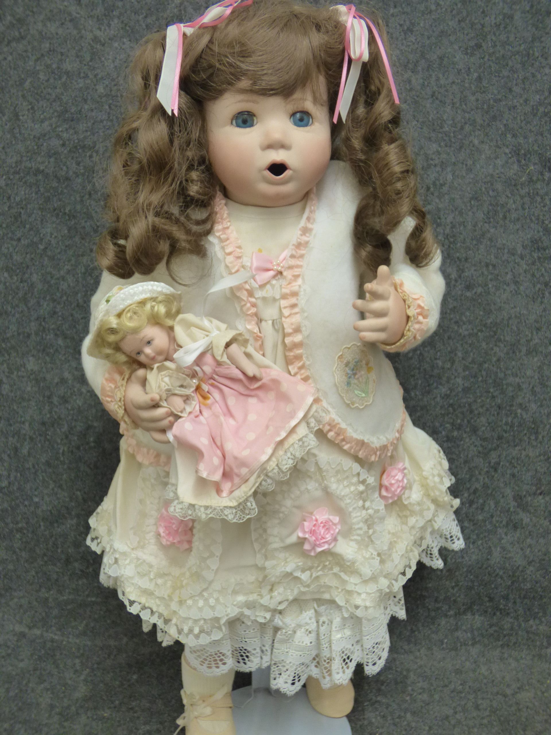 Two porcelain dolls including a larger brunette doll in a cream lace dress and a smaller blonde doll in a pink polka dot dress, showing some staining to the fabric. 60cm tall