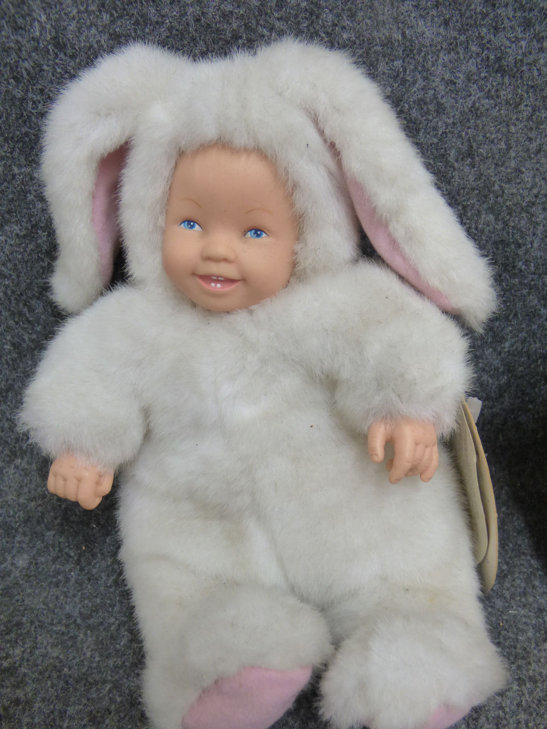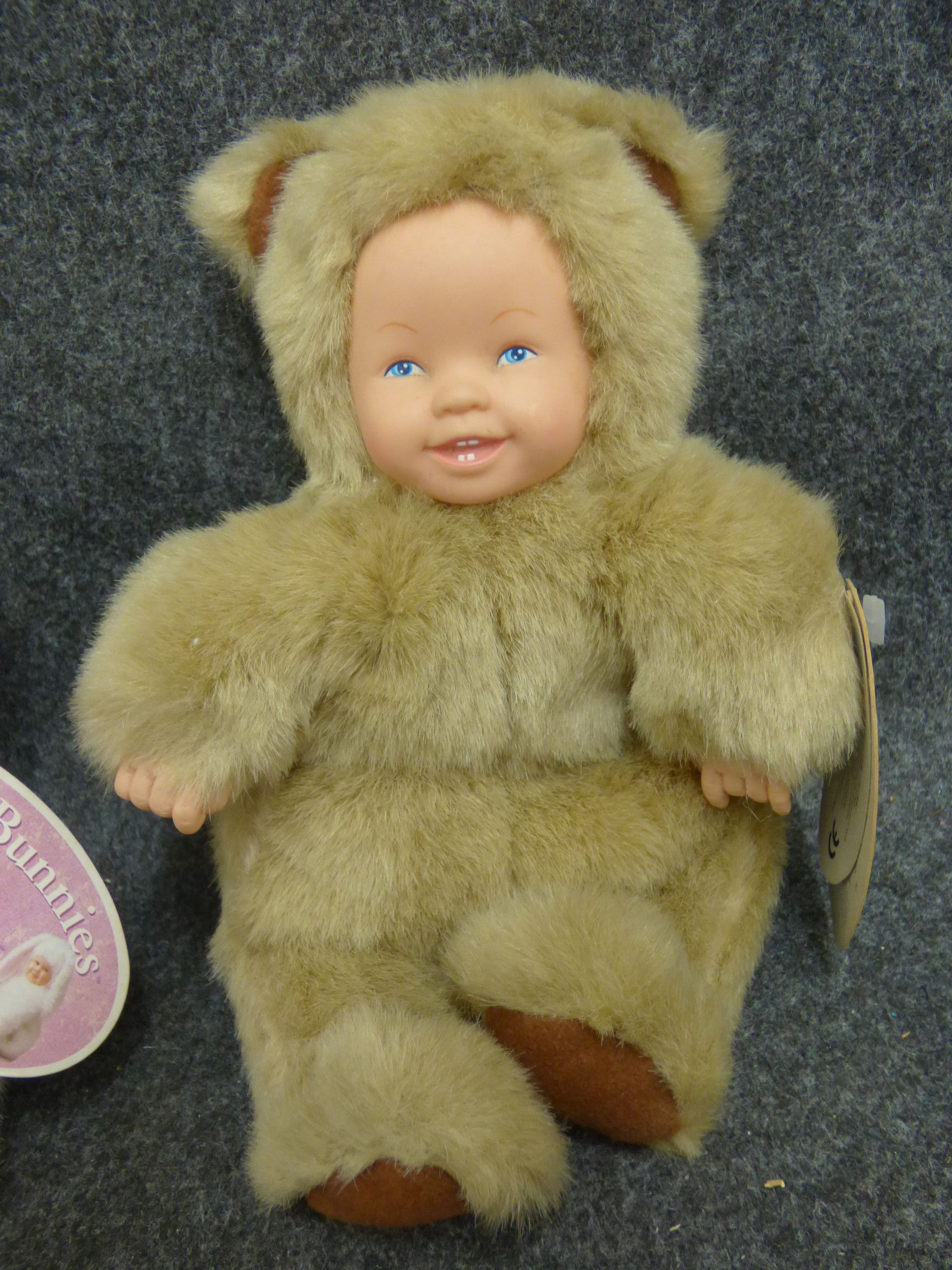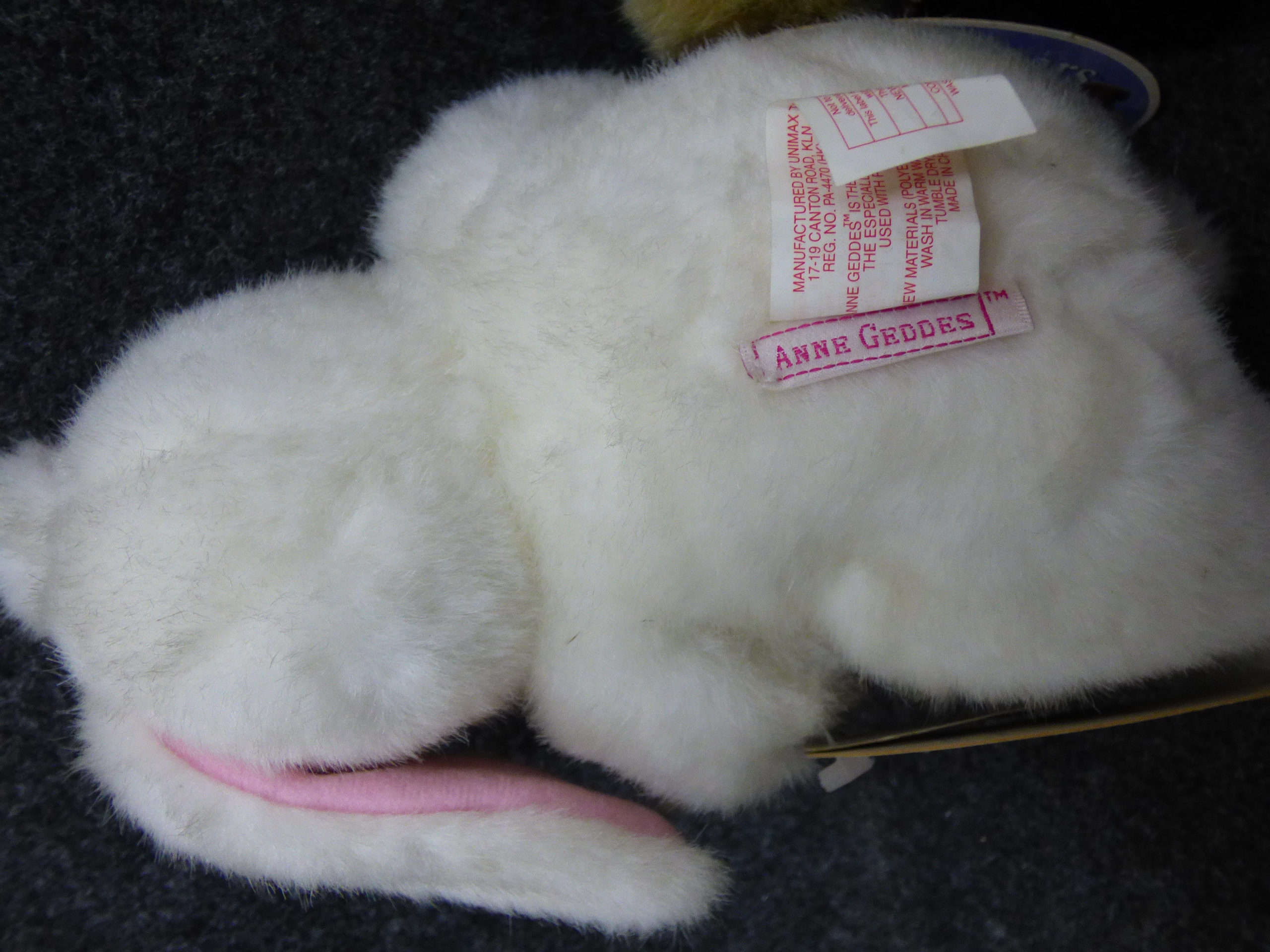 Two bean-filled plush dolls with vinyl faces including a white bunny and a tan bear, manufactured by Unimax Toys Limited and featuring original Anne Geddes collection tags. 22cm tall