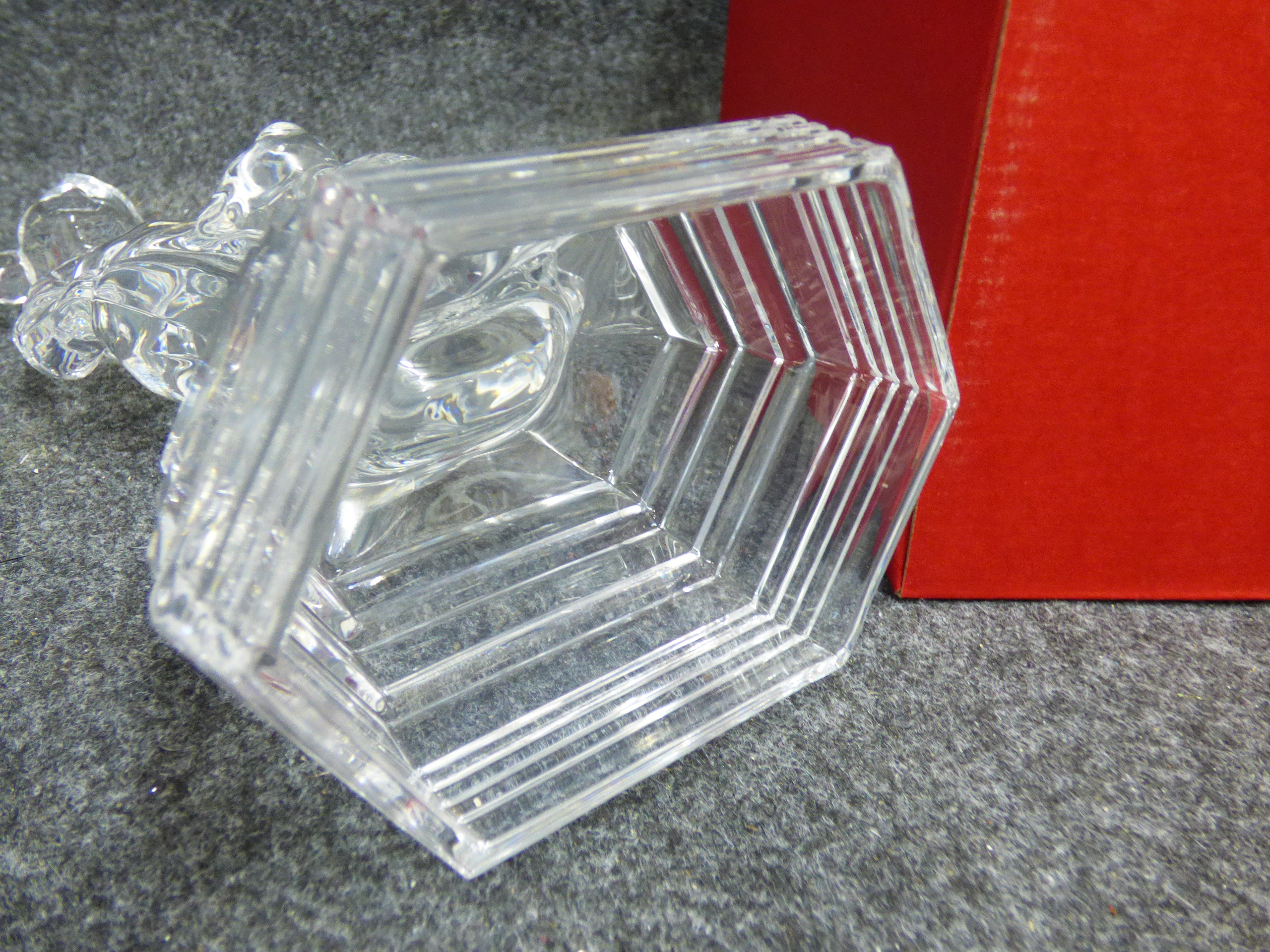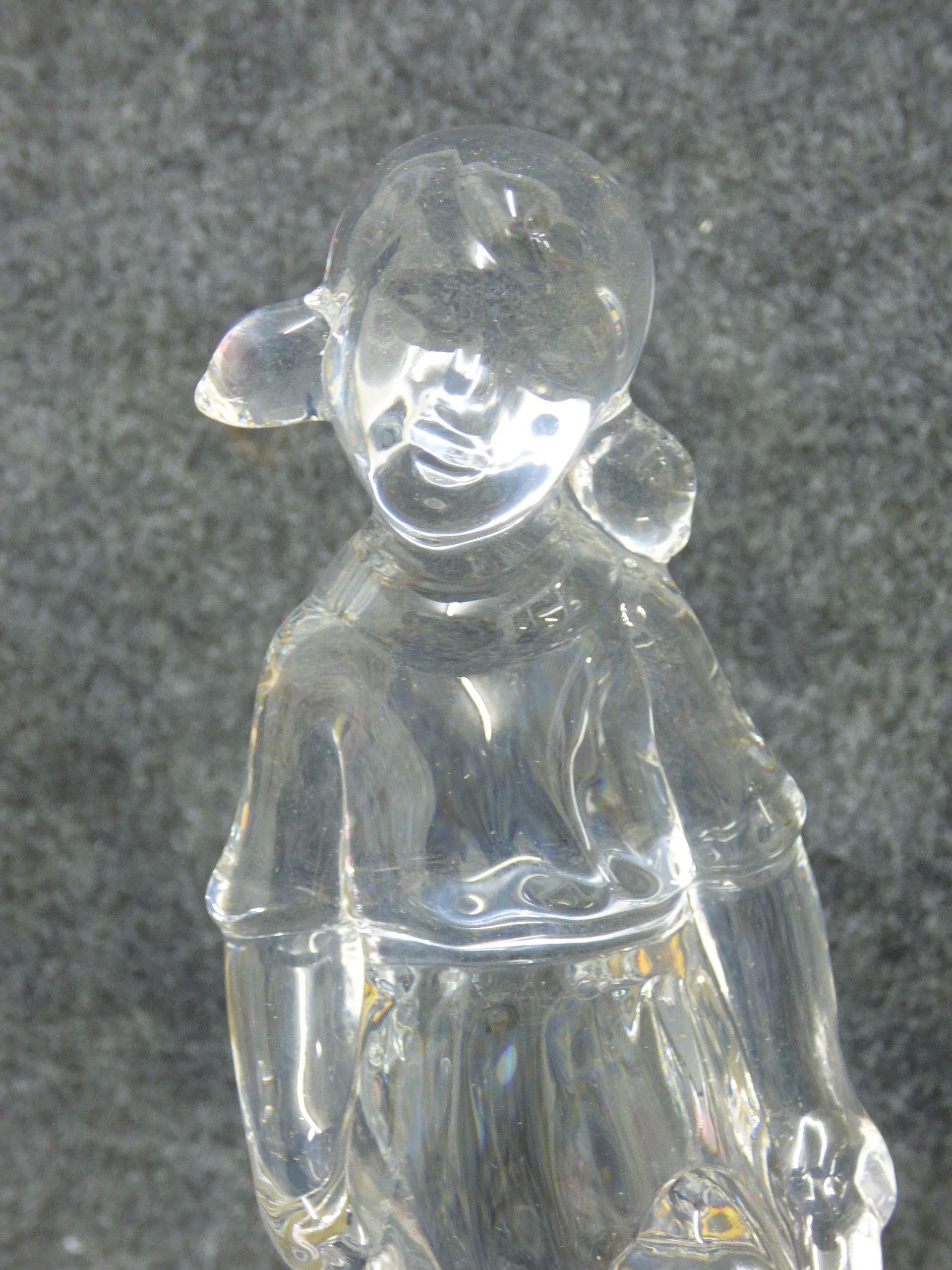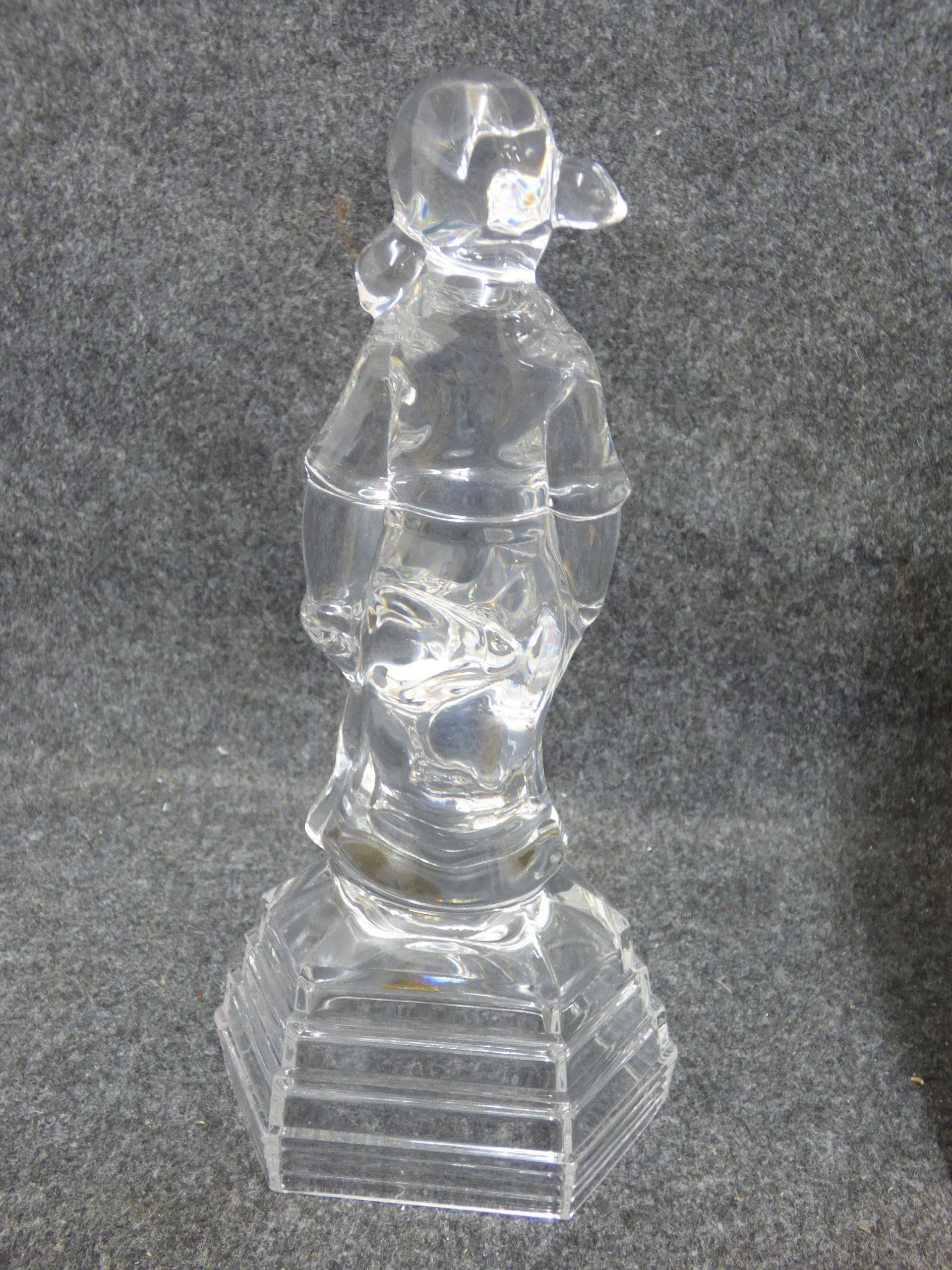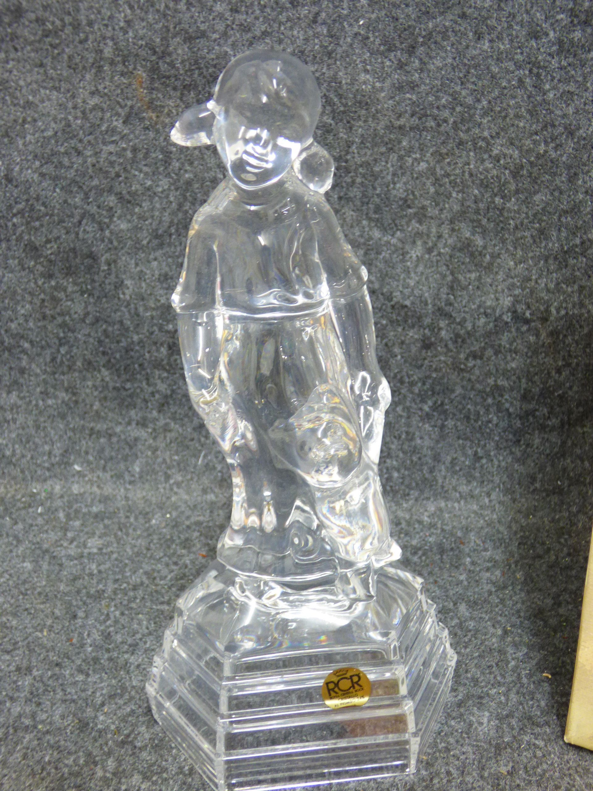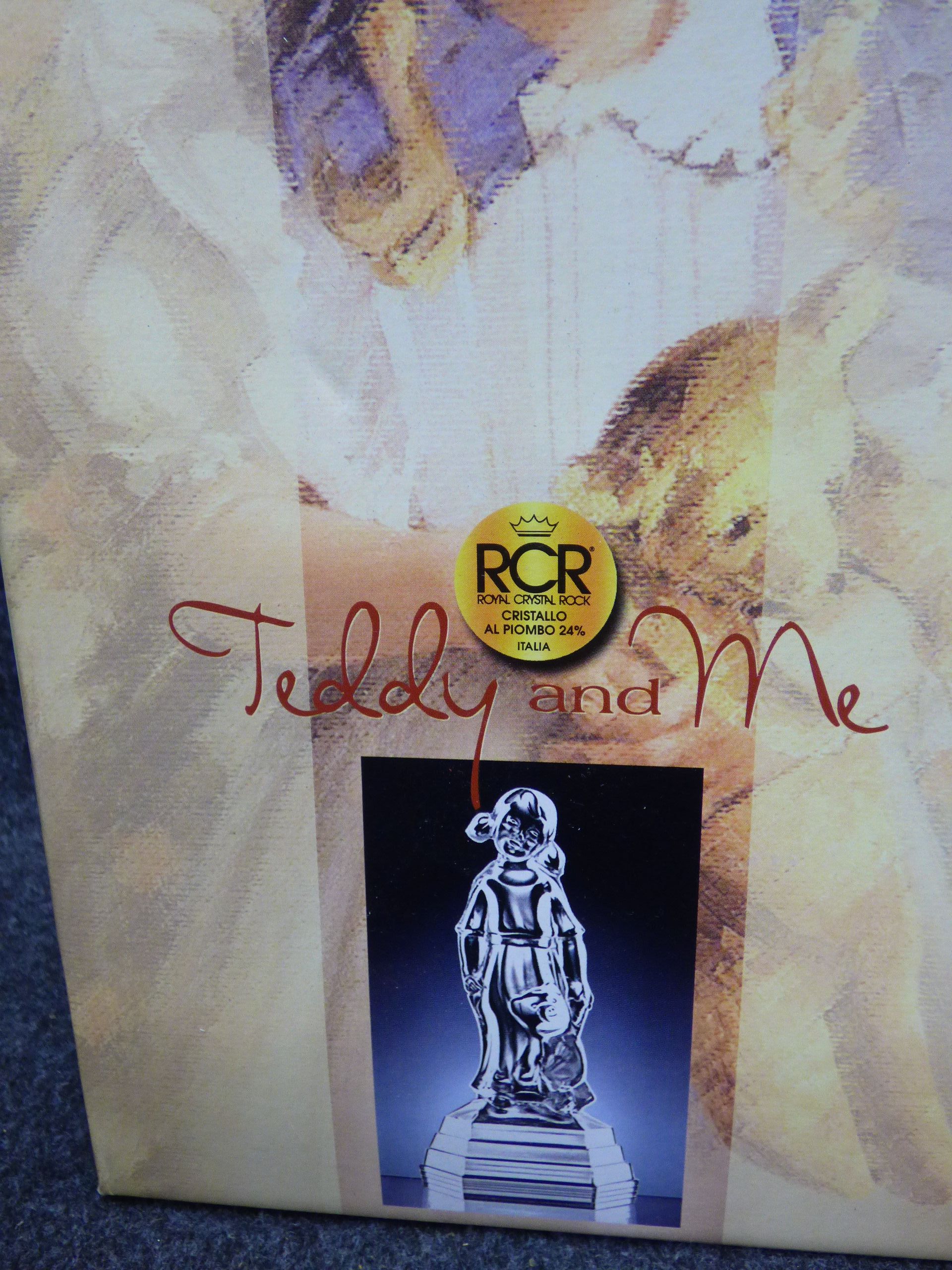 A clear 24% lead crystal figurine titled Teddy and Me featuring a girl with a teddy bear on a tiered base, including the original box and pamphlet. 24.5cm tall