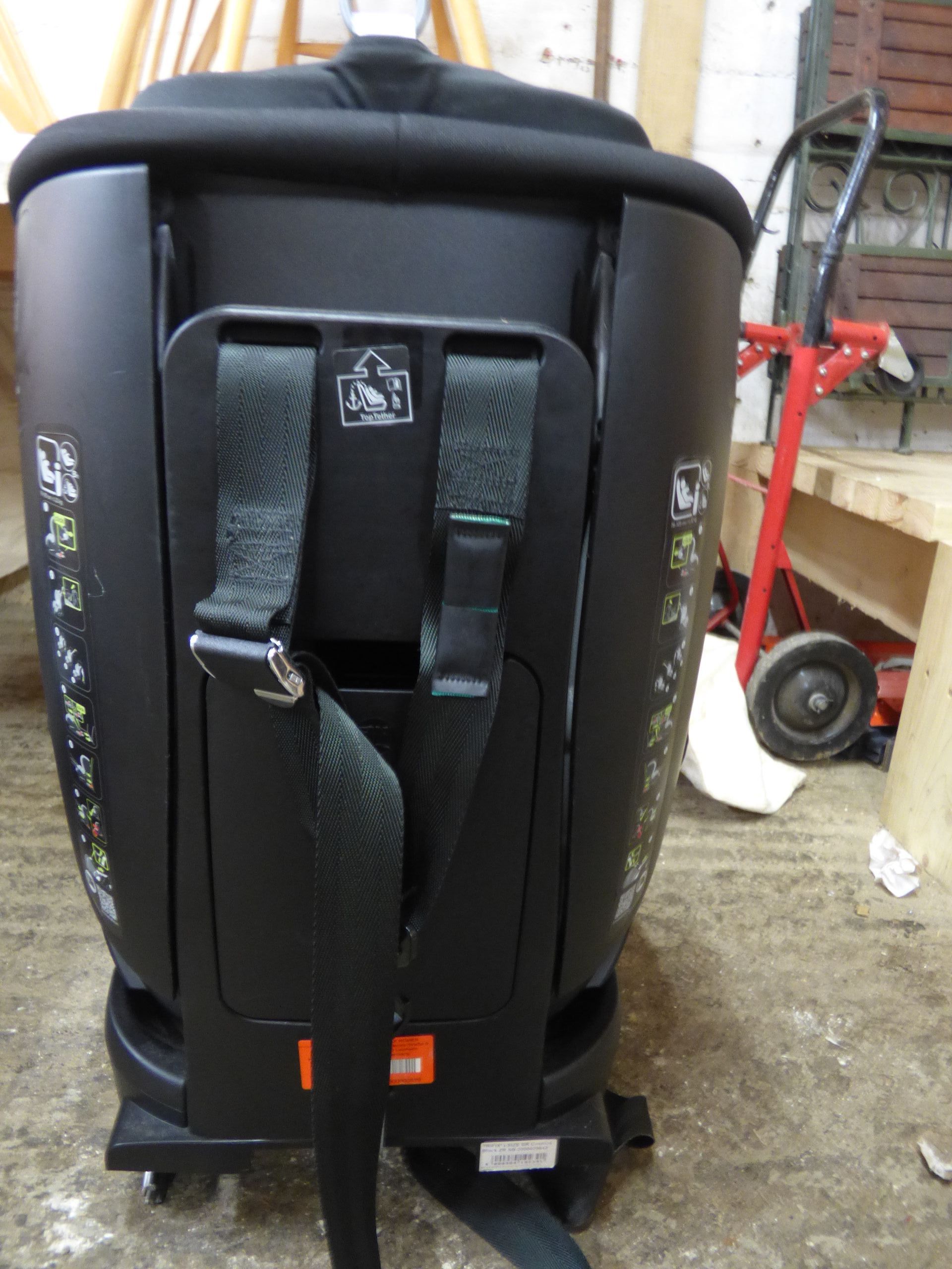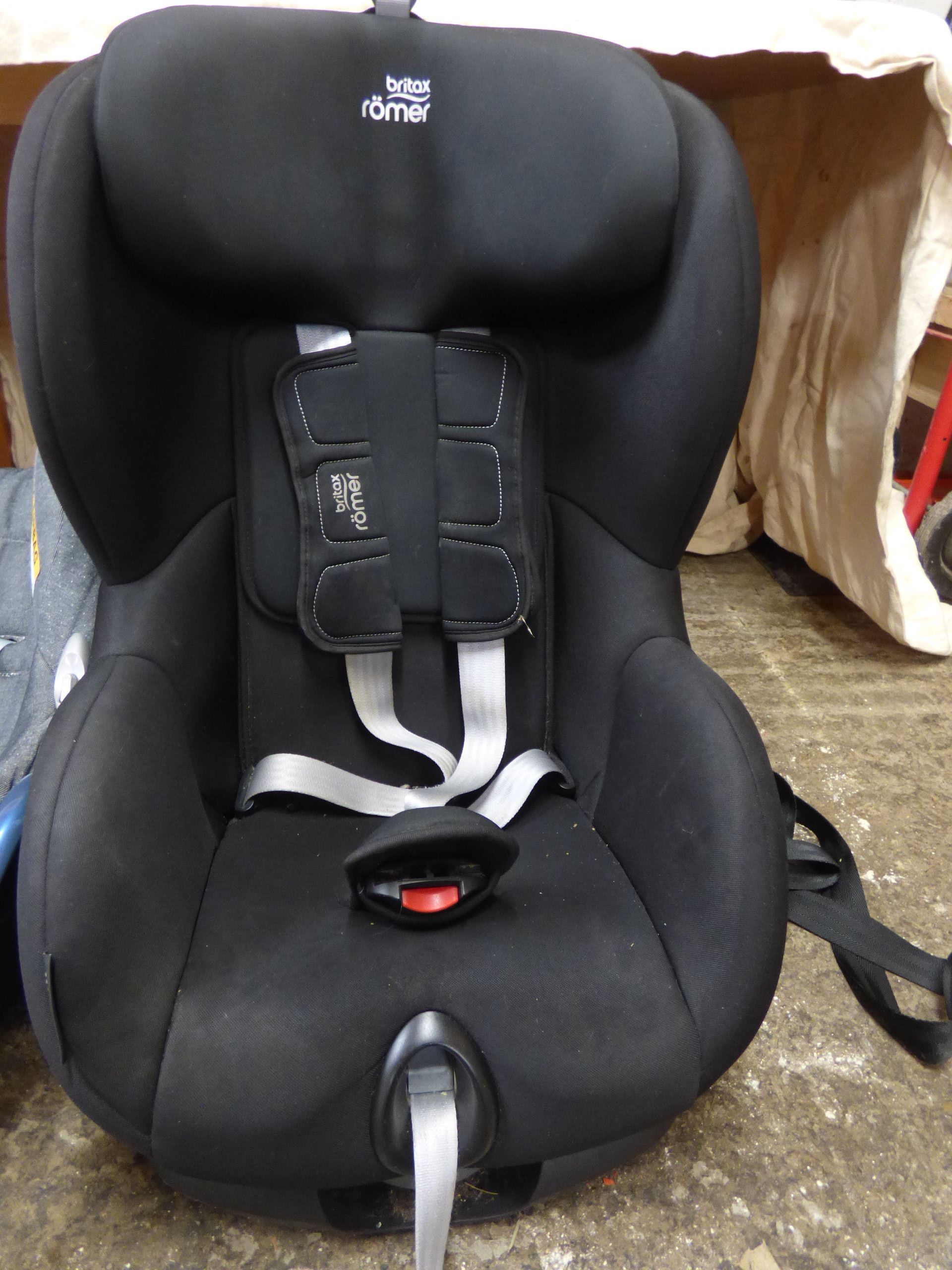 Two child car seats featuring a black Britax Römer seat with SICT inside technology and a grey Maxi-Cosi CabrioFix infant carrier.