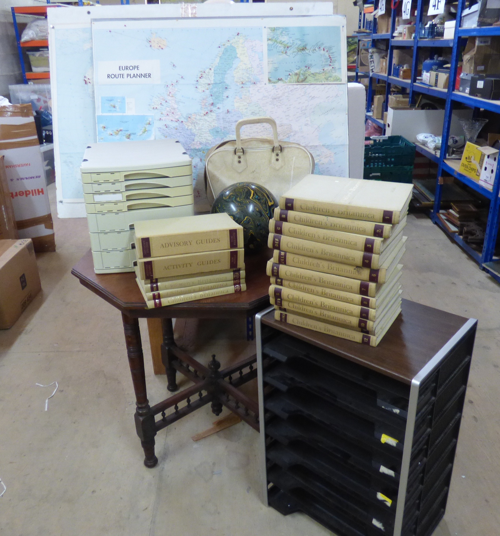 A group lot comprising a brown octagonal wooden table, a collection of cream-coloured books titled Children’s Britannica, Advisory Guides, and Activity Guides, a cream bowling bag with a swirled blue and yellow bowling ball, two desk organisers, and a large wall map labelled Europe Route Planner.
