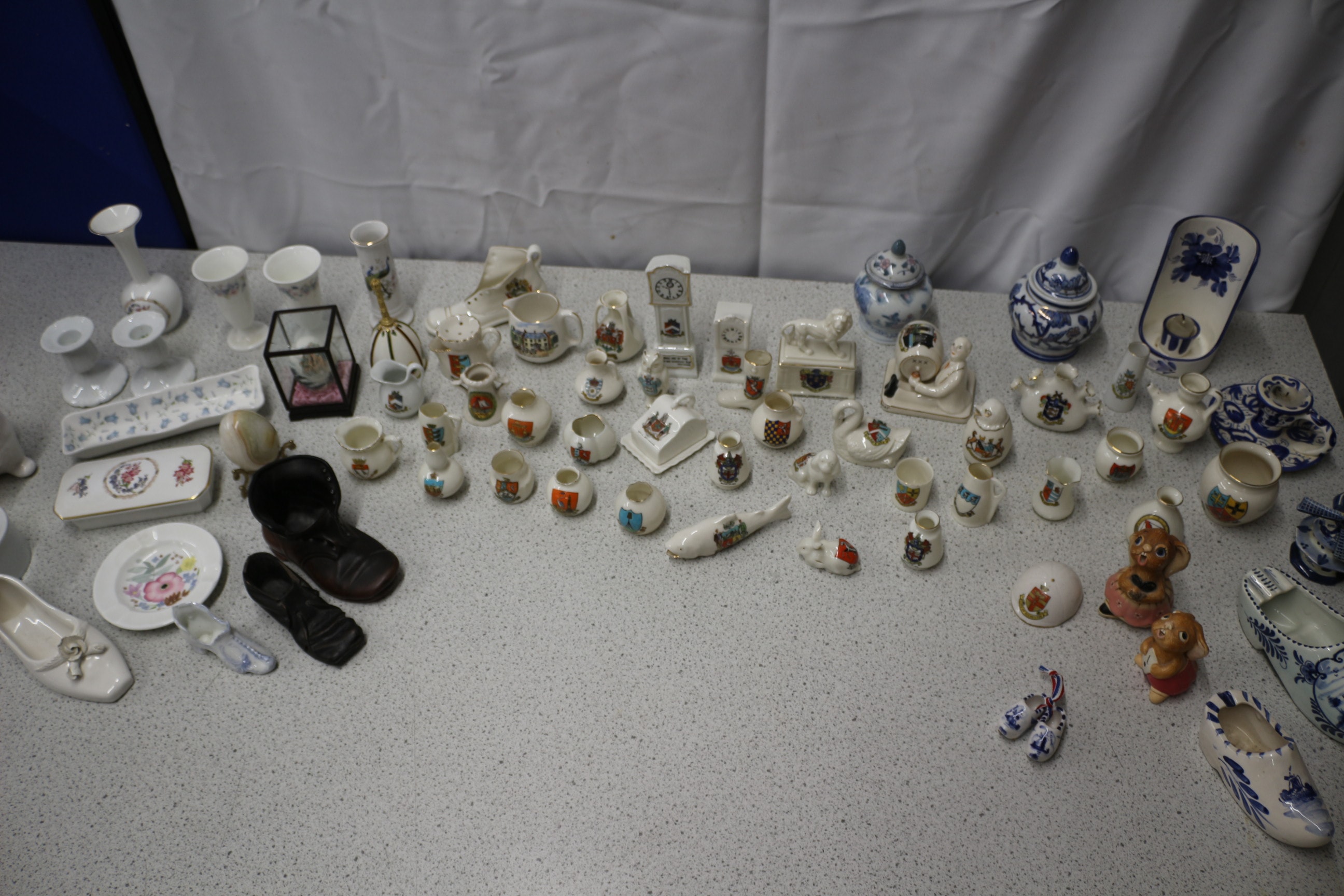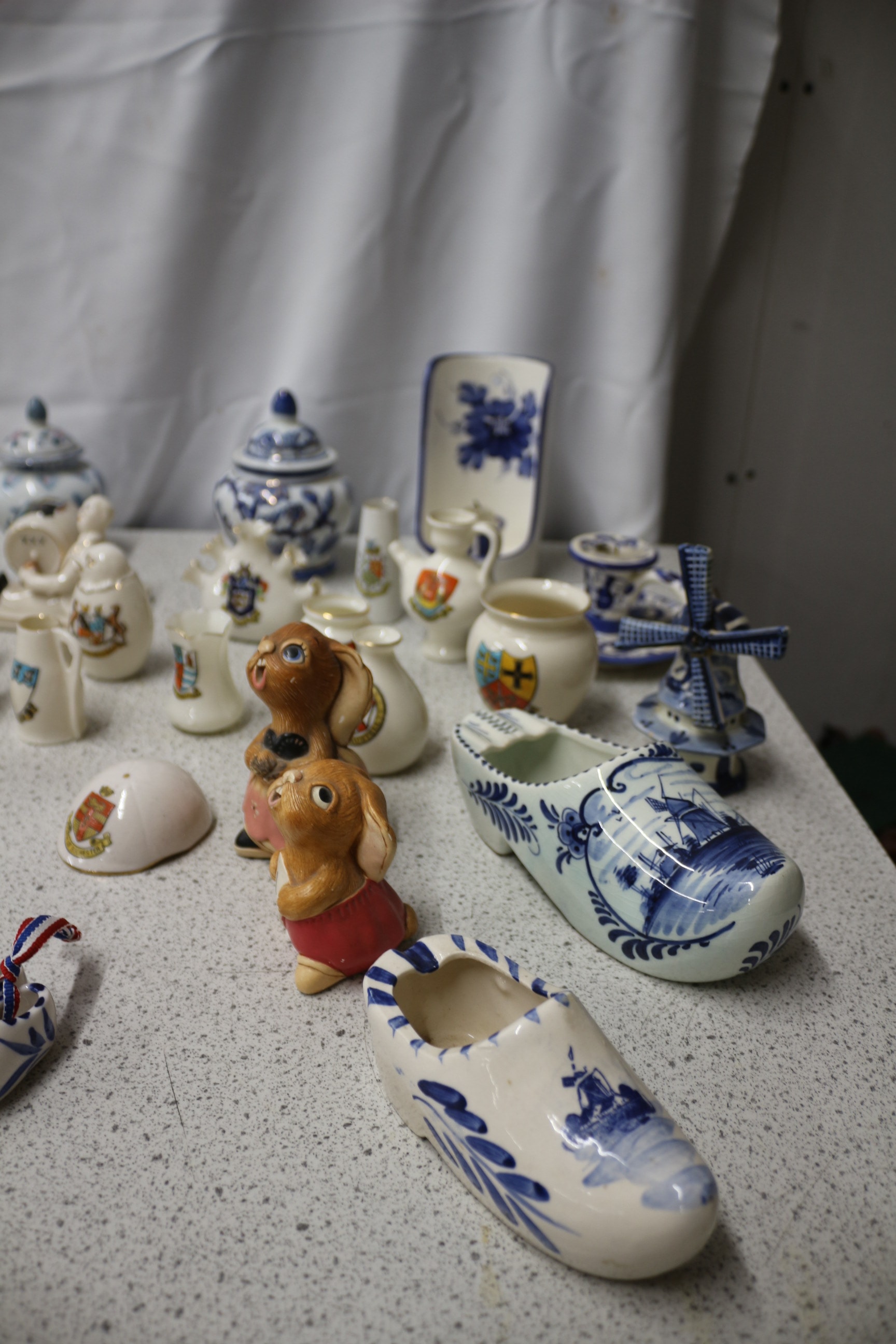 A large collection of approximately 50+ ceramic and porcelain decorative items, primarily white, cream, and blue-and-white, featuring a large white cat, assorted vases, lidded dishes, two pairs of brown ceramic boots, a windmill, Dutch-style clogs, two bunny figurines, a landscape-painted egg in a glass display box, and numerous miniature souvenir jugs, mugs, and figurines with colourful crests and textual identifiers.