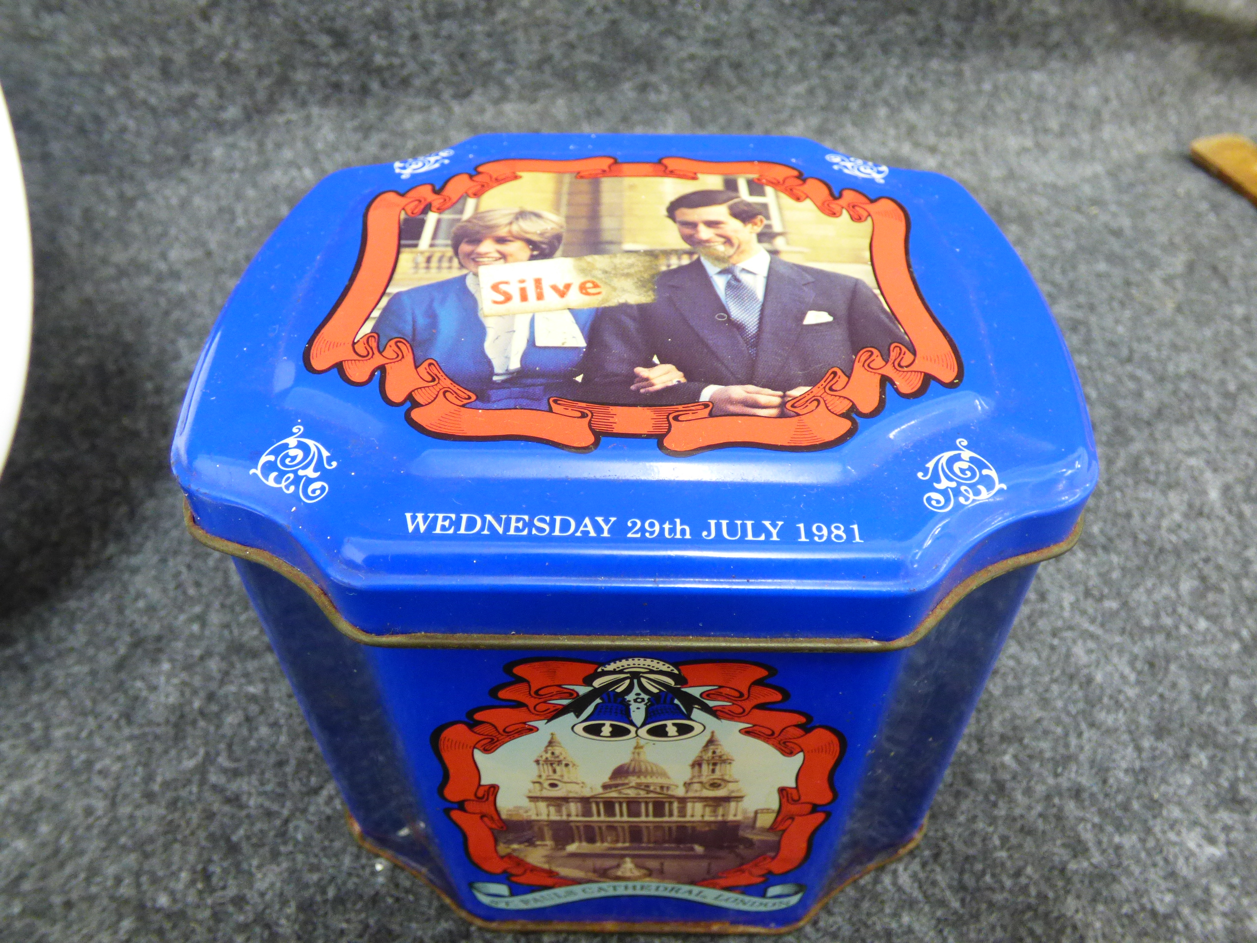 A collection of multi-coloured Diana, Princess of Wales memorabilia including porcelain commemorative plates by Palissy and The Bradford Exchange, a blue 1981 royal wedding tin, several books including Death of a Goddess by David Cohen, and an ITN commemorative video.
