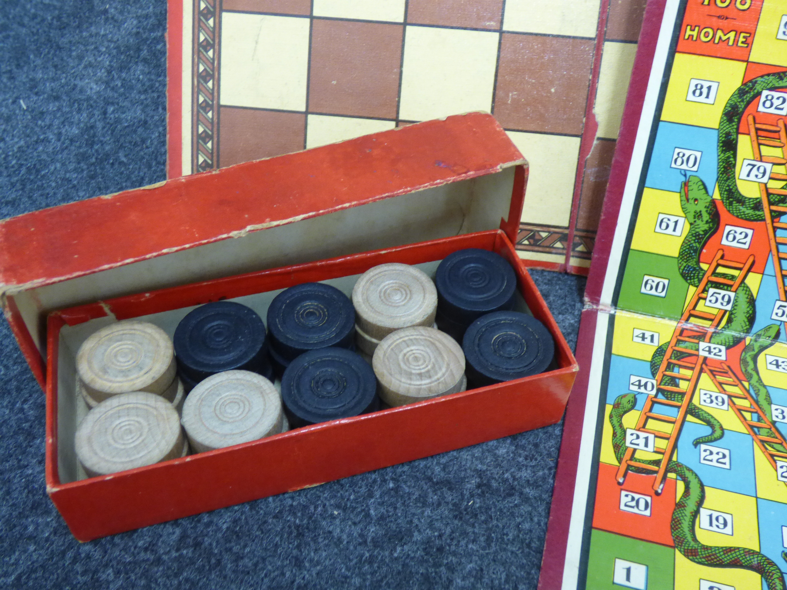 A collection of vintage games featuring a Milton Bradley Easy Money board, a Harlesden Snakes and Ladders board, a checkerboard with wooden pieces, poker dice with a green case, and several decks of playing cards.