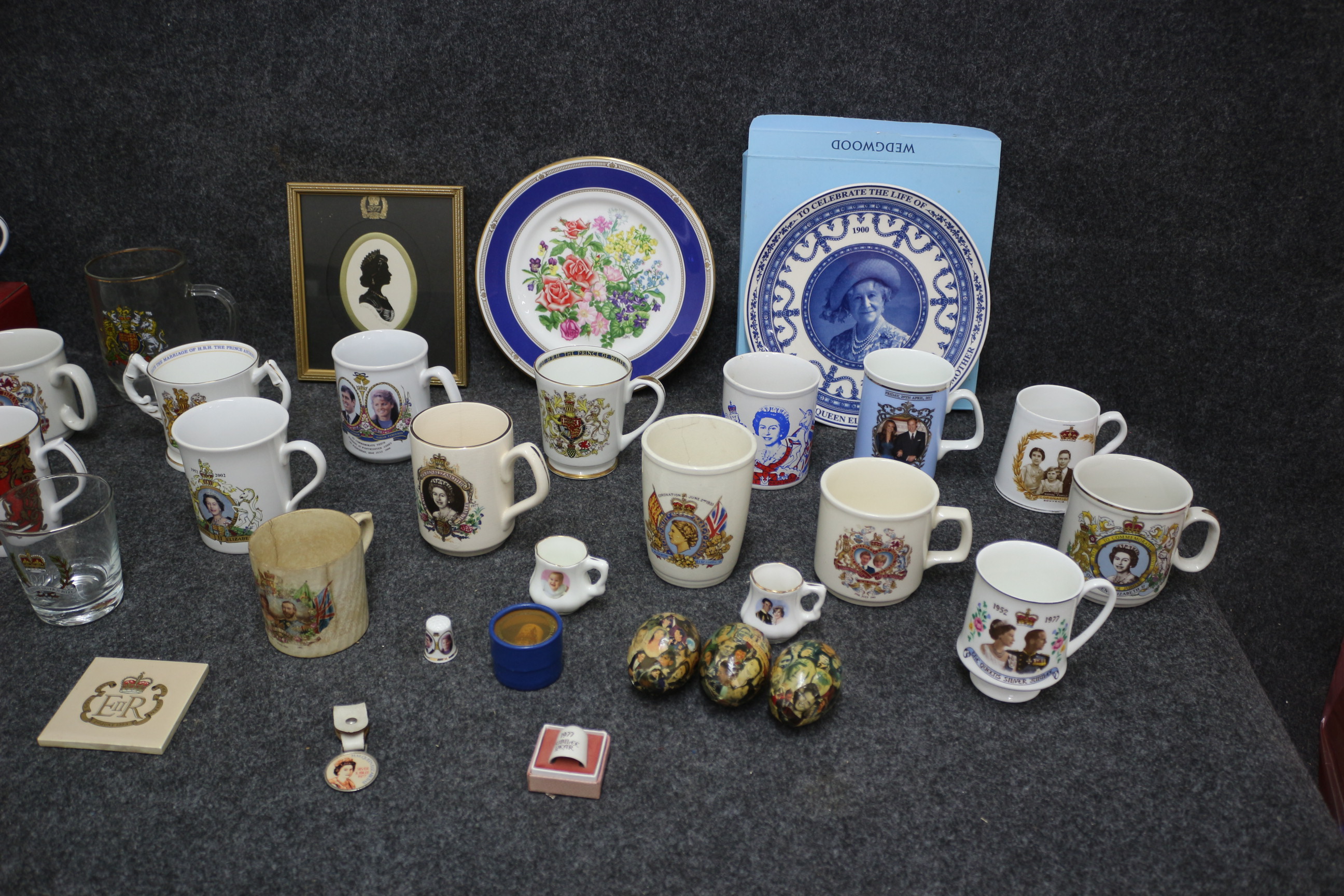 A collection of ceramic and glass commemorative items including mugs, plates, glasses, and trinket boxes featuring various British monarchs and royal events, with visible inscriptions for Adams and Wedgwood.