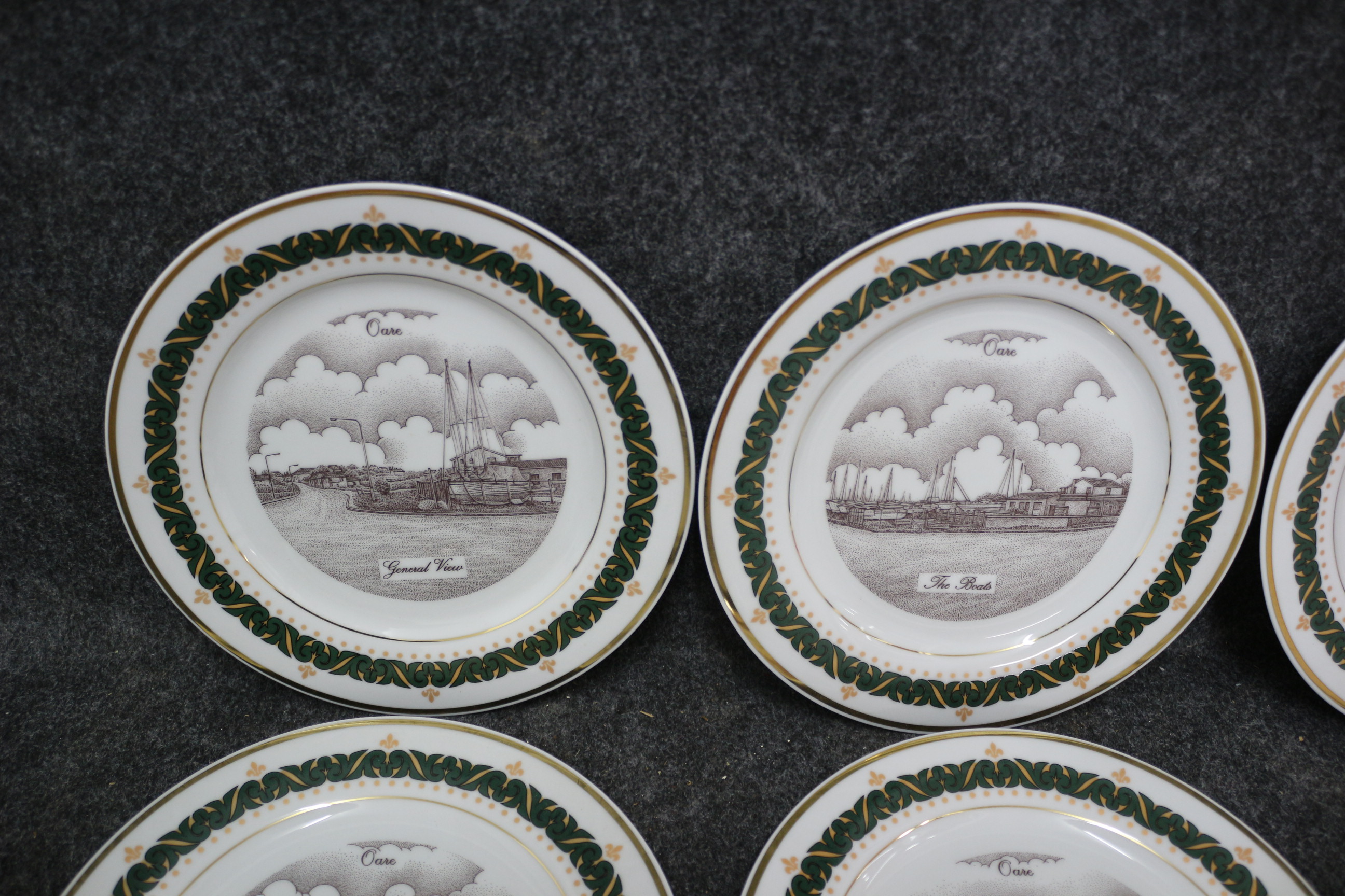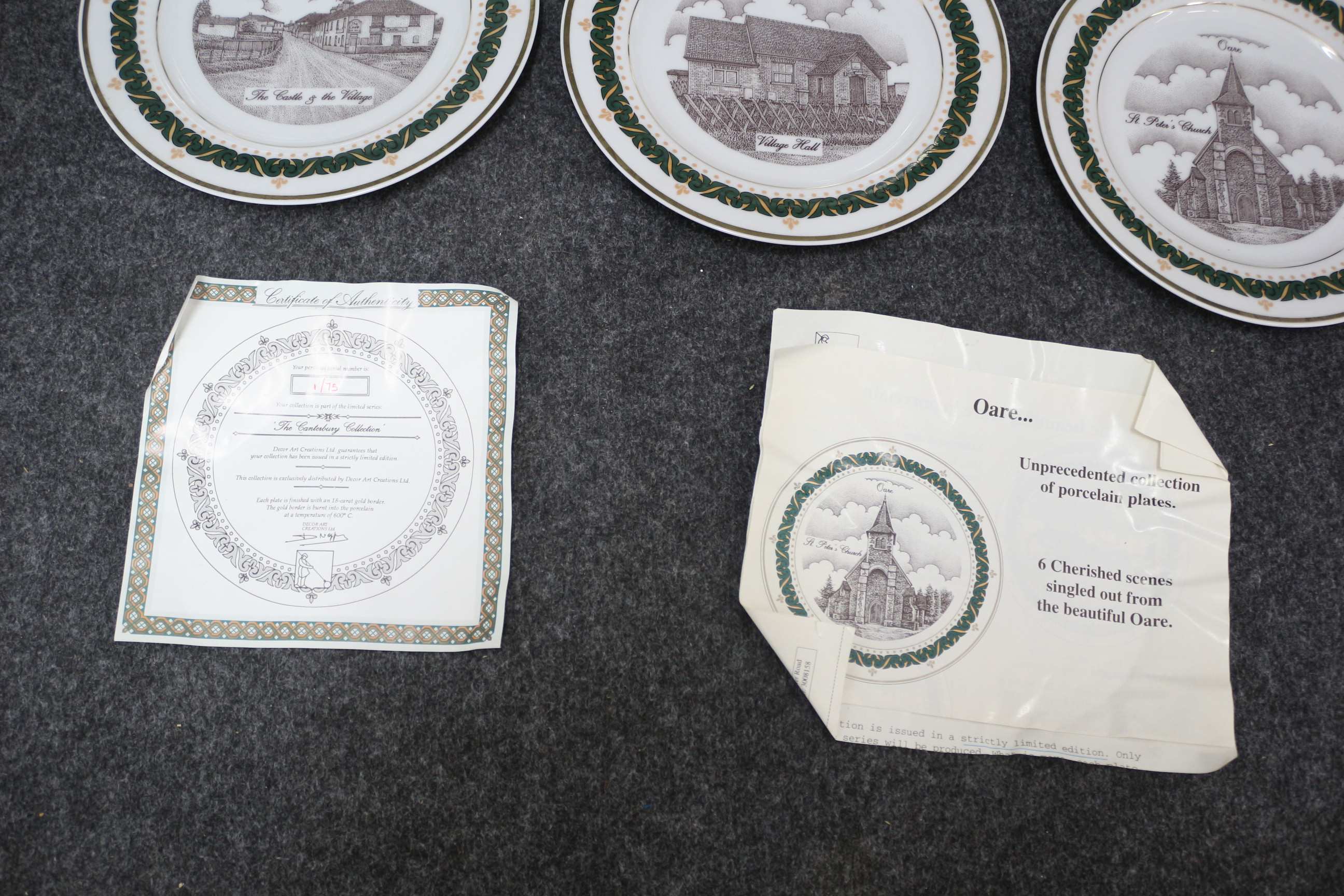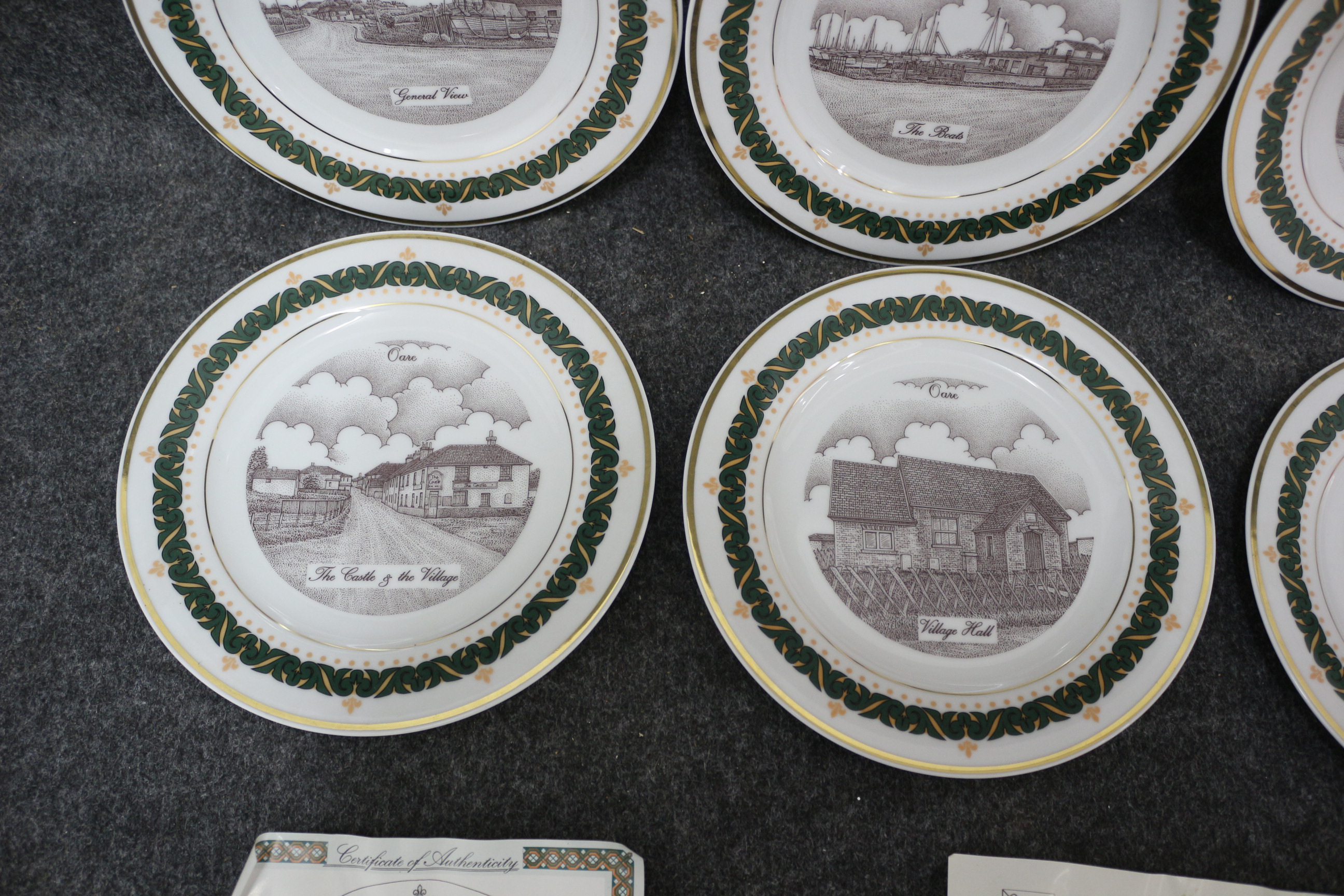 A collection of white porcelain plates from The Canterbury Collection featuring sepia-toned scenes of Oare with green and 18 karat gold borders, including a Certificate of Authenticity from Decor Art Creations Ltd. 1 of 75