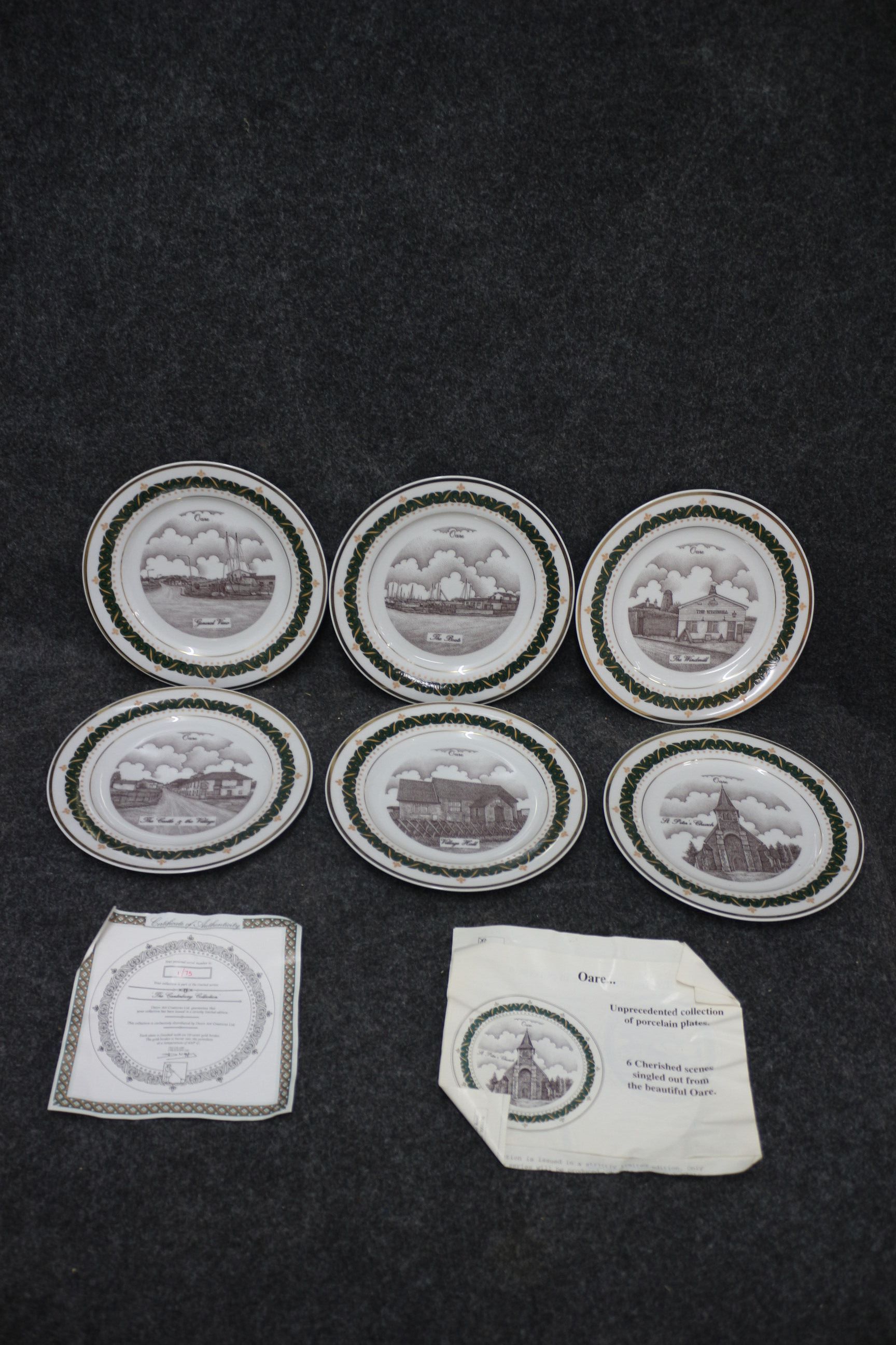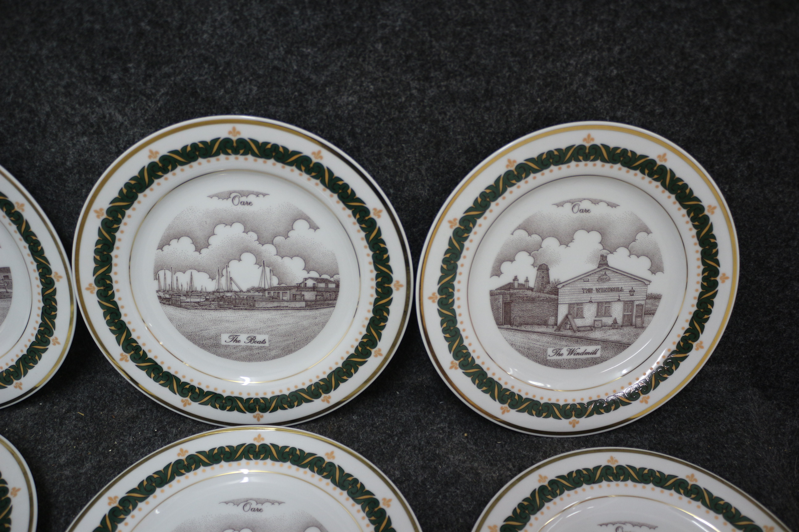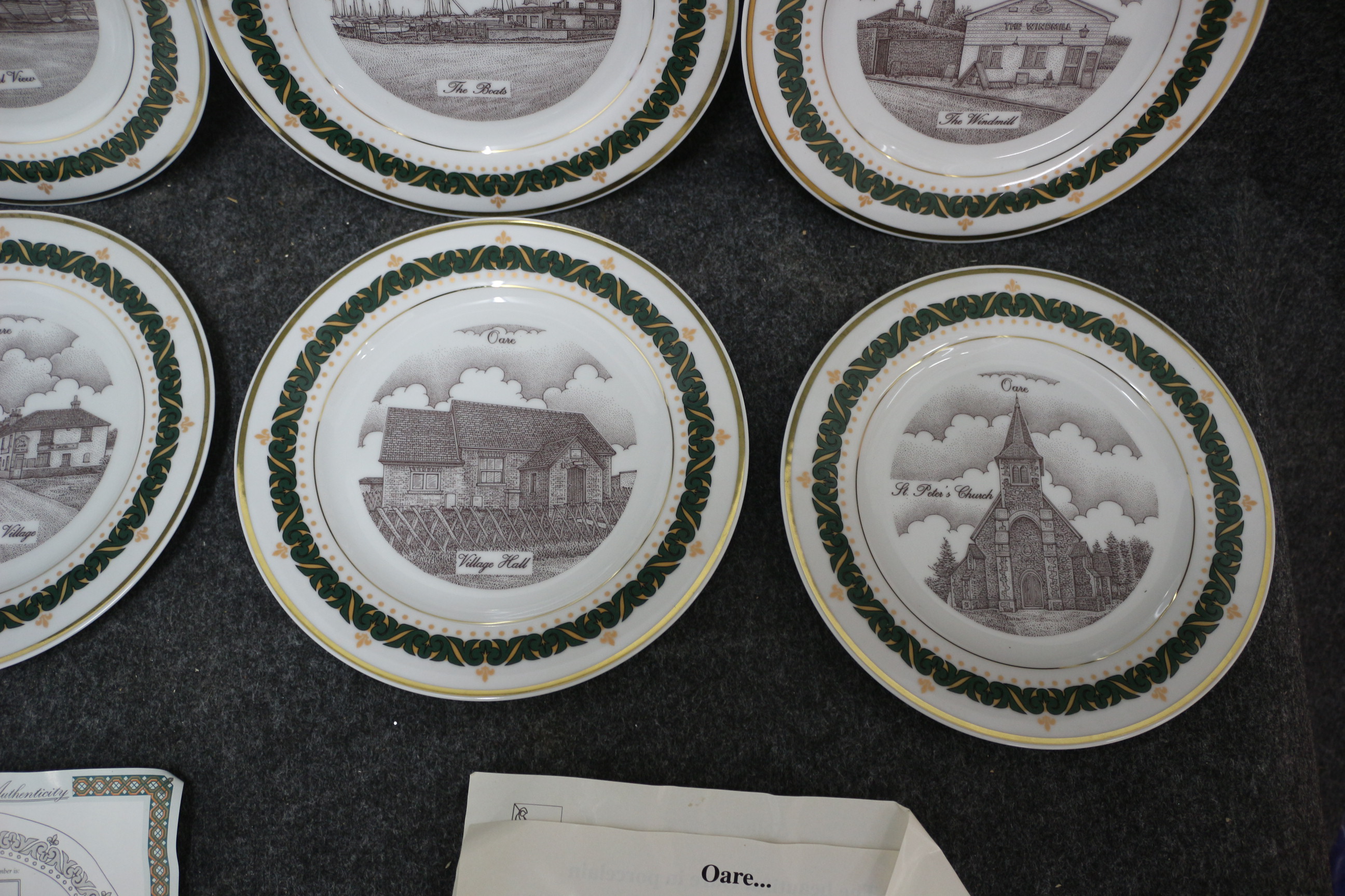 A collection of white porcelain plates from The Canterbury Collection featuring sepia-toned scenes of Oare with green and 18 karat gold borders, including a Certificate of Authenticity from Decor Art Creations Ltd. 1 of 75