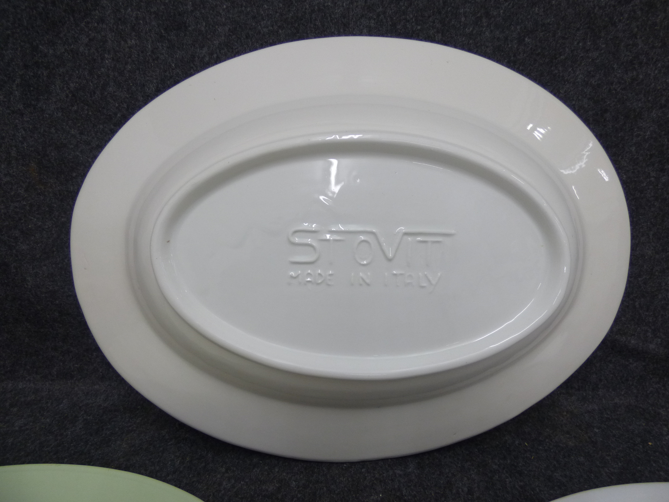 A collection of three ceramic serving pieces including a white pasta platter with embossed rim details marked Stovit Made in Italy and two additional oval platters in white and pale green. Largest 46cm wide