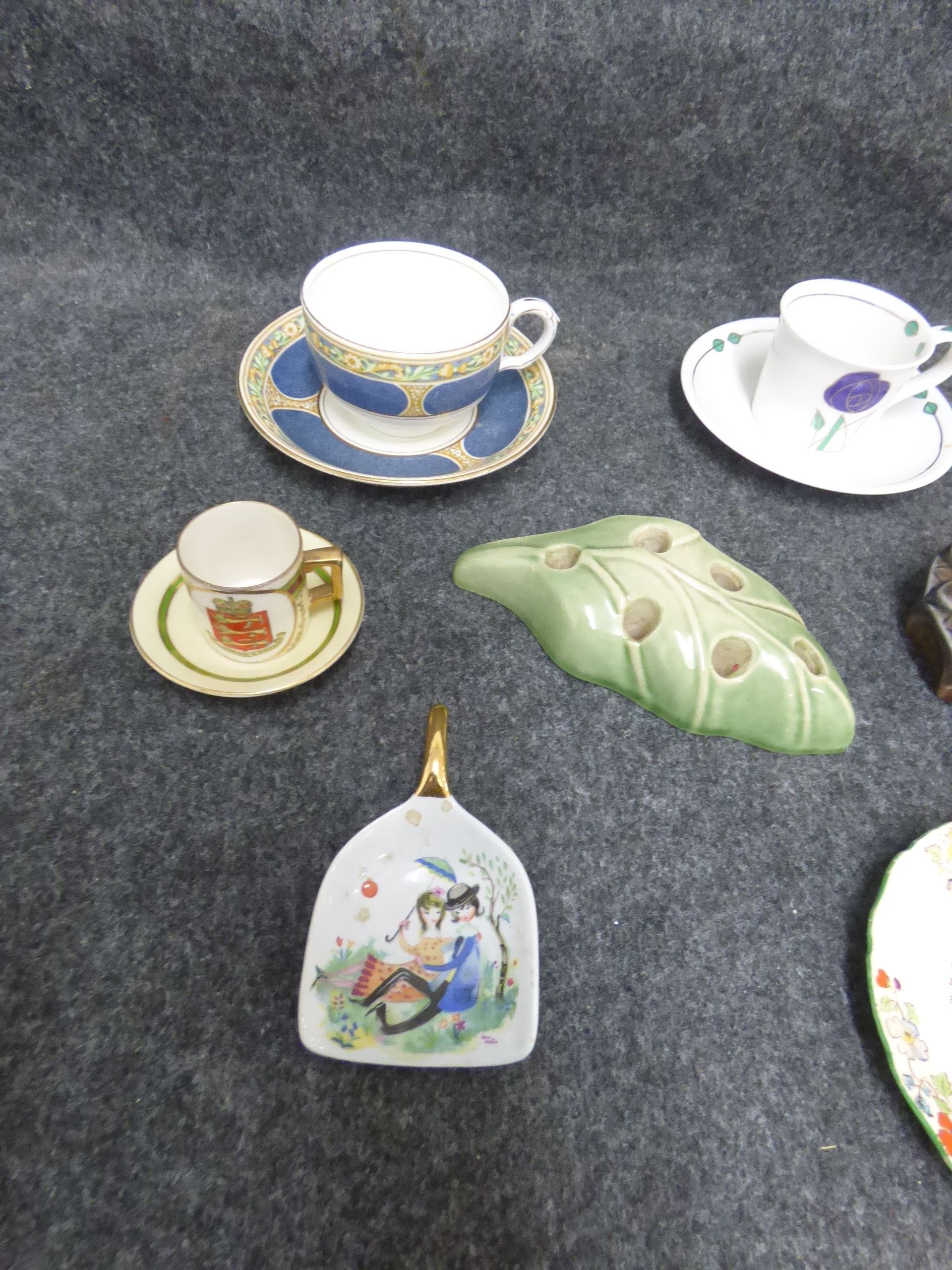 A collection of ceramic and porcelain items including Blackbird pie funnels, a Mason’s Green Bible plate, assorted cups and saucers, a creamer, and decorative accessories.