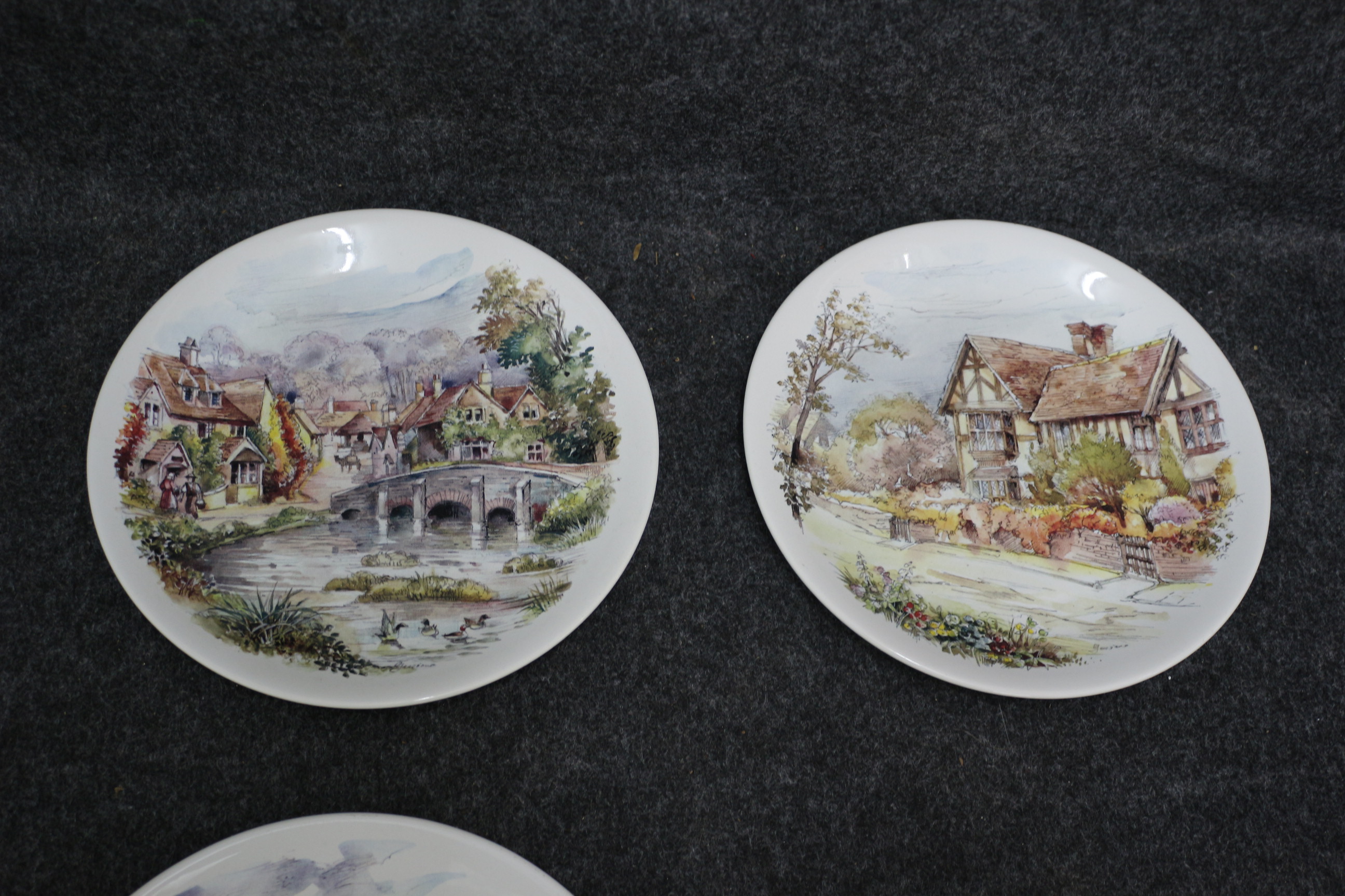 A collection of white ceramic decorative plates featuring multicoloured illustrations of English cottages, landscapes, and puppies, each marked Poole England on the reverse.