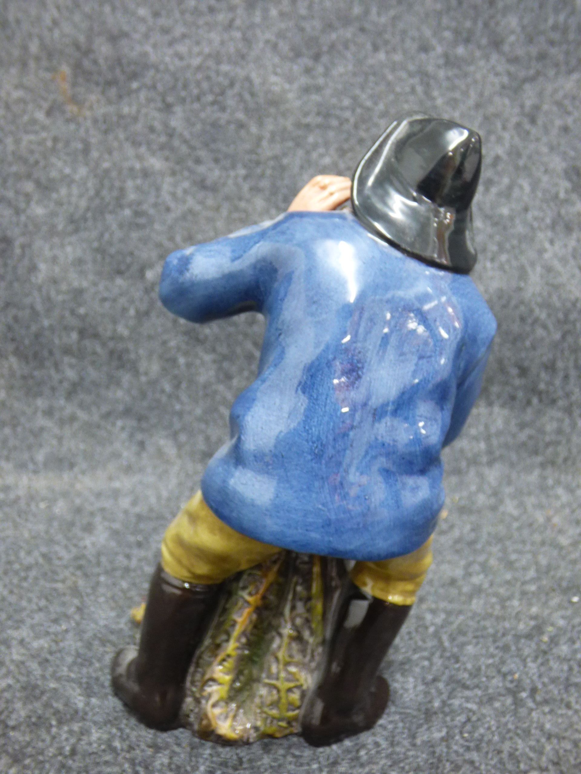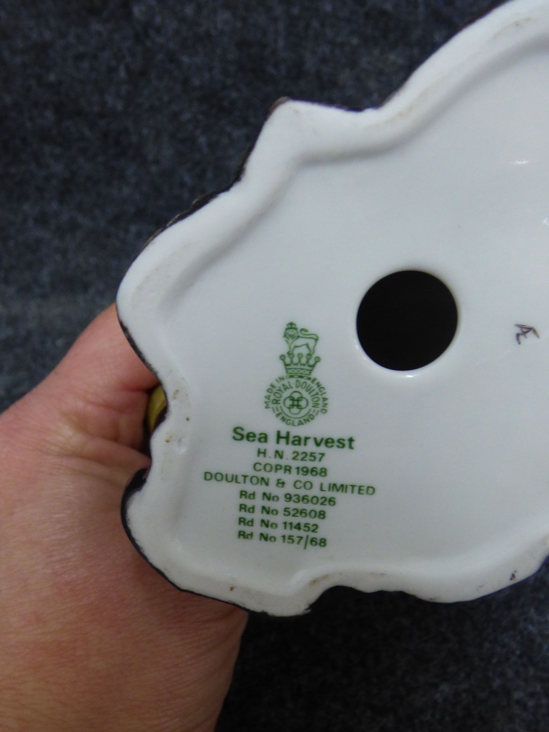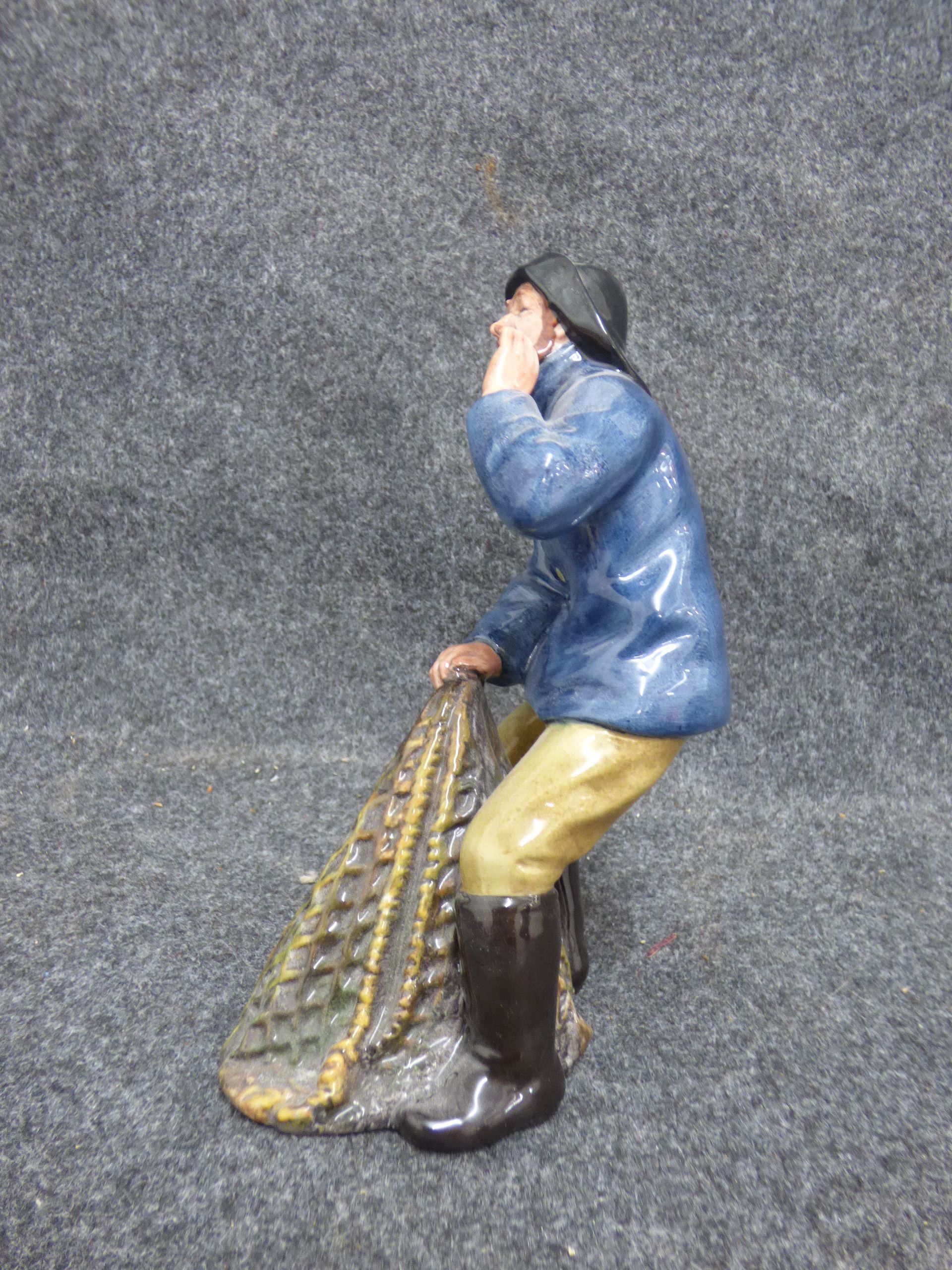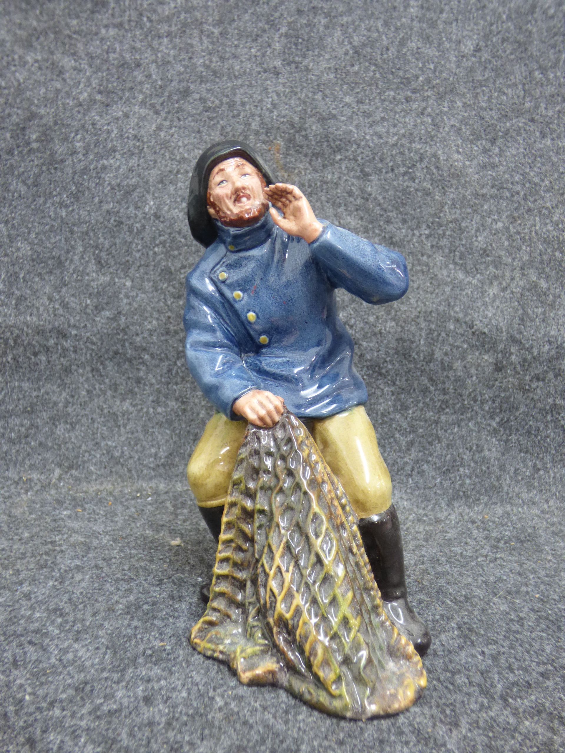 A Royal Doulton porcelain figurine titled Sea Harvest depicting a fisherman in a blue jacket and yellow trousers holding a fishing net. 19cm tall