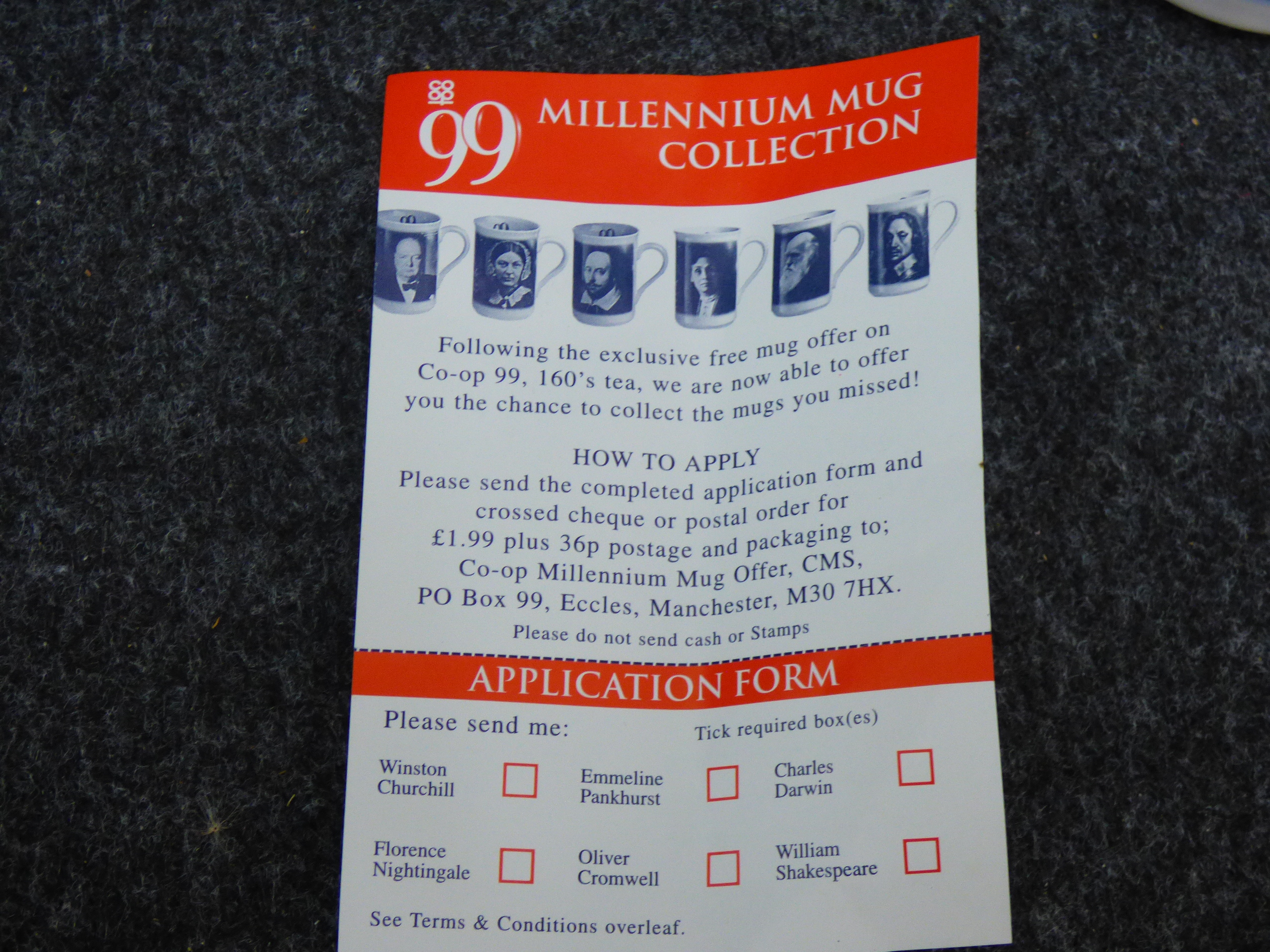 A collection of the Complete Set of blue and white ceramic mugs depicting historical figures, accompanied by an original box and promotional application form.
