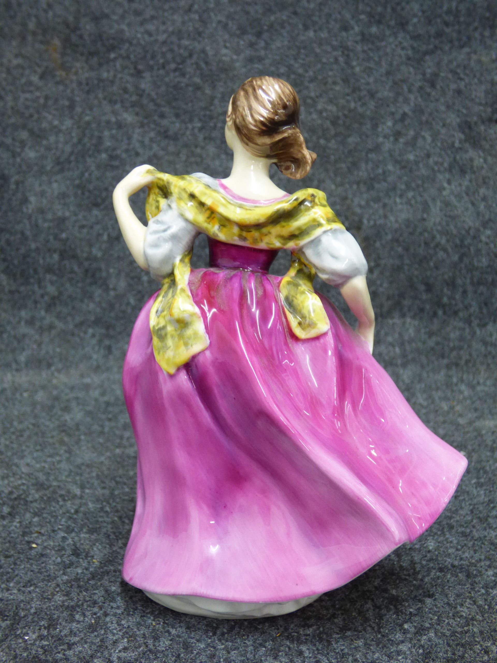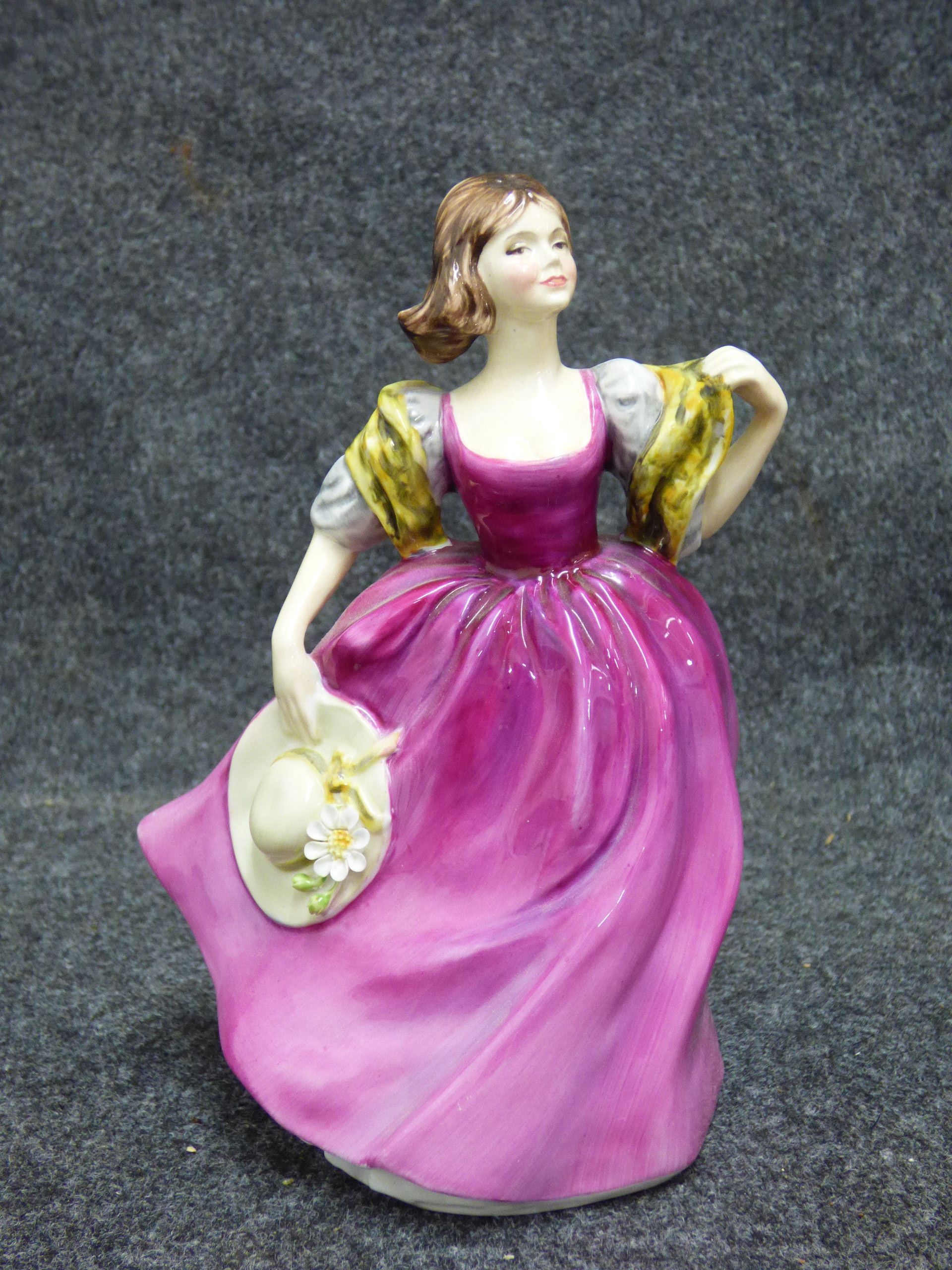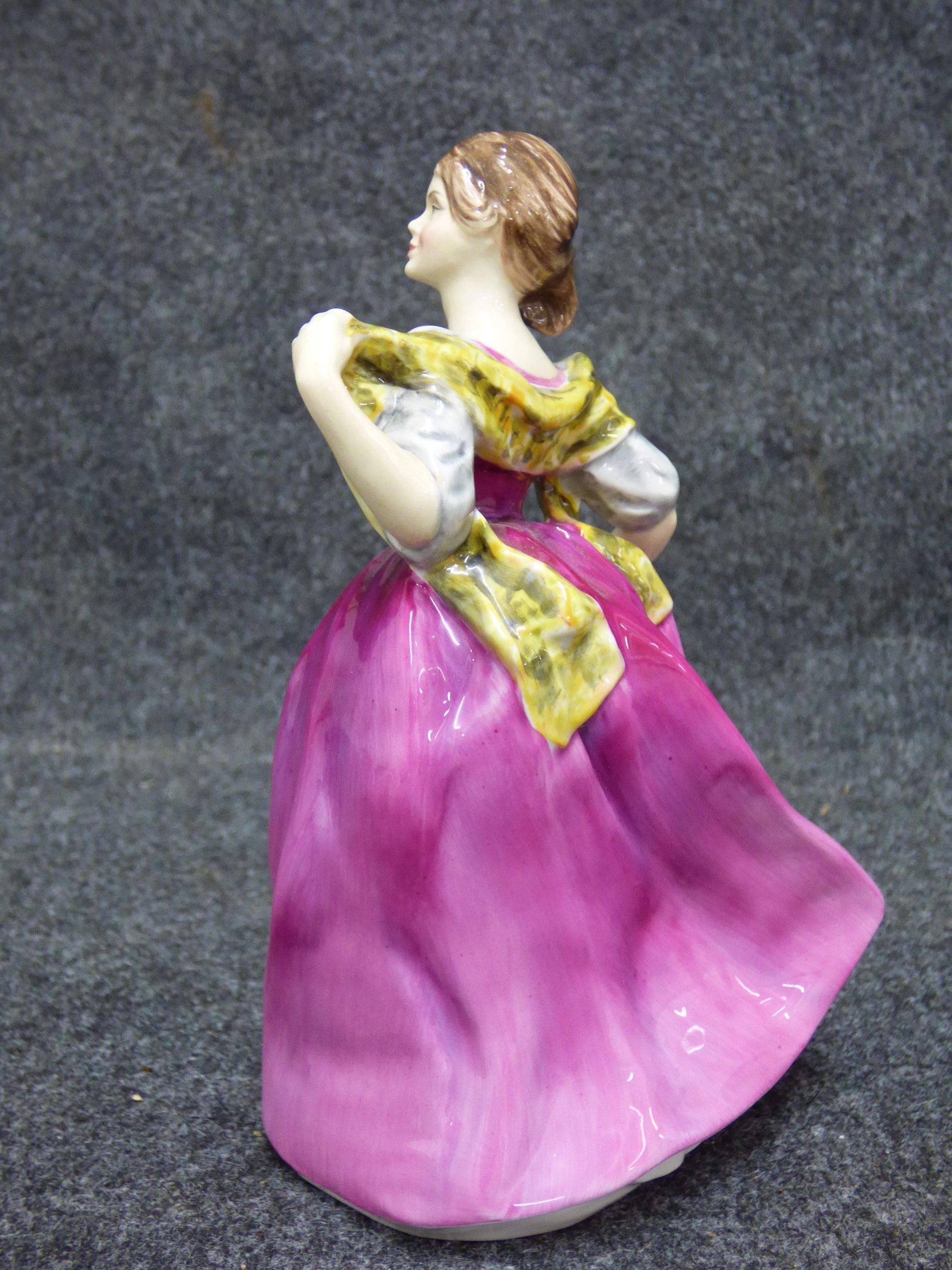 A fine English bone china figurine of a woman named Kathy wearing a purple dress and yellow shawl, with a base marked Renaissance and inscribed Frank Sant. 17cm tall