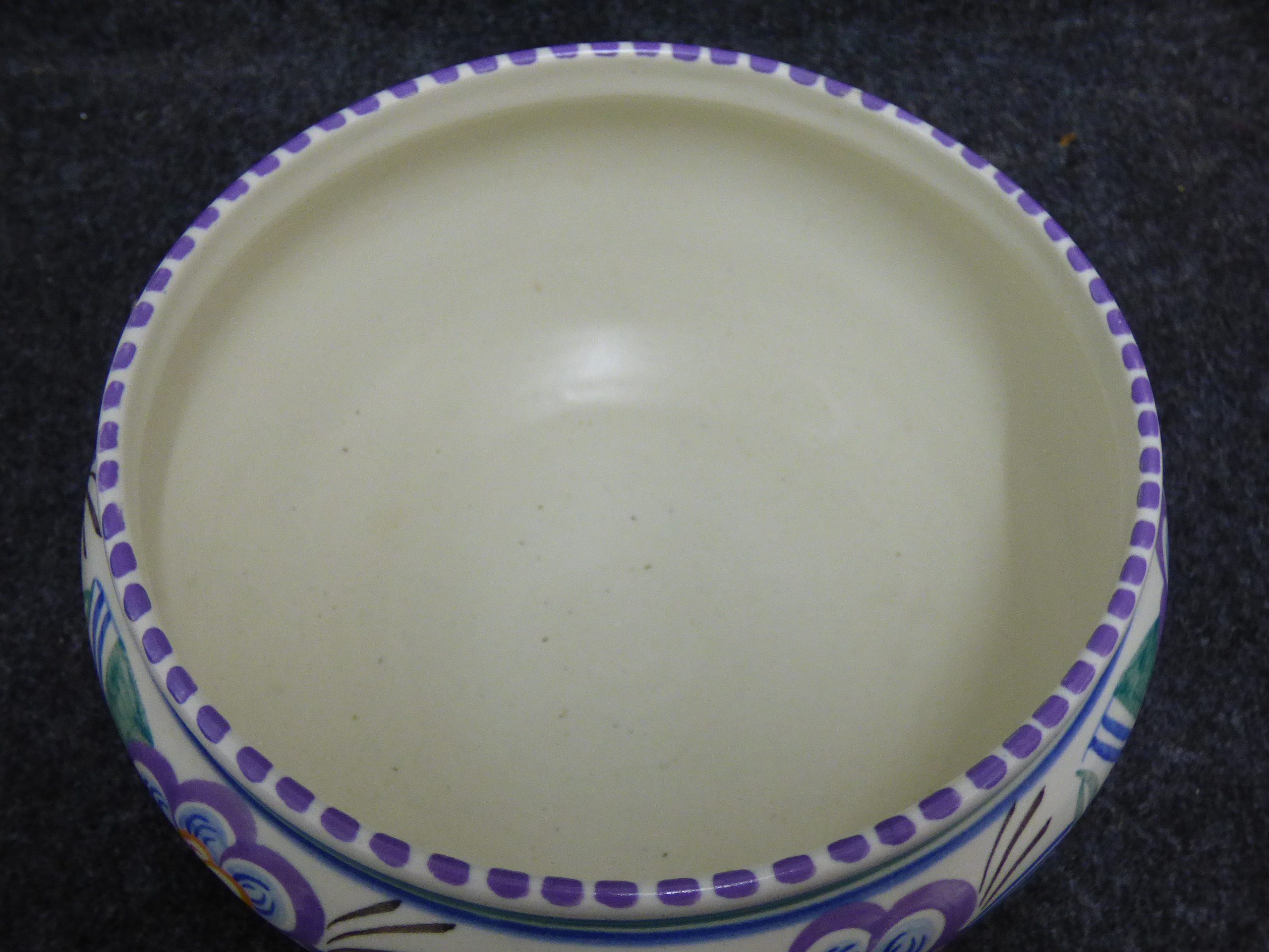 A cream ceramic bowl featuring a hand-painted multi-coloured floral pattern with a purple dotted rim, marked Poole England and 423 on the base. 19cm Dia