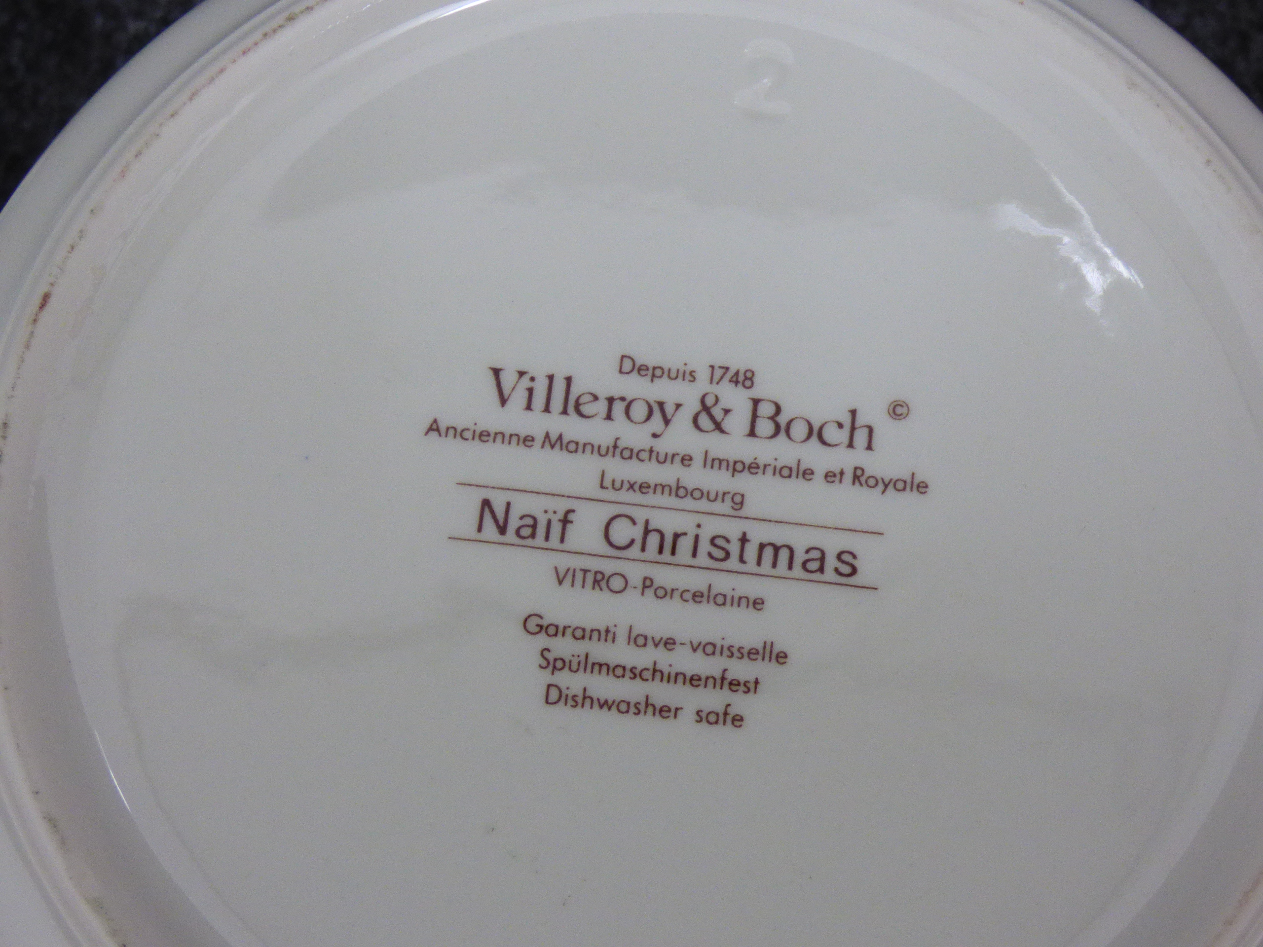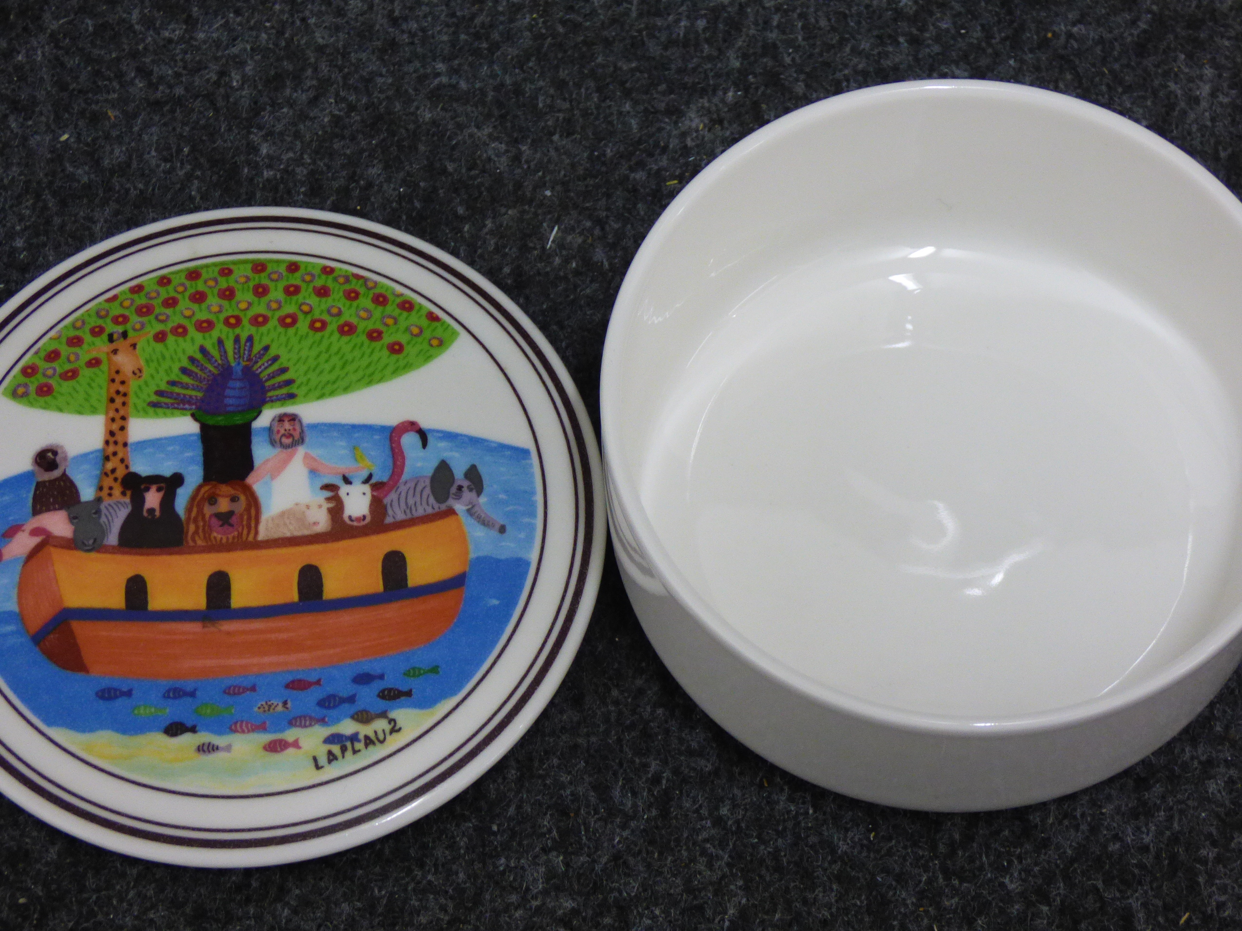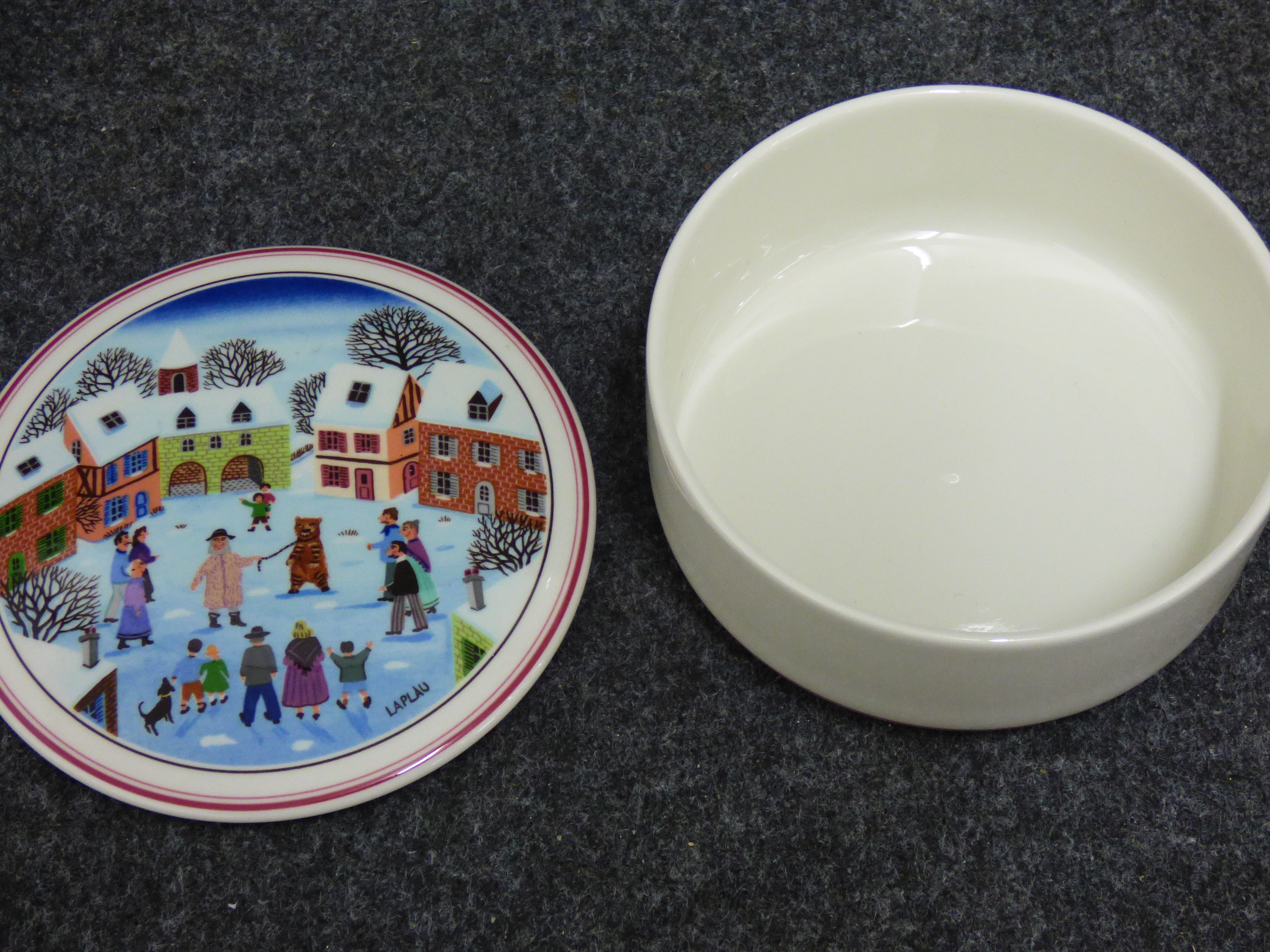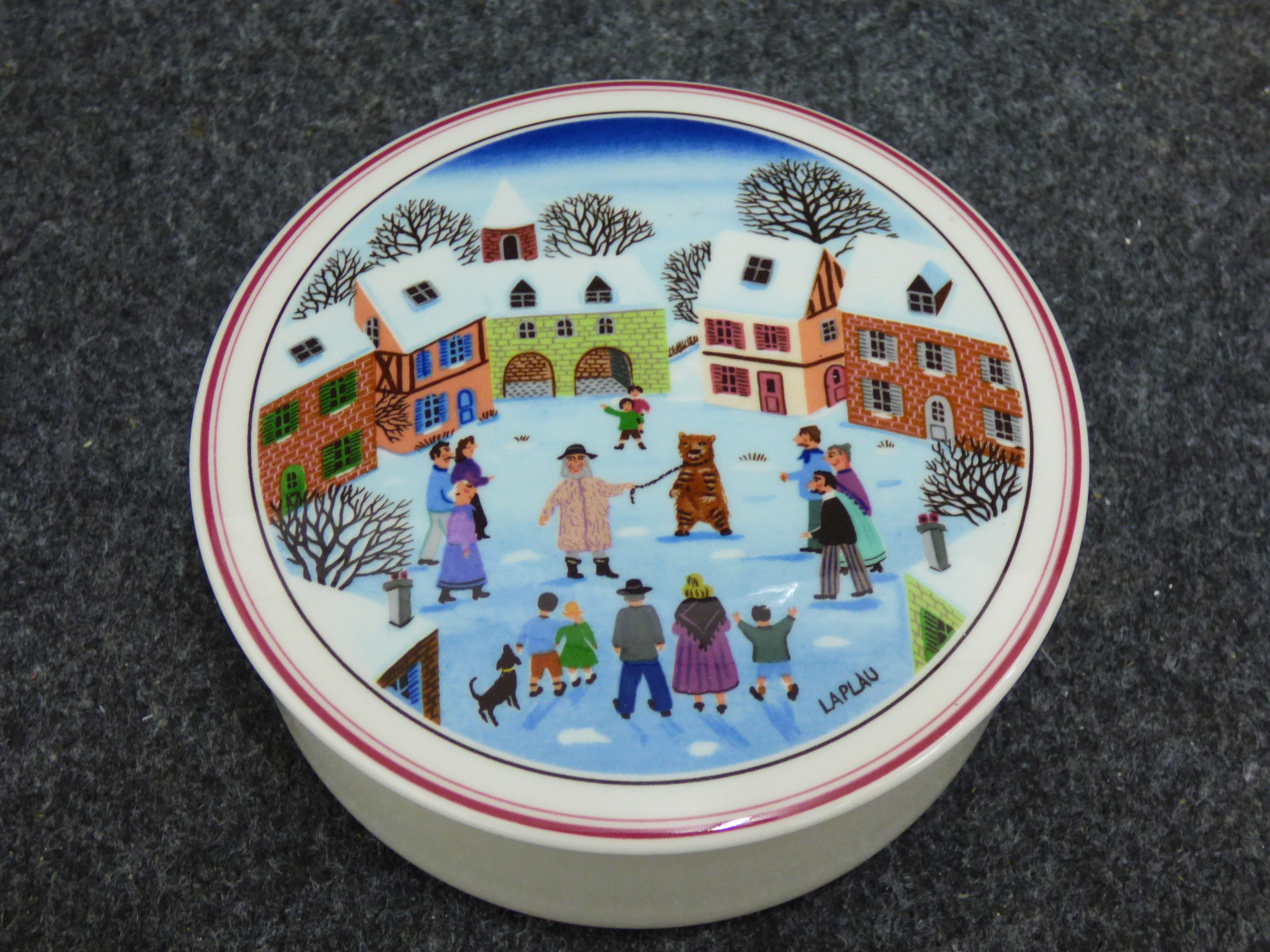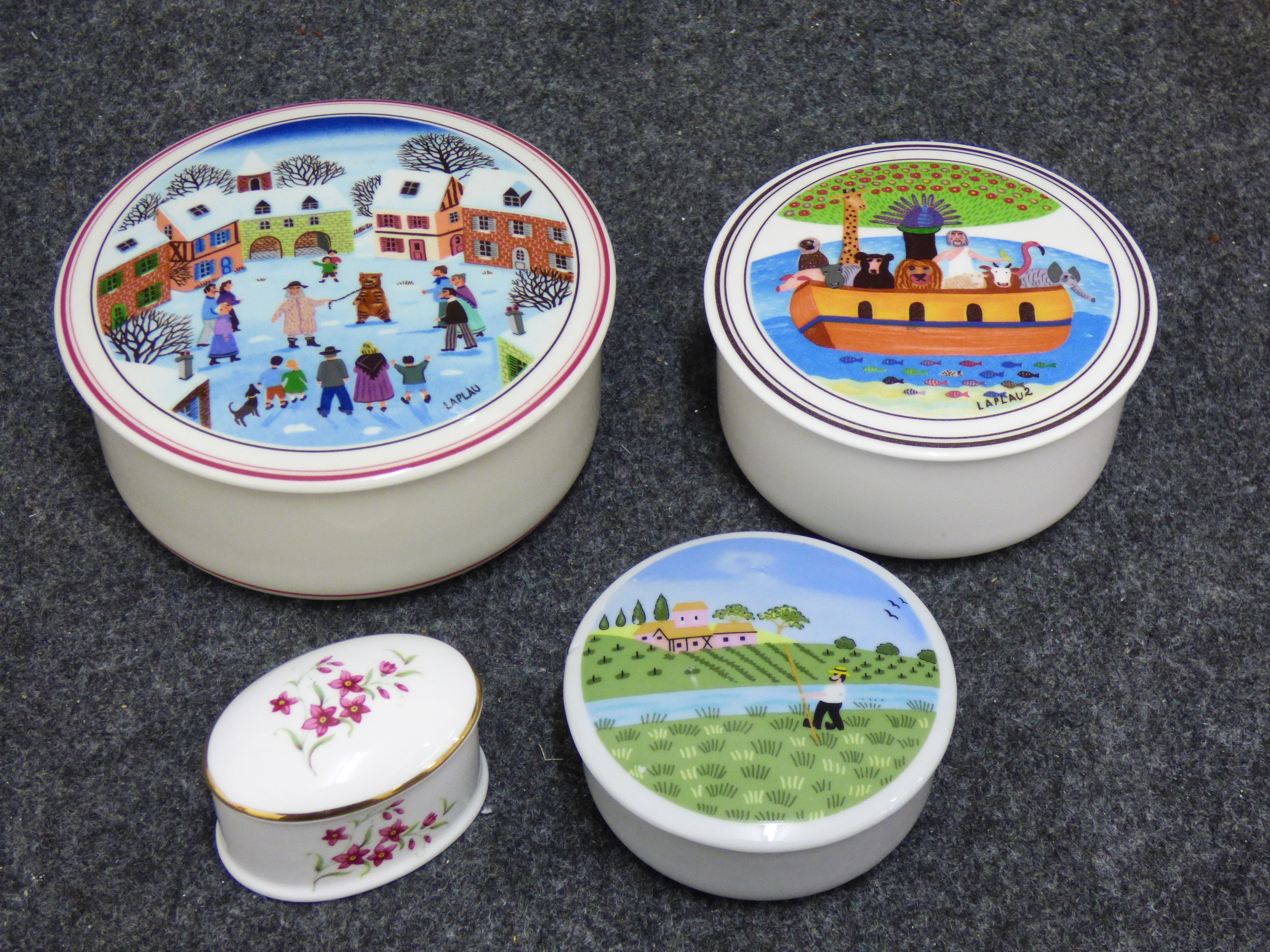 A collection of ceramic trinket boxes of varying forms and sizes. The group includes two circular vitro-porcelain examples by Villeroy and Boch from the Naif series, featuring folk-art style transfer-printed designs by Gerard Laplau. One lid depicts a winter village scene with a dancing bear and various figures, with the base bearing the printed mark Villeroy and Boch, Naif Christmas, Vitro-Porcelaine, Luxembourg. The second lid features a Noahs Ark illustration, with the base bearing the printed mark Villeroy and Boch, 1748, Luxembourg. The collection also includes an oval fine bone china box featuring pink floral sprays and a gilt-edged rim; the base bears the printed mark Royal Grafton, Fine Bone China, Made in England. A further smaller circular porcelain box is decorated with a naive rural landscape depicting a harvester. Largest 13cm Dia