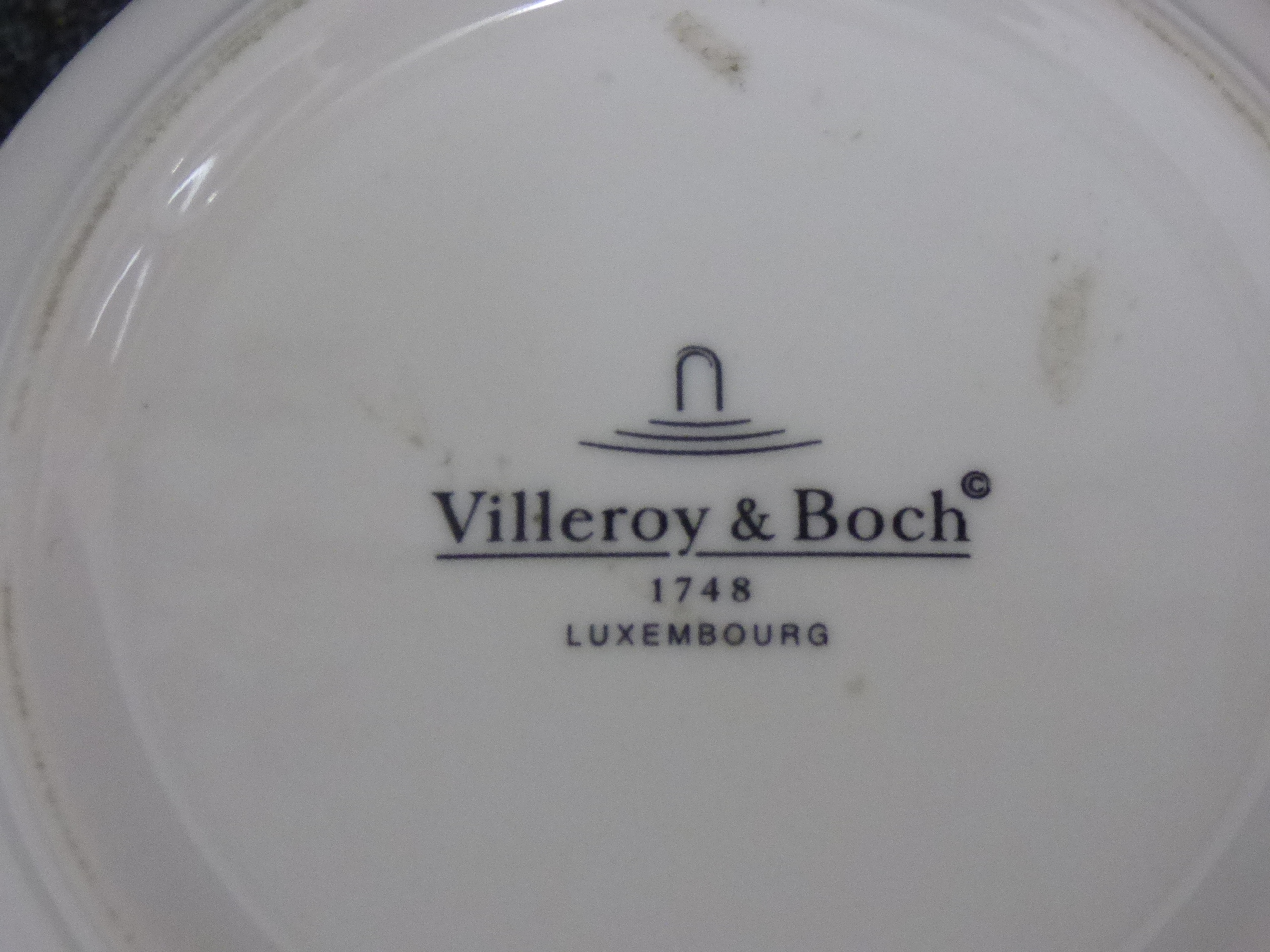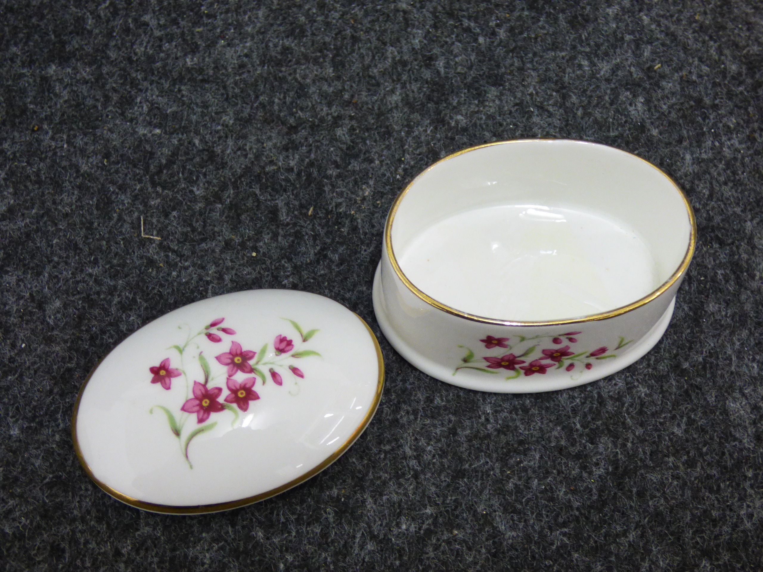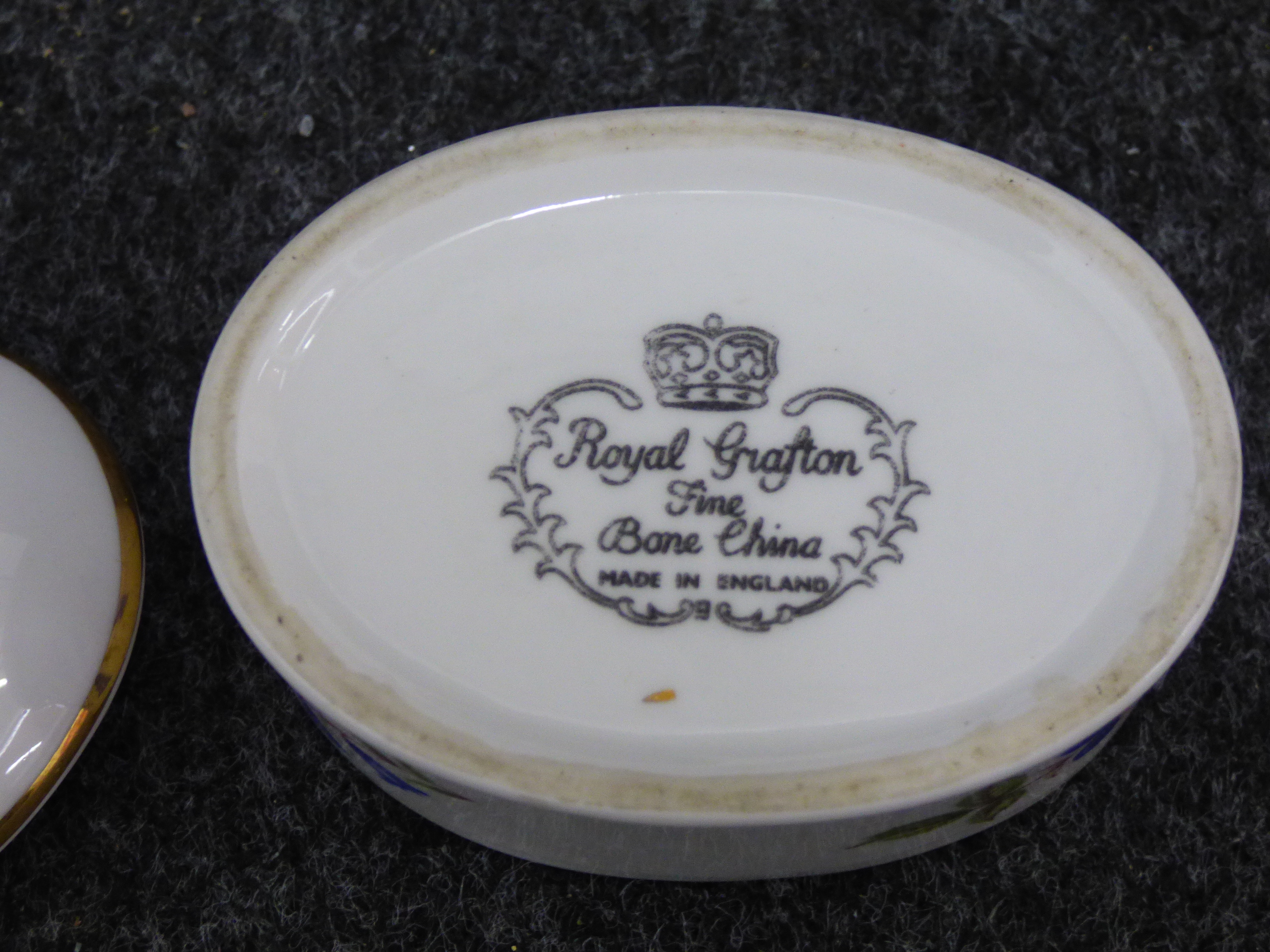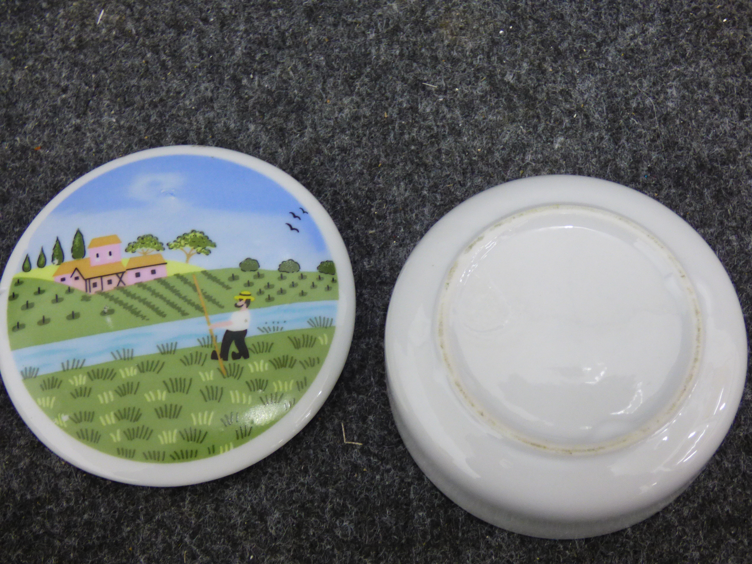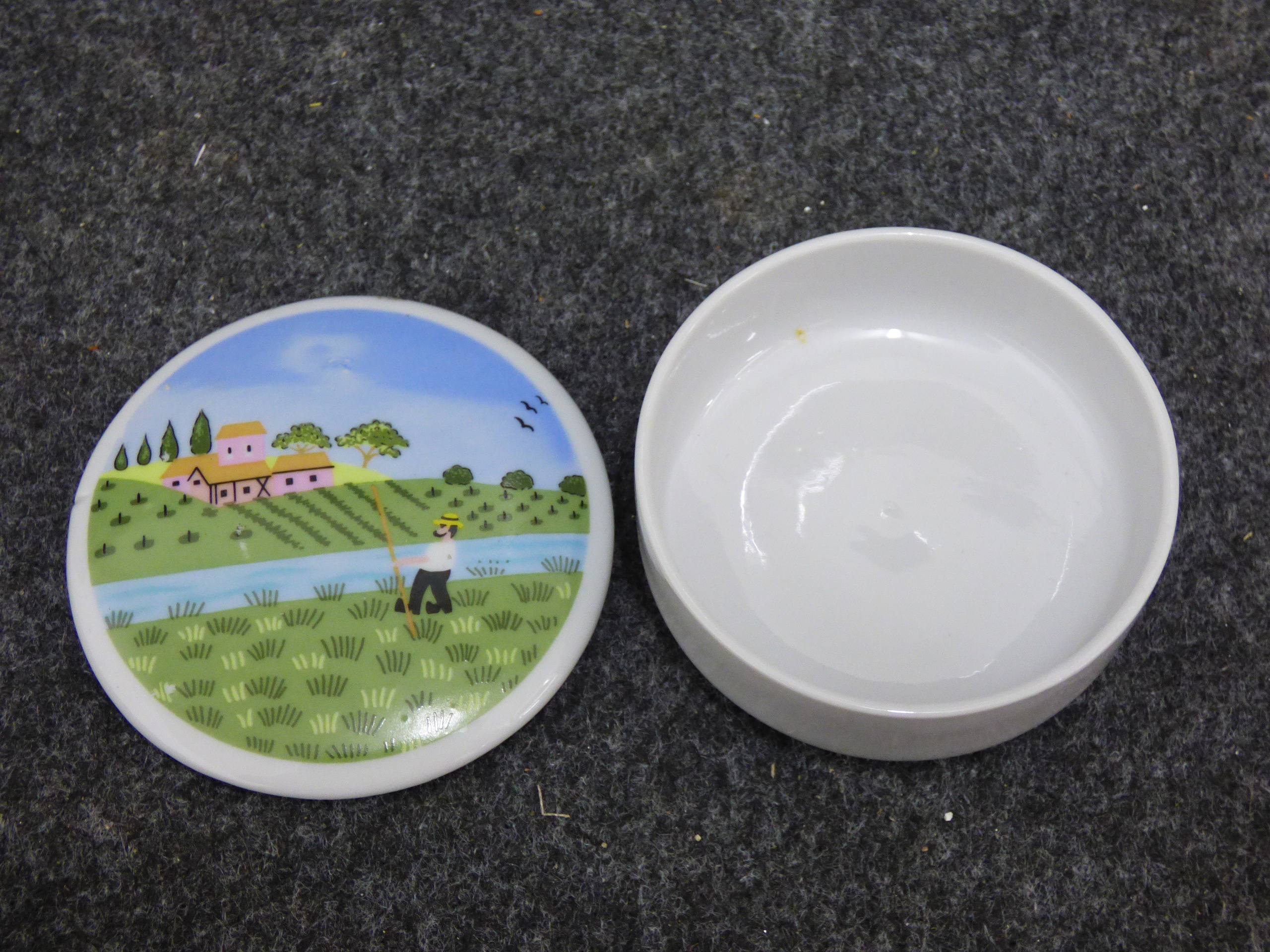 A collection of ceramic trinket boxes of varying forms and sizes. The group includes two circular vitro-porcelain examples by Villeroy and Boch from the Naif series, featuring folk-art style transfer-printed designs by Gerard Laplau. One lid depicts a winter village scene with a dancing bear and various figures, with the base bearing the printed mark Villeroy and Boch, Naif Christmas, Vitro-Porcelaine, Luxembourg. The second lid features a Noahs Ark illustration, with the base bearing the printed mark Villeroy and Boch, 1748, Luxembourg. The collection also includes an oval fine bone china box featuring pink floral sprays and a gilt-edged rim; the base bears the printed mark Royal Grafton, Fine Bone China, Made in England. A further smaller circular porcelain box is decorated with a naive rural landscape depicting a harvester. Largest 13cm Dia