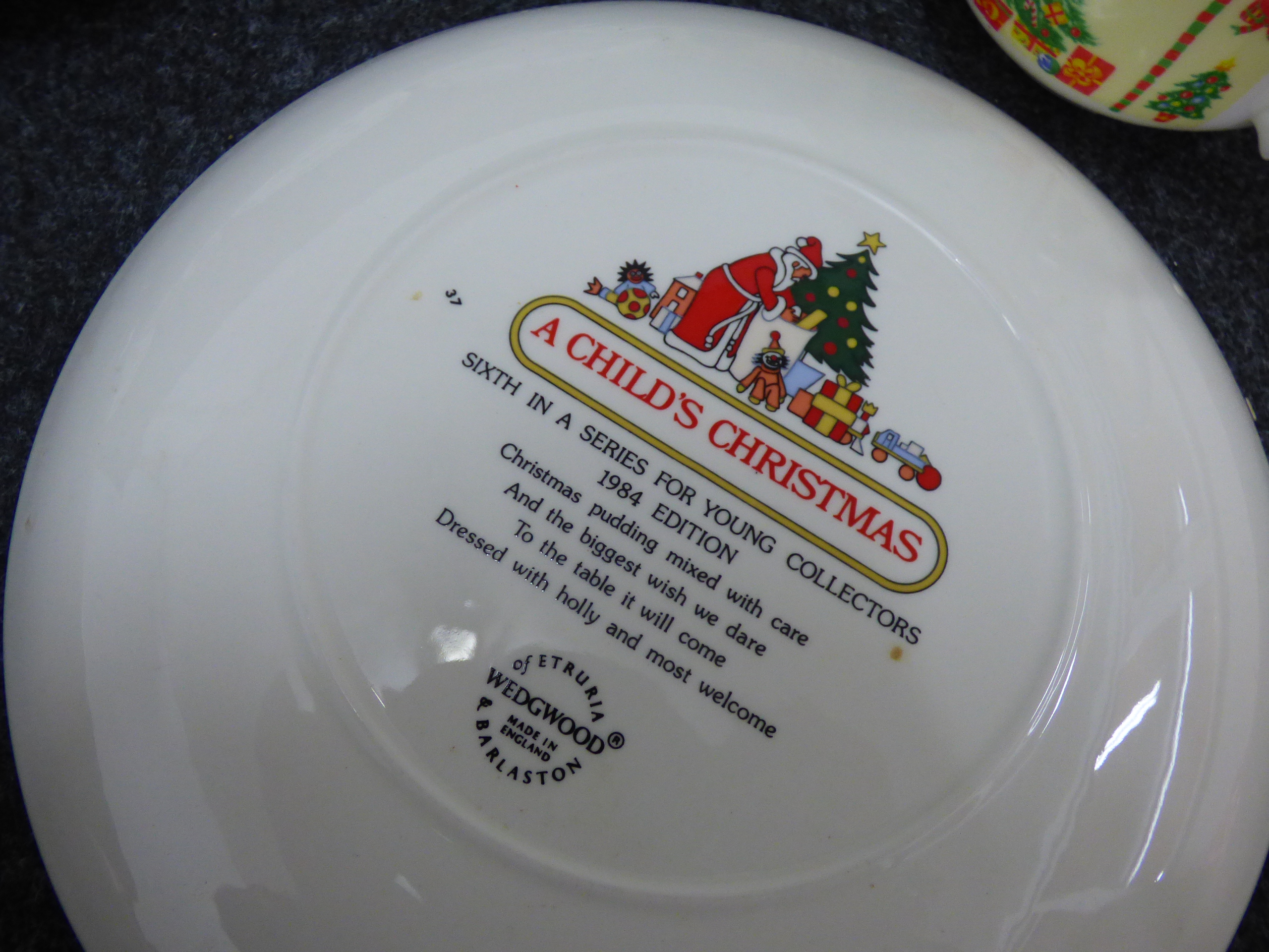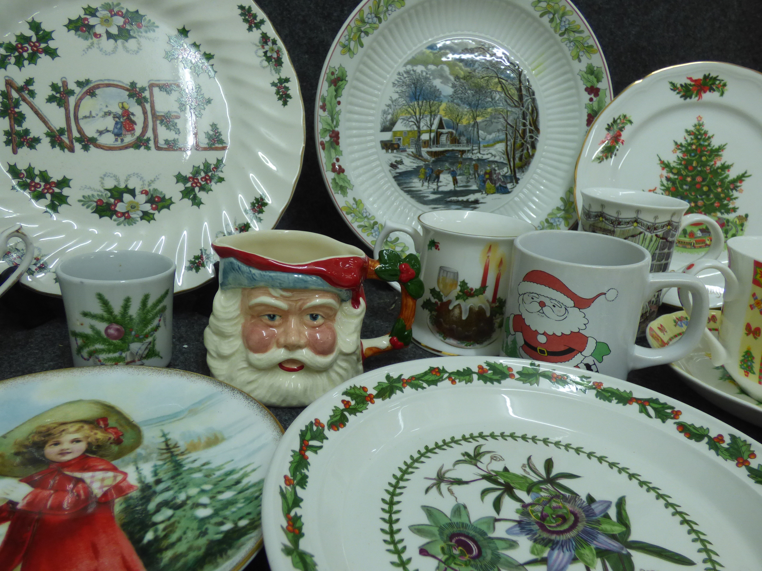 A collection of multi-coloured Christmas-themed ceramic items including decorative plates, mugs, and a Santa Claus jug by makers such as Wedgwood, Portmeirion, and Sylvac.