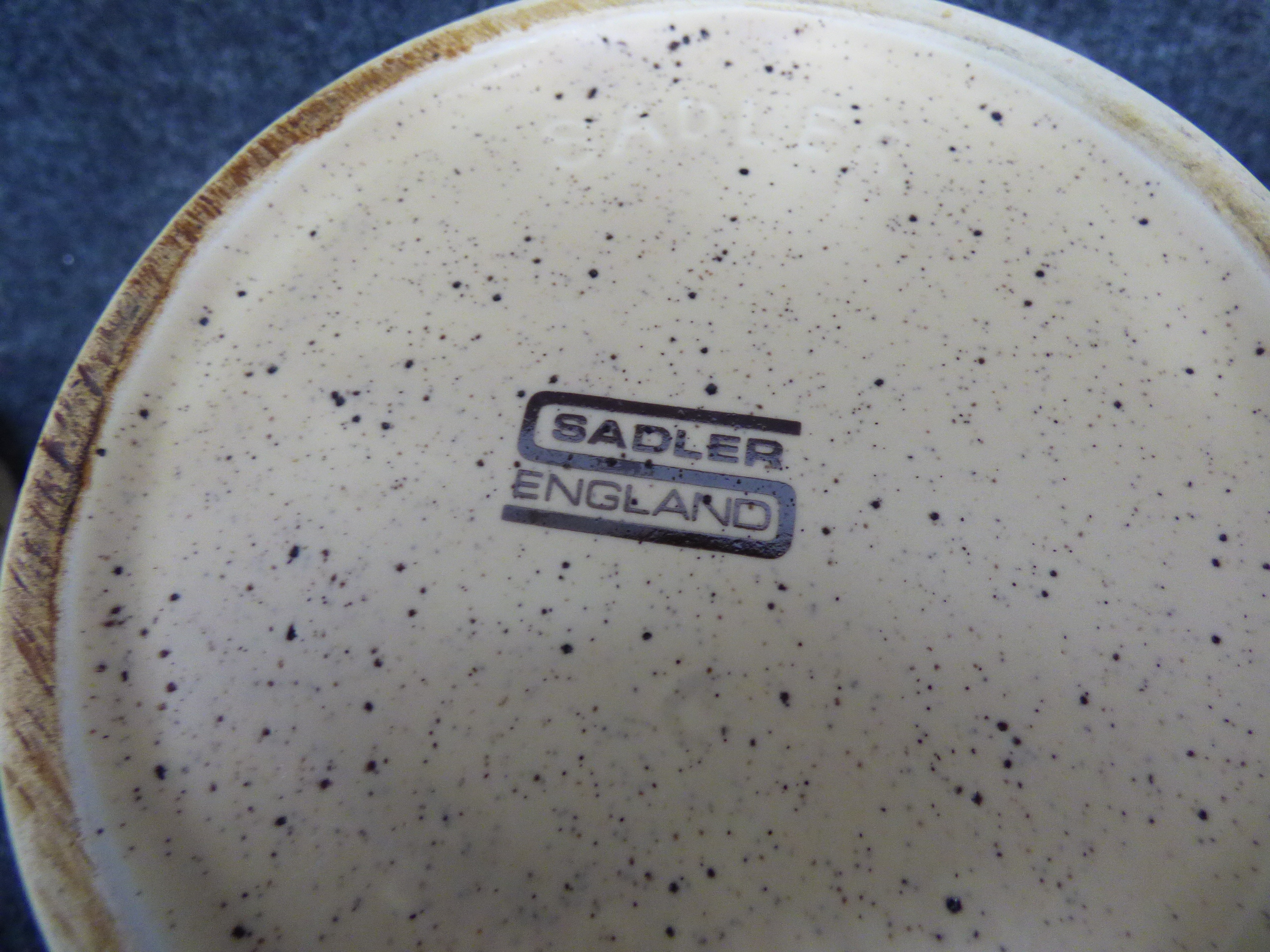 A collection of ceramic kitchenware and silver-toned metalware including a Sadler England floral teapot, an Ashdale Pottery cottage-themed milk jug, several mixing bowls, and an assortment of silver-toned spoons and commemorative napkin rings for the 1984 birth of H.R.H. Prince Henry.