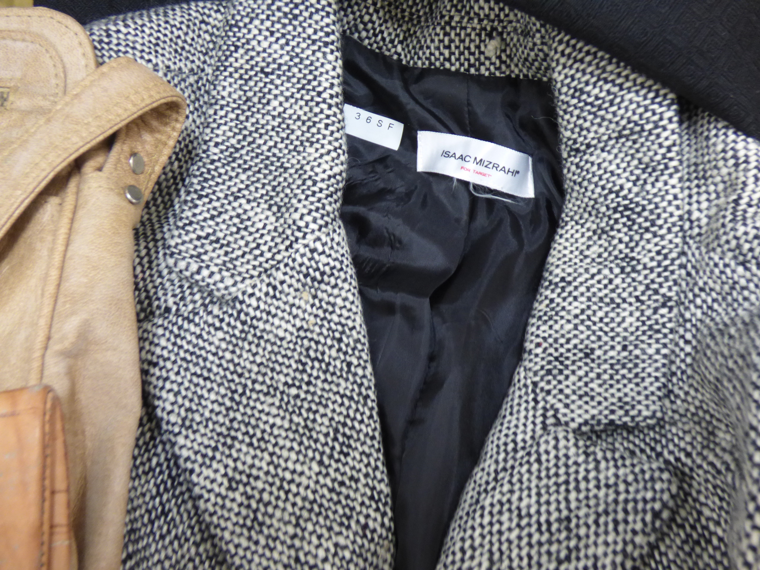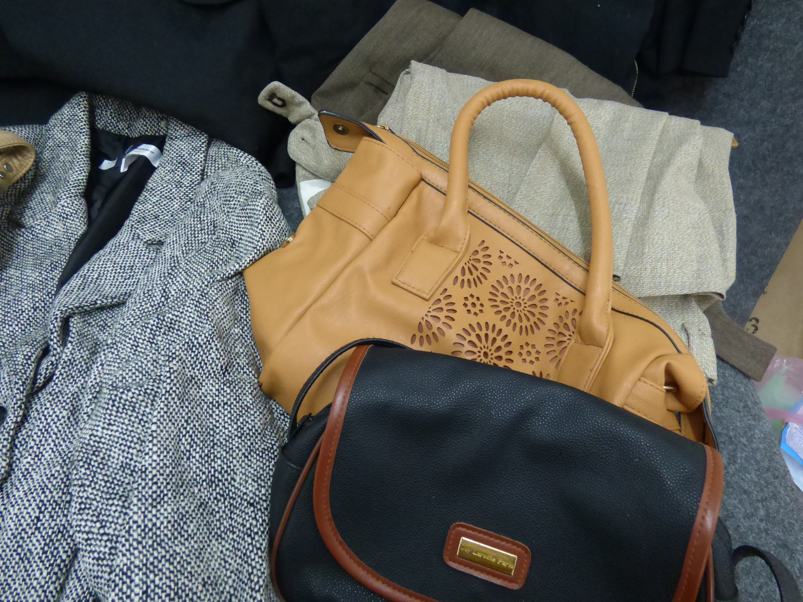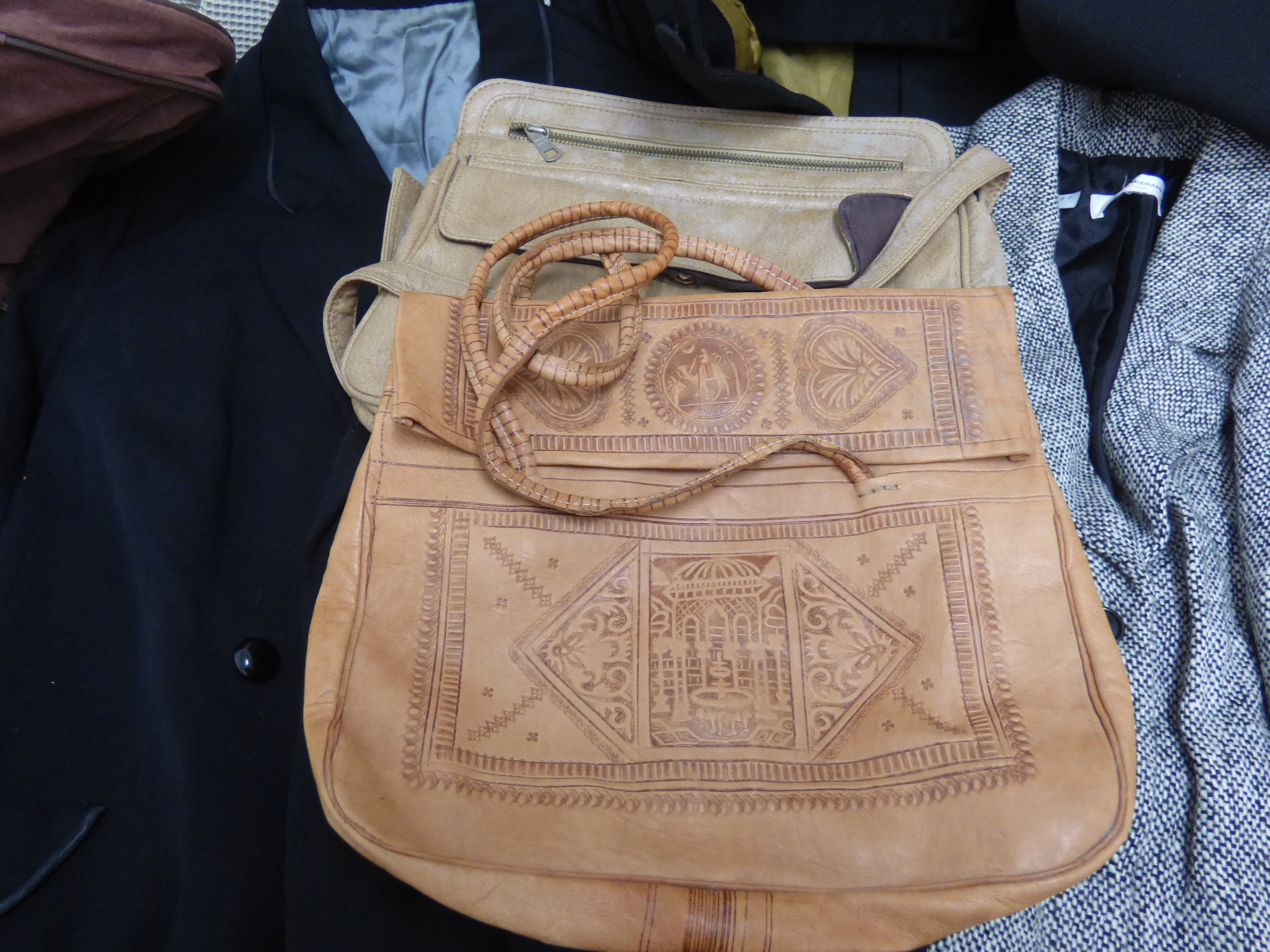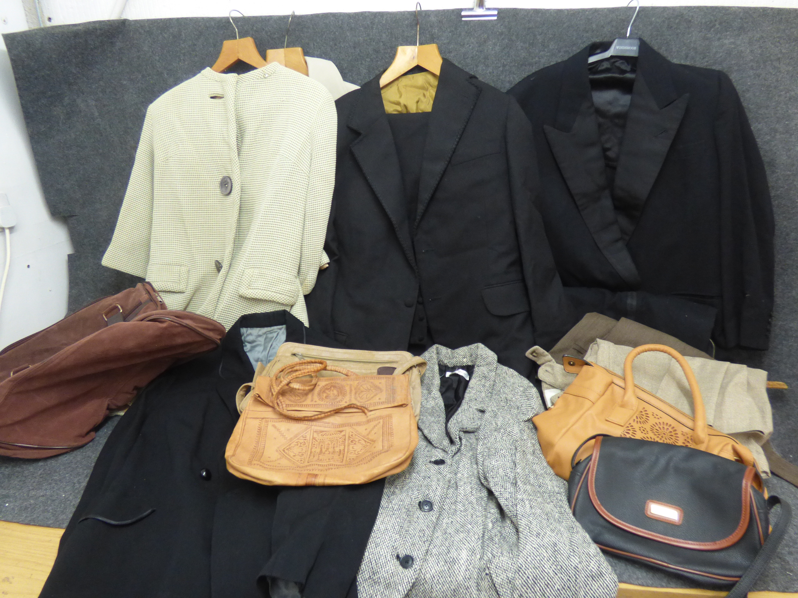 An assortment of men’s and women’s clothing and accessories. The collection includes a black and white speckled textured coat by Isaac Mizrahi for Target, featuring a white collar label and size tag marked 36 SF. Also present is a beige lightweight zip-up jacket with a stand-up collar, bearing the embroidered Aldon label to the interior neck. Formal wear comprises a men’s black evening suit including a blazer with silk-effect peak lapels and matching trousers; A vintage light green bracelet-sleeved jacket with a heavy basketweave texture and large purple buttons, alongside several black coats and blazers of varying styles and lengths. The accessory selection features a black textured crossbody bag with tan trim and a gold-tone Guy Laroche Paris plaque. A tan leather shoulder bag is decorated with intricate tooled architectural and animal motifs and a braided strap. The lot also contains a tan synthetic tote bag with laser-cut floral patterns and a large brown fabric travel holdall with a zippered closure.
