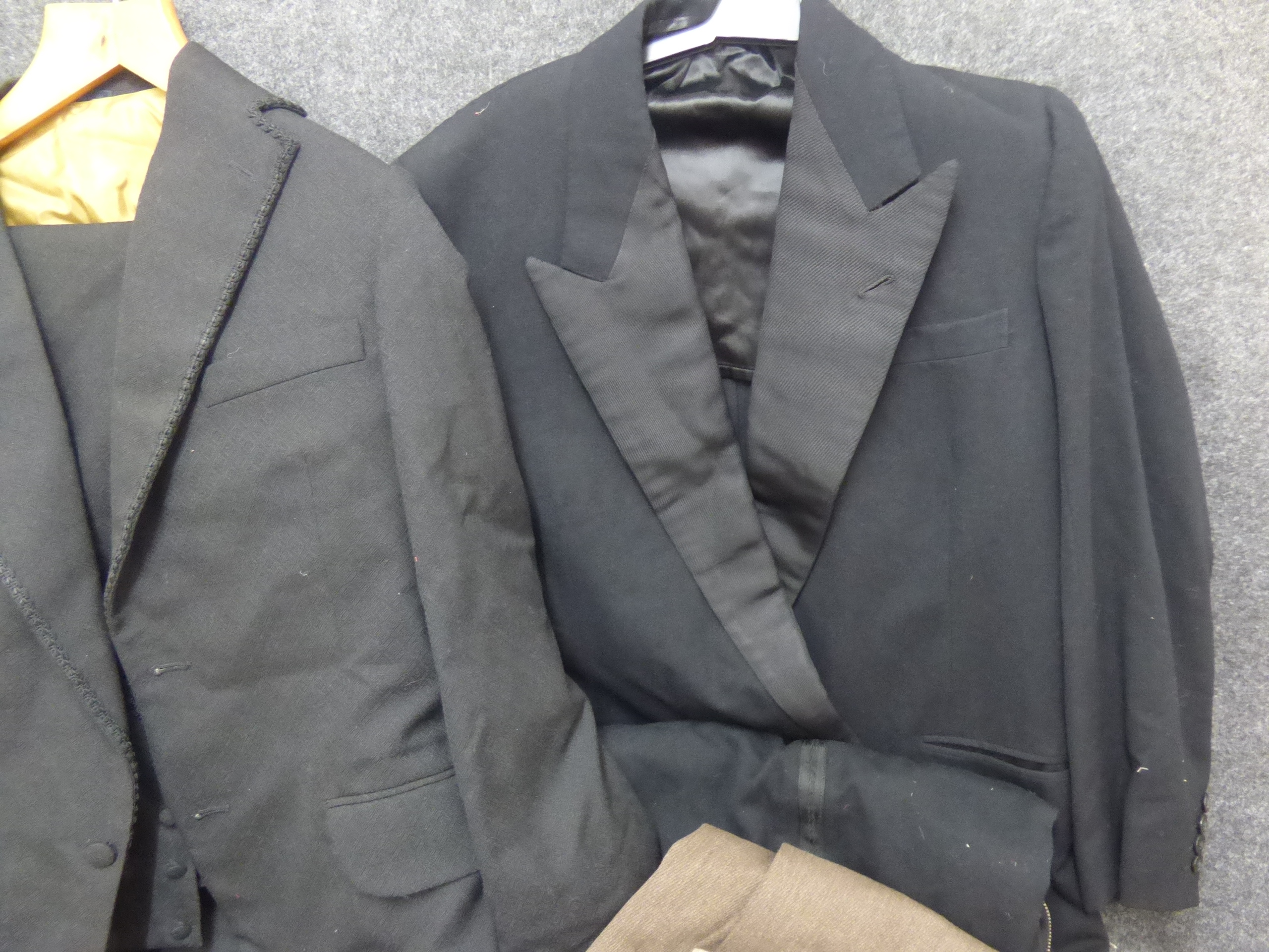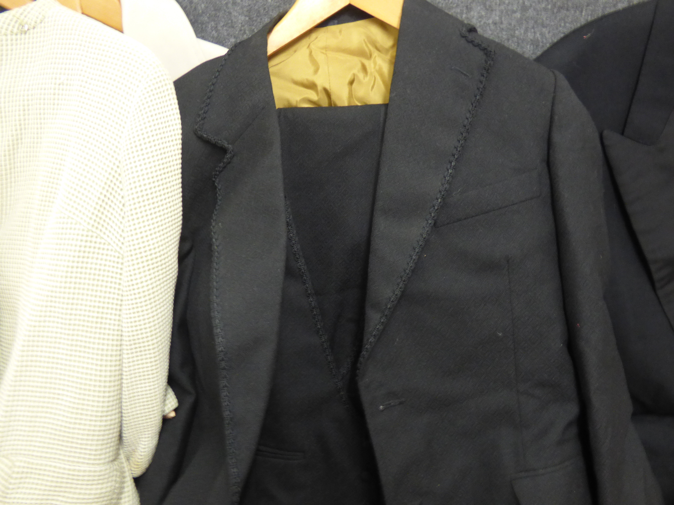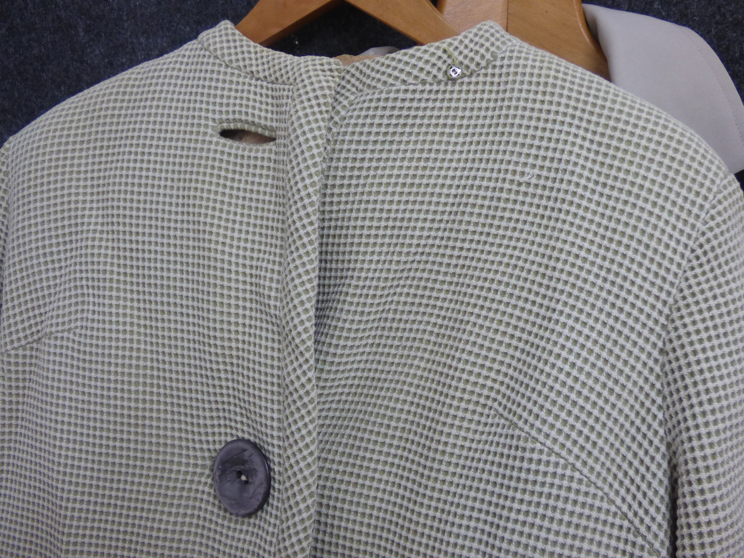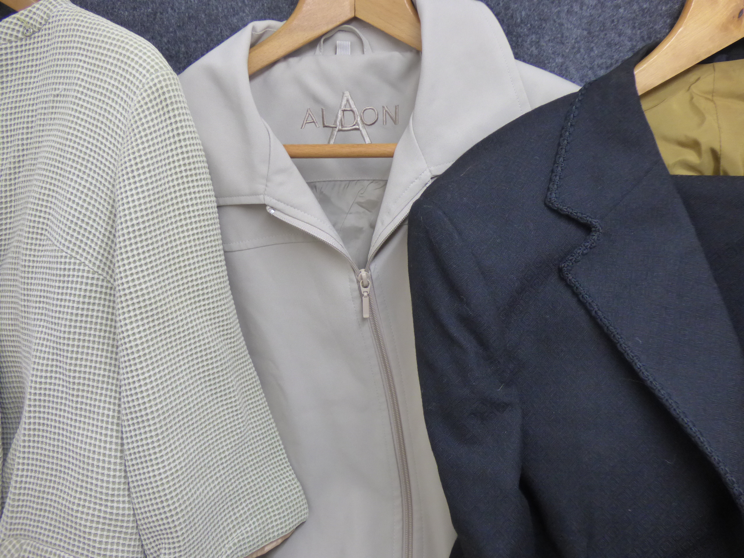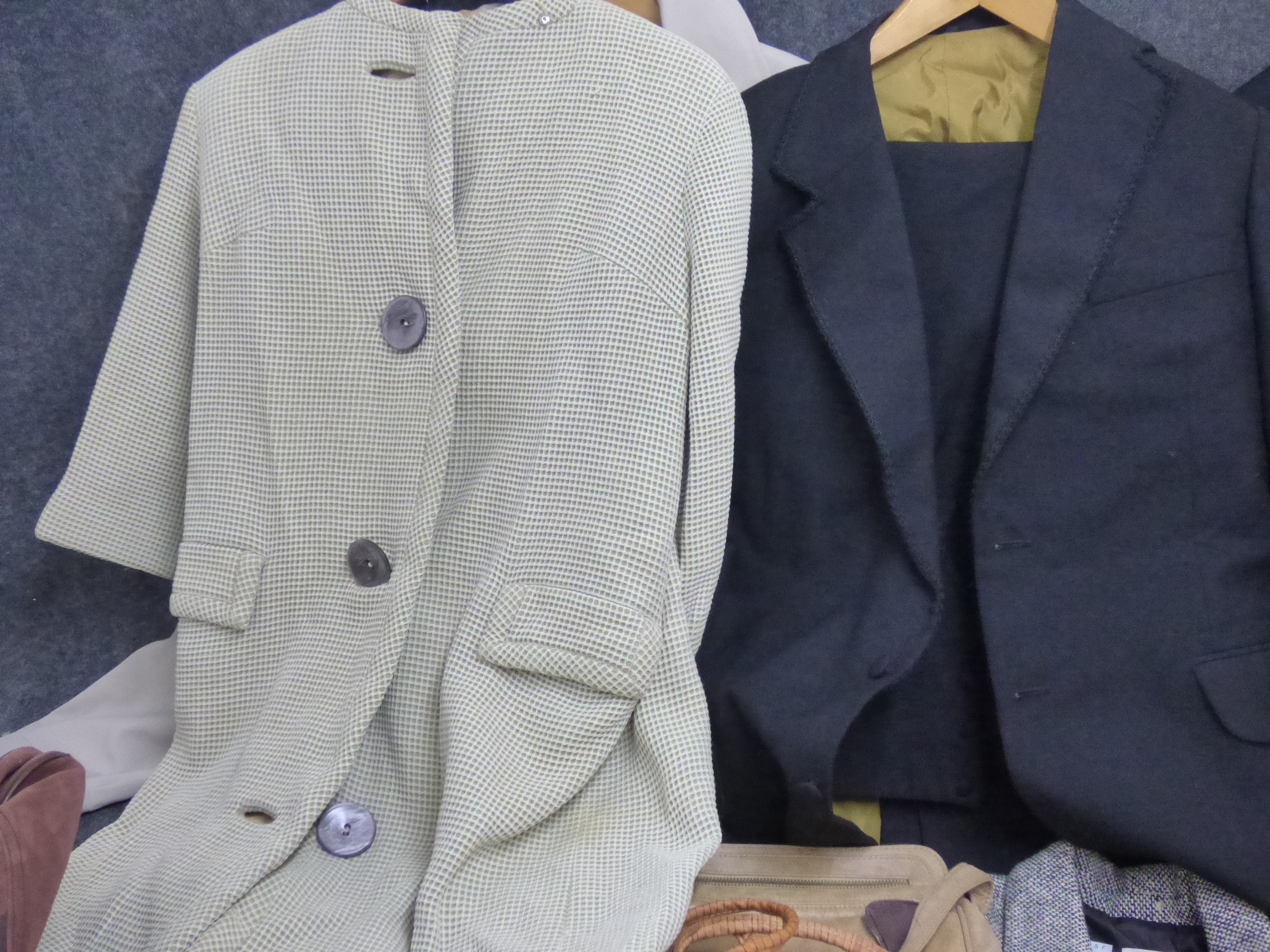 An assortment of men’s and women’s clothing and accessories. The collection includes a black and white speckled textured coat by Isaac Mizrahi for Target, featuring a white collar label and size tag marked 36 SF. Also present is a beige lightweight zip-up jacket with a stand-up collar, bearing the embroidered Aldon label to the interior neck. Formal wear comprises a men’s black evening suit including a blazer with silk-effect peak lapels and matching trousers; A vintage light green bracelet-sleeved jacket with a heavy basketweave texture and large purple buttons, alongside several black coats and blazers of varying styles and lengths. The accessory selection features a black textured crossbody bag with tan trim and a gold-tone Guy Laroche Paris plaque. A tan leather shoulder bag is decorated with intricate tooled architectural and animal motifs and a braided strap. The lot also contains a tan synthetic tote bag with laser-cut floral patterns and a large brown fabric travel holdall with a zippered closure.
