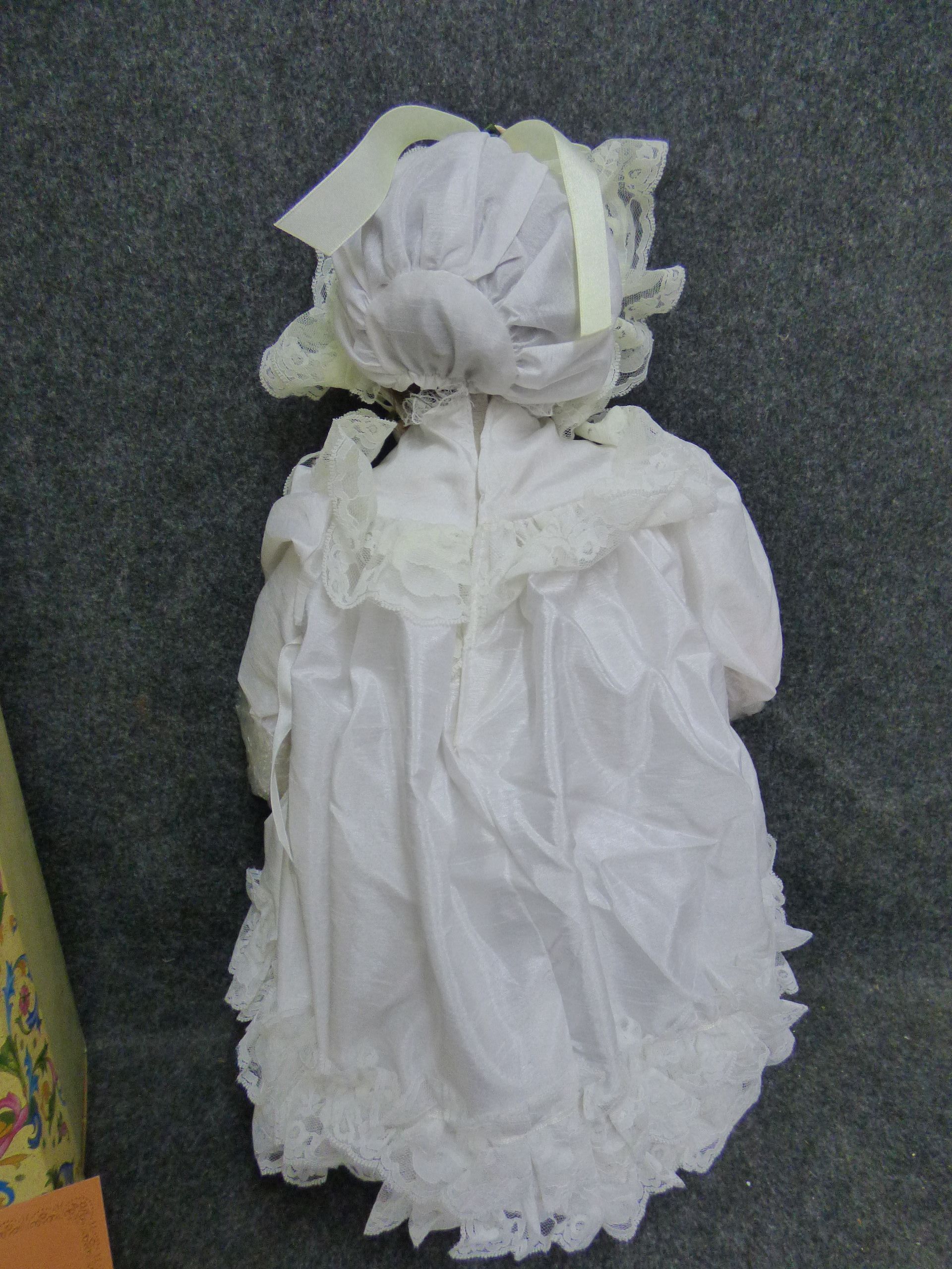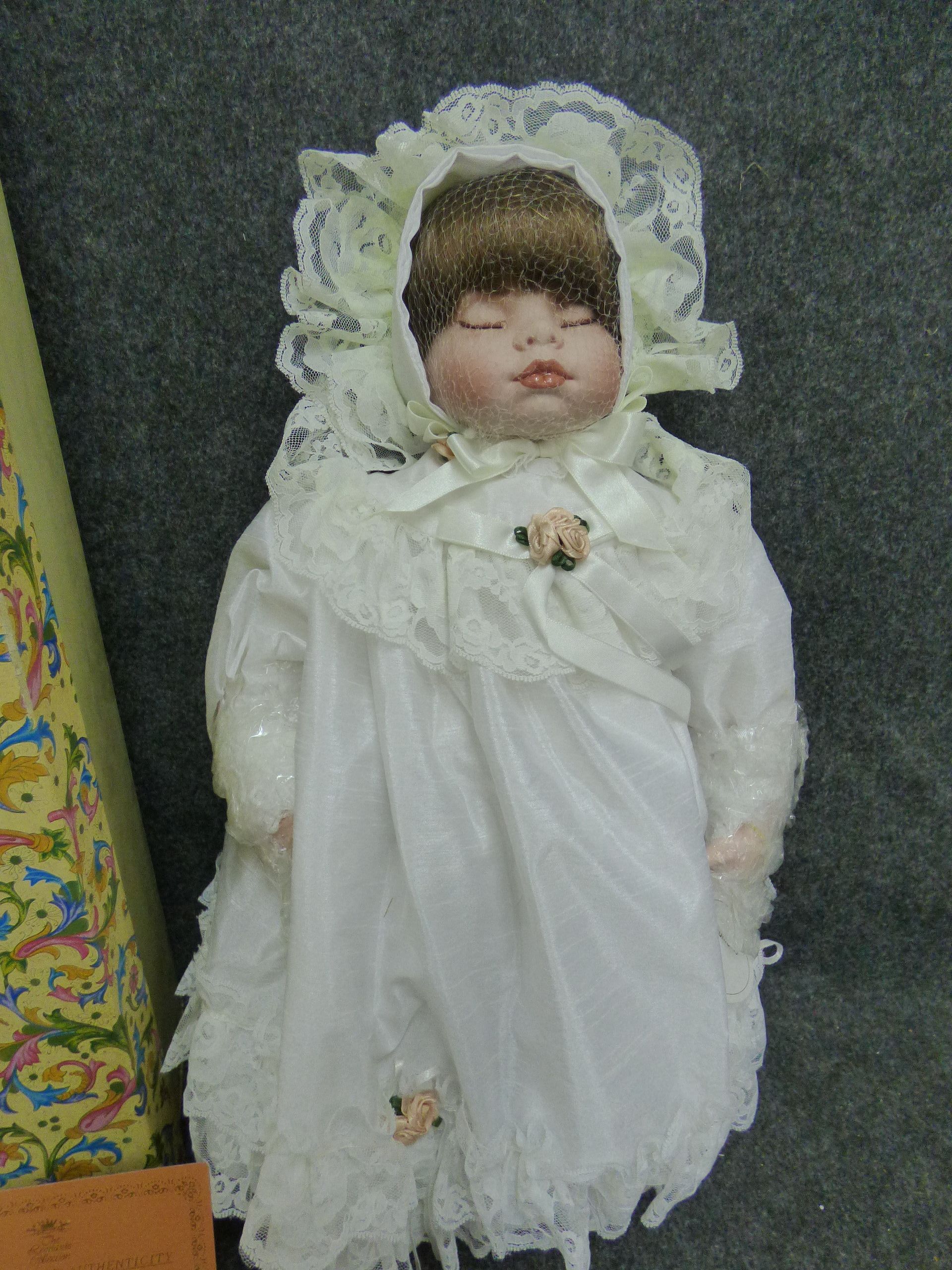 A white porcelain baby doll from The Leonardo Collection featuring a lace-trimmed gown and bonnet, accompanied by its original floral-patterned box, a certificate of authenticity, and a 1998 birthday card.